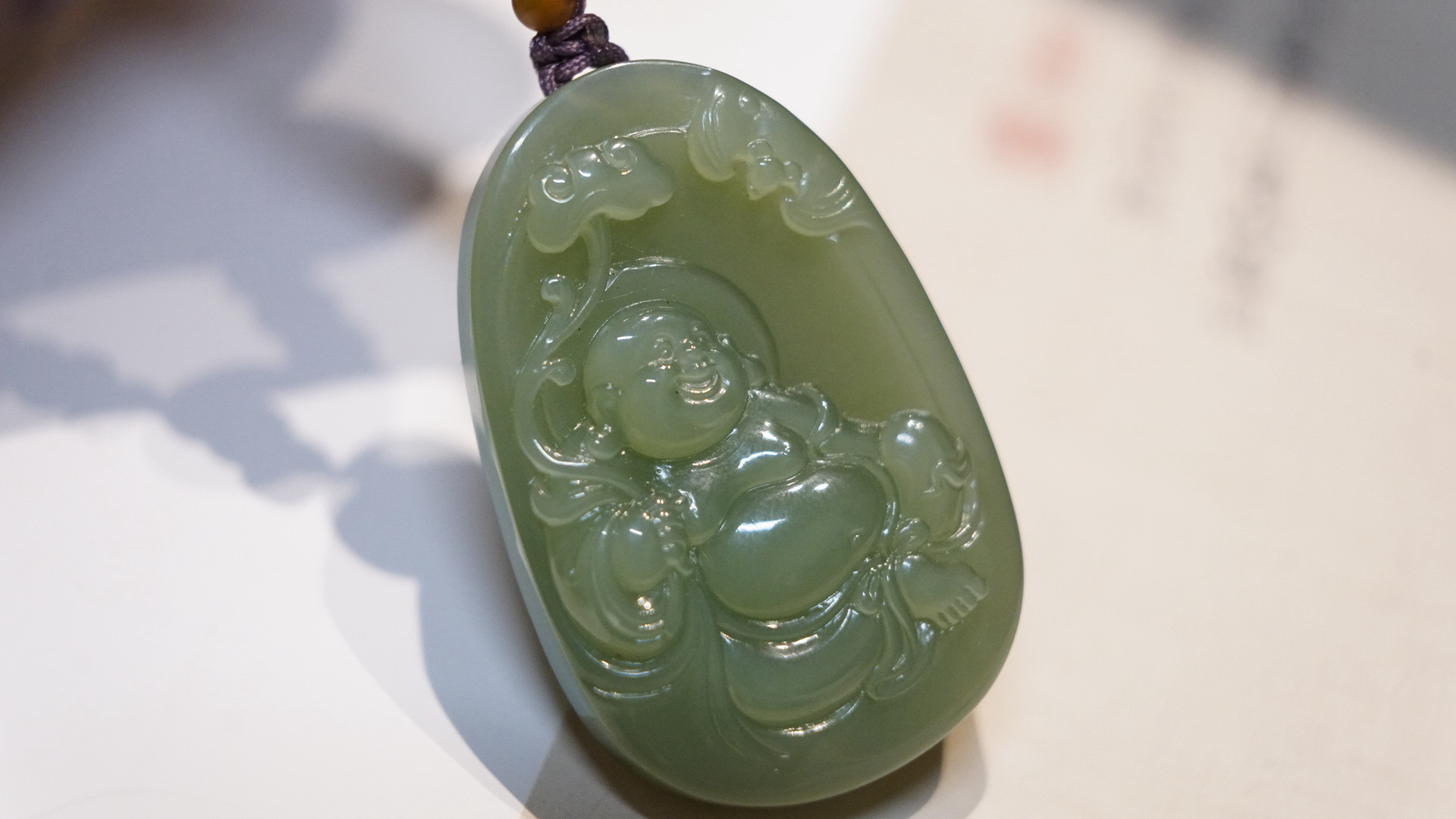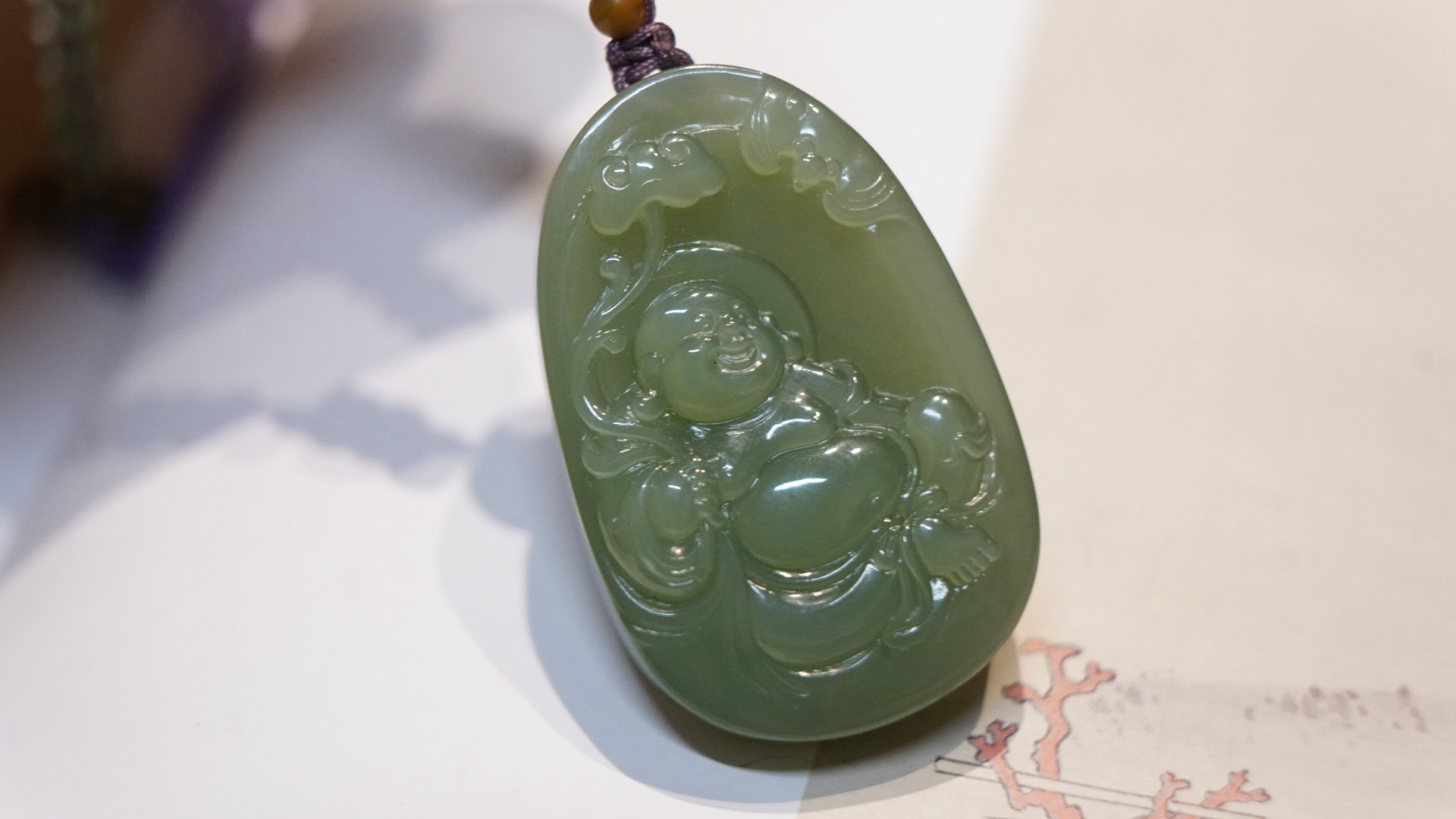 • 主件:主体为粉青碧玉和田玉,雕刻的是弥勒佛(笑佛),上方还有蝙蝠和如意纹饰,寓意“福在眼前”“福气随身”,事事如意。