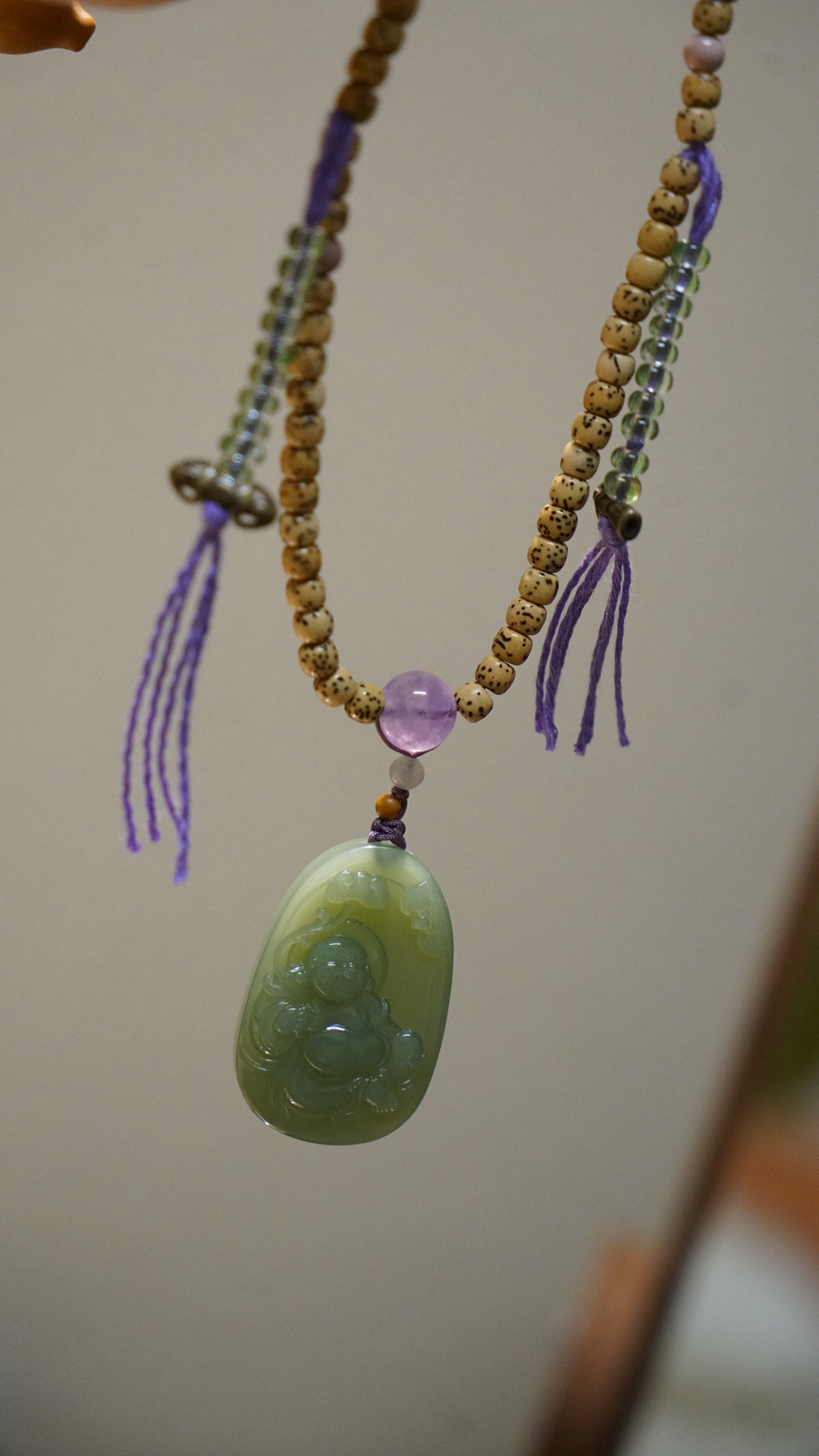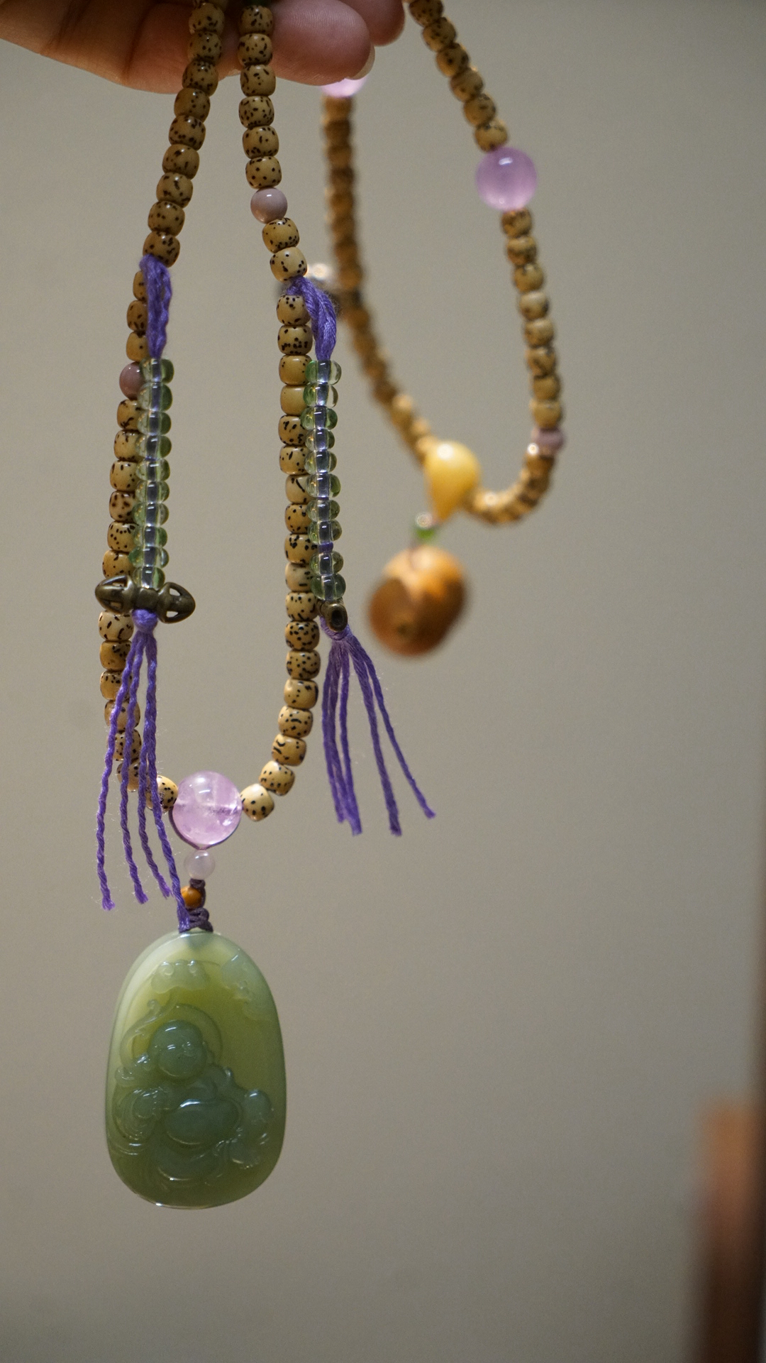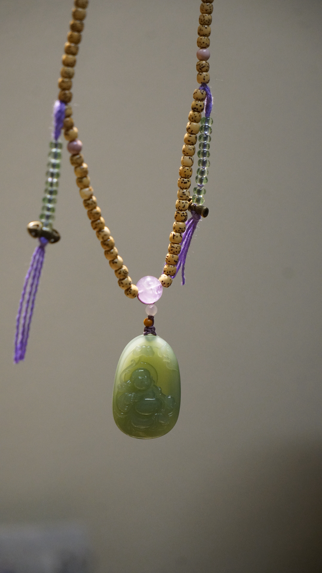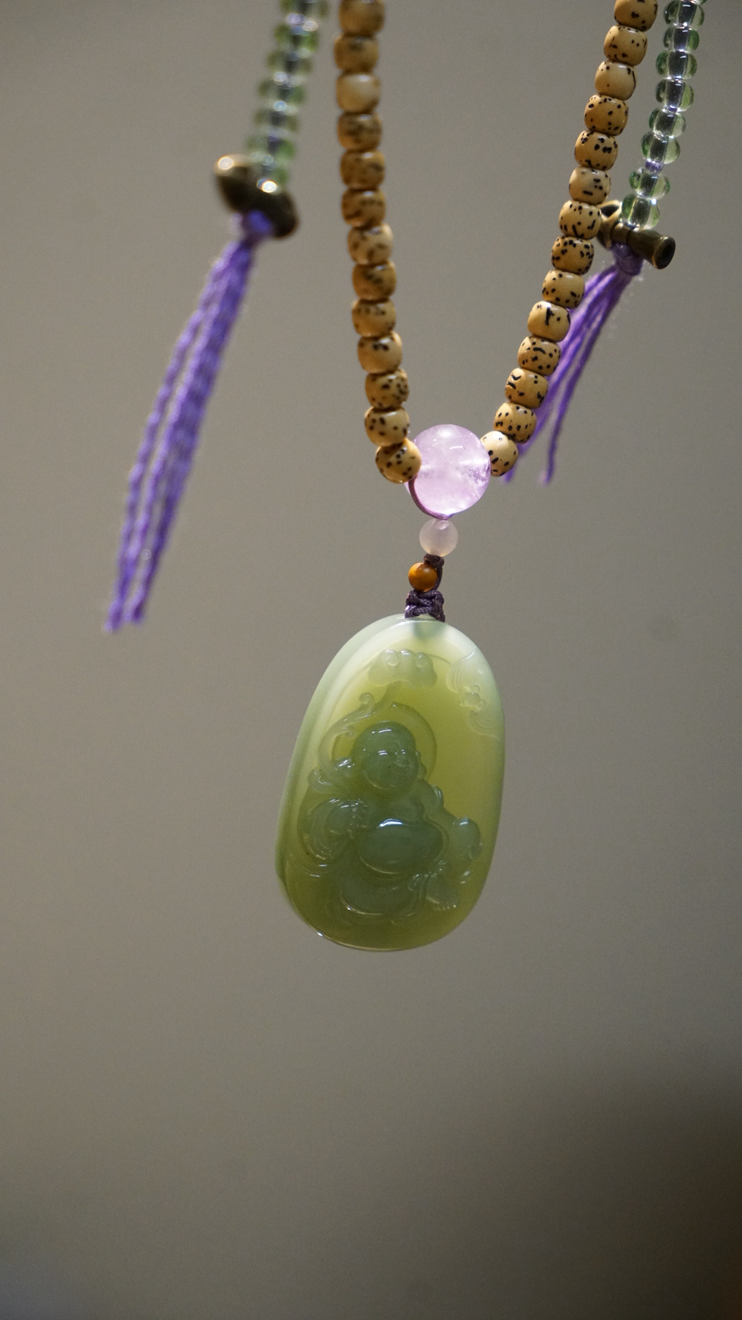 这是一枚和田玉粉青碧玉弥勒佛吊坠,搭配了星月菩提串珠与紫水晶、葫芦、蜜蜡三通等配珠。