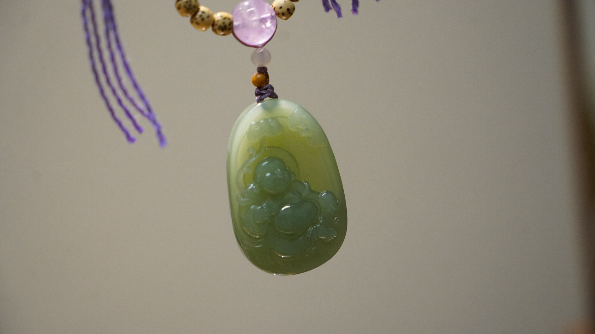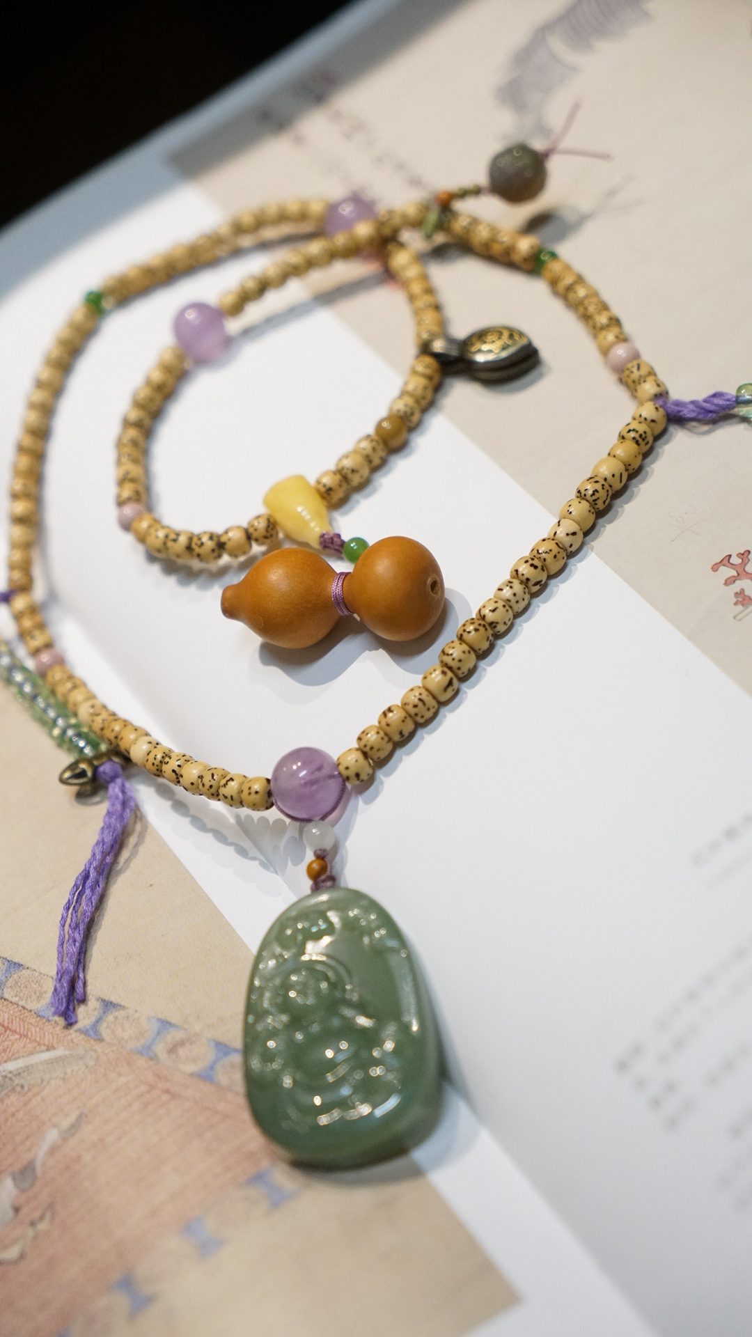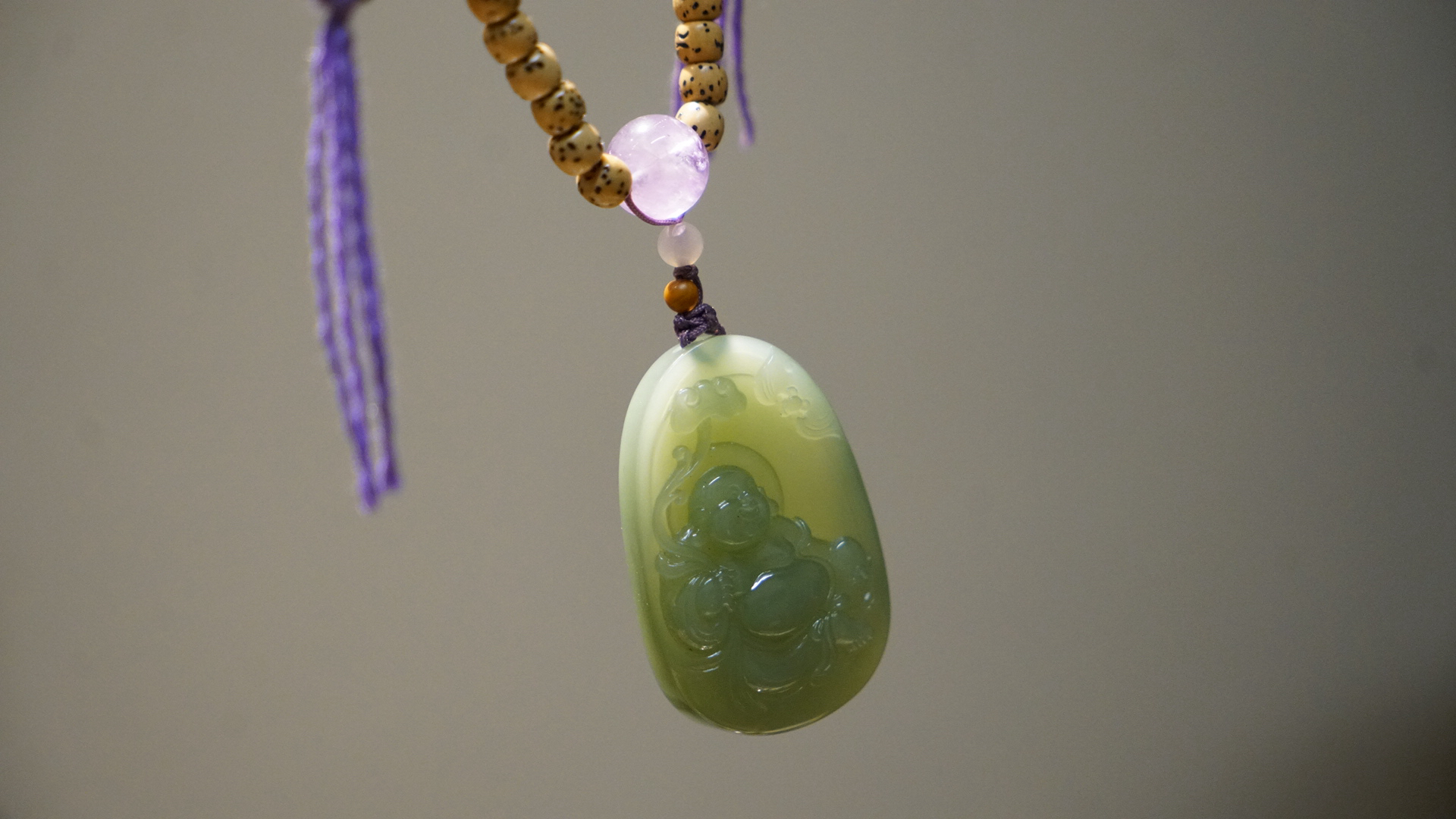 这是一枚和田玉粉青碧玉弥勒佛吊坠,搭配了星月菩提串珠与紫水晶、葫芦、蜜蜡三通等配珠。