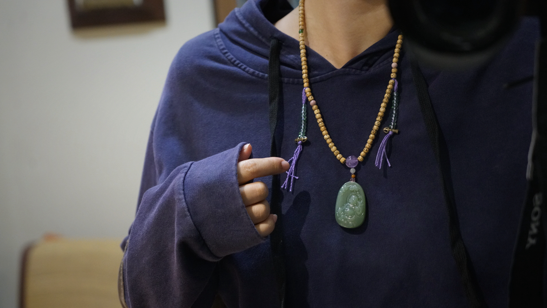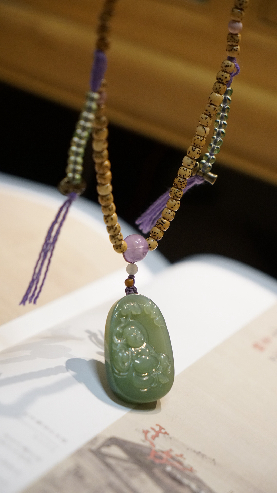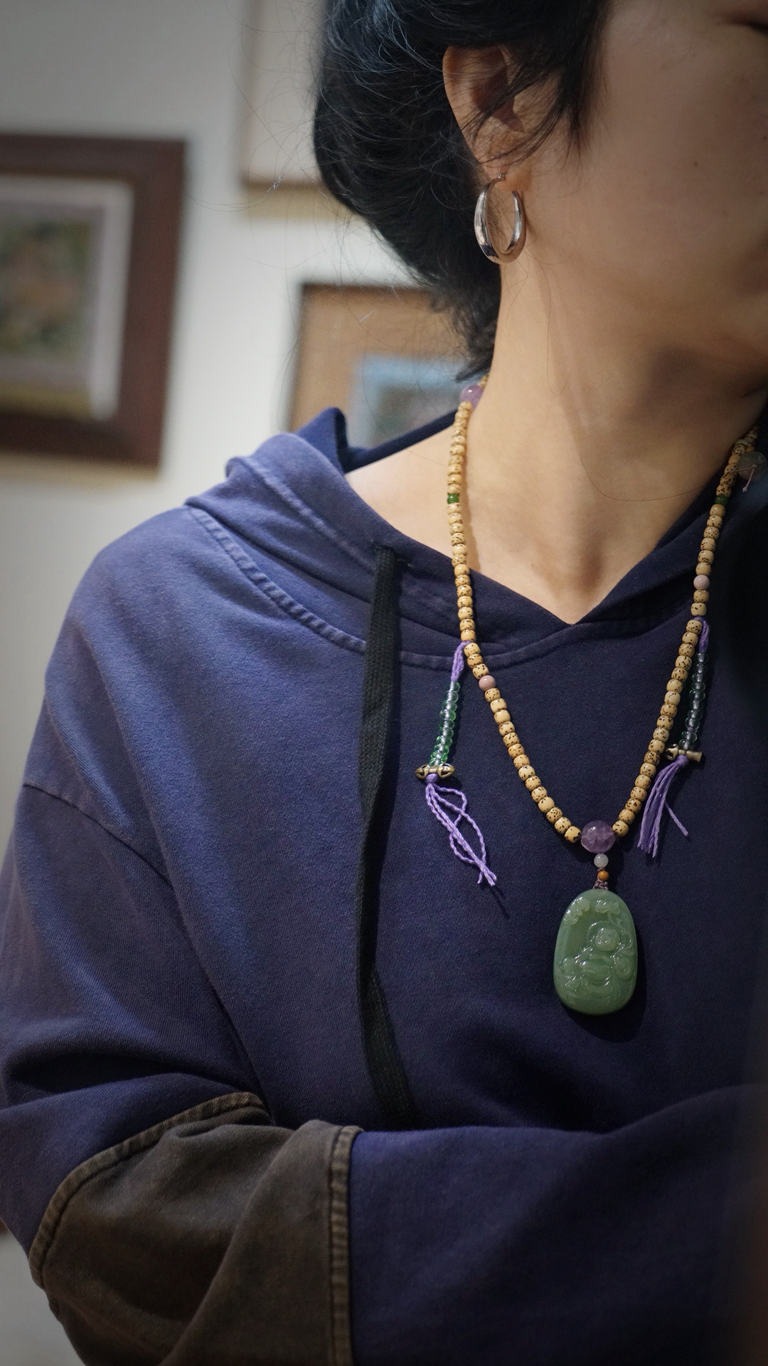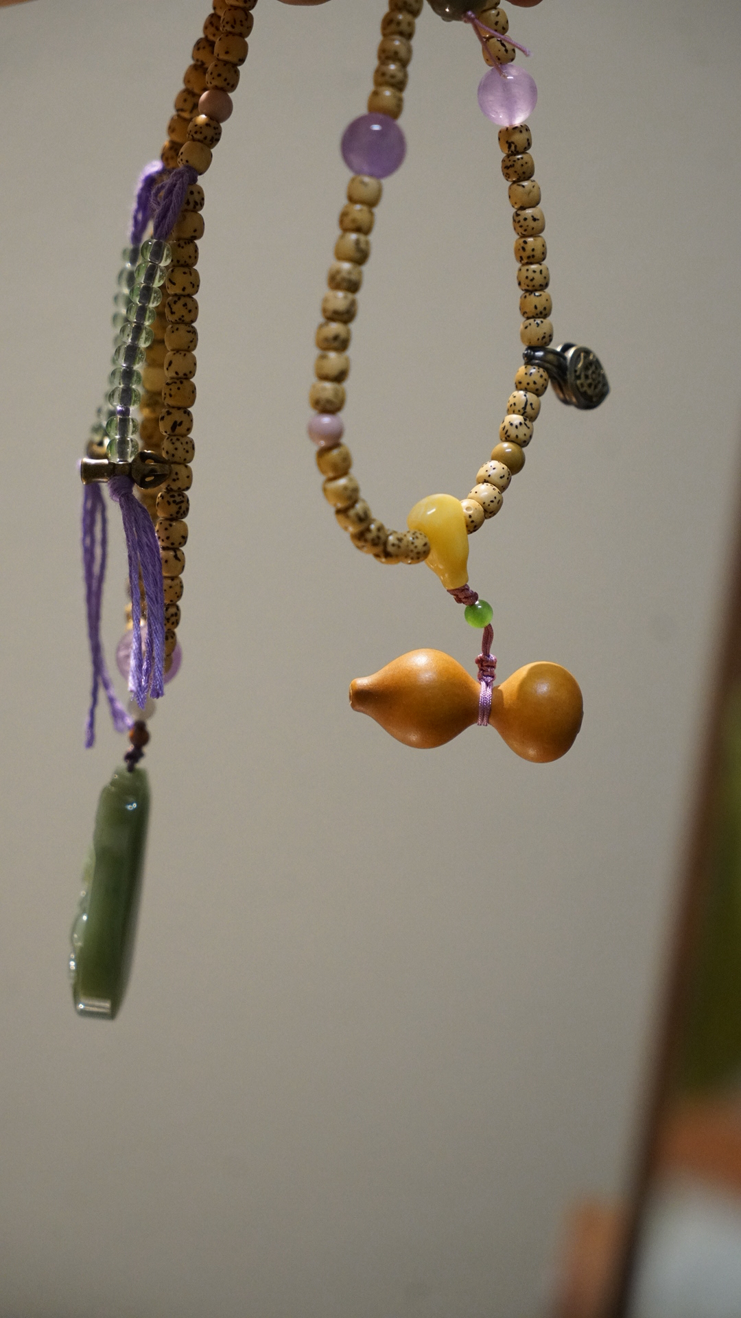 这是一枚和田玉粉青碧玉弥勒佛吊坠,搭配了星月菩提串珠与紫水晶、葫芦、蜜蜡三通等配珠。