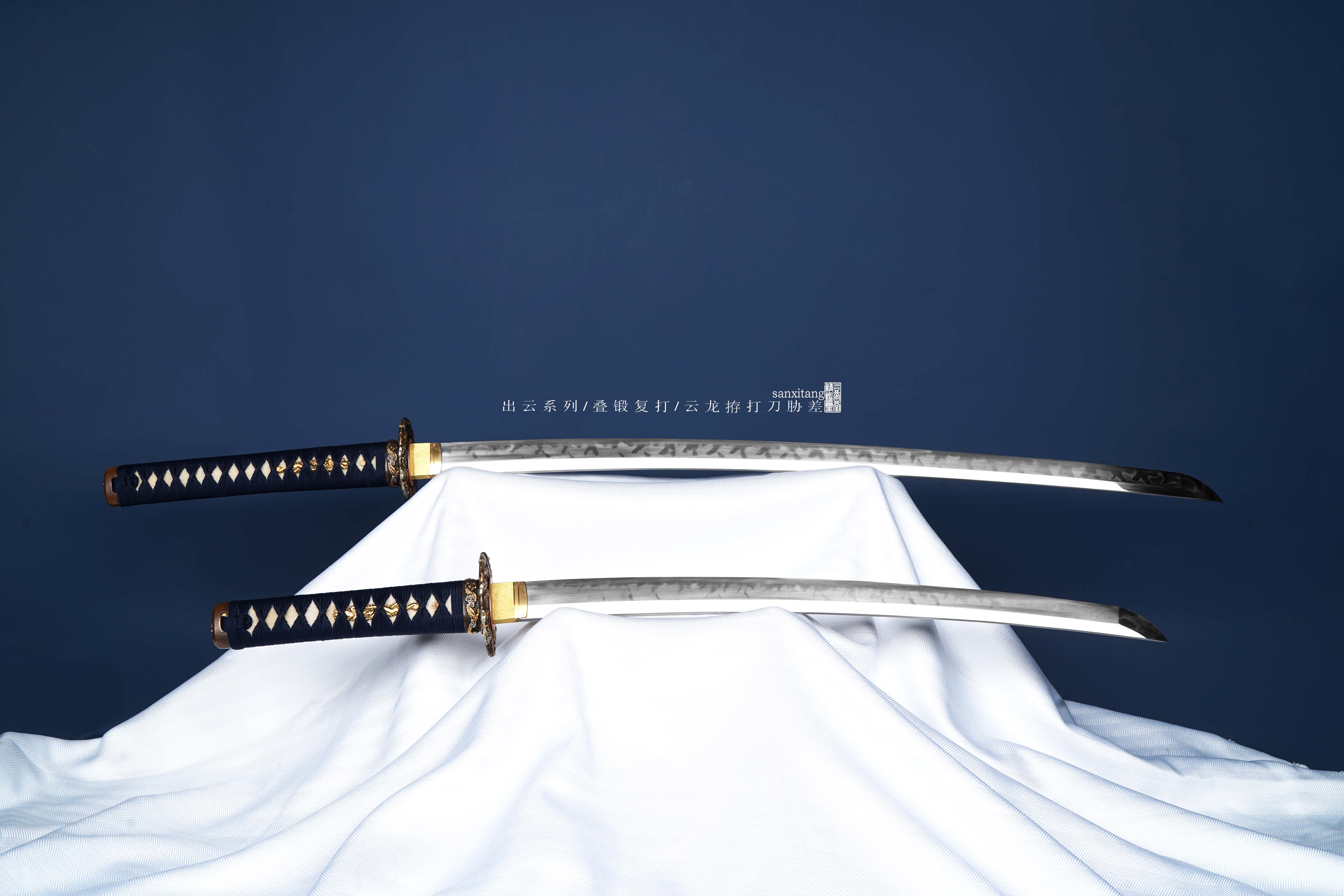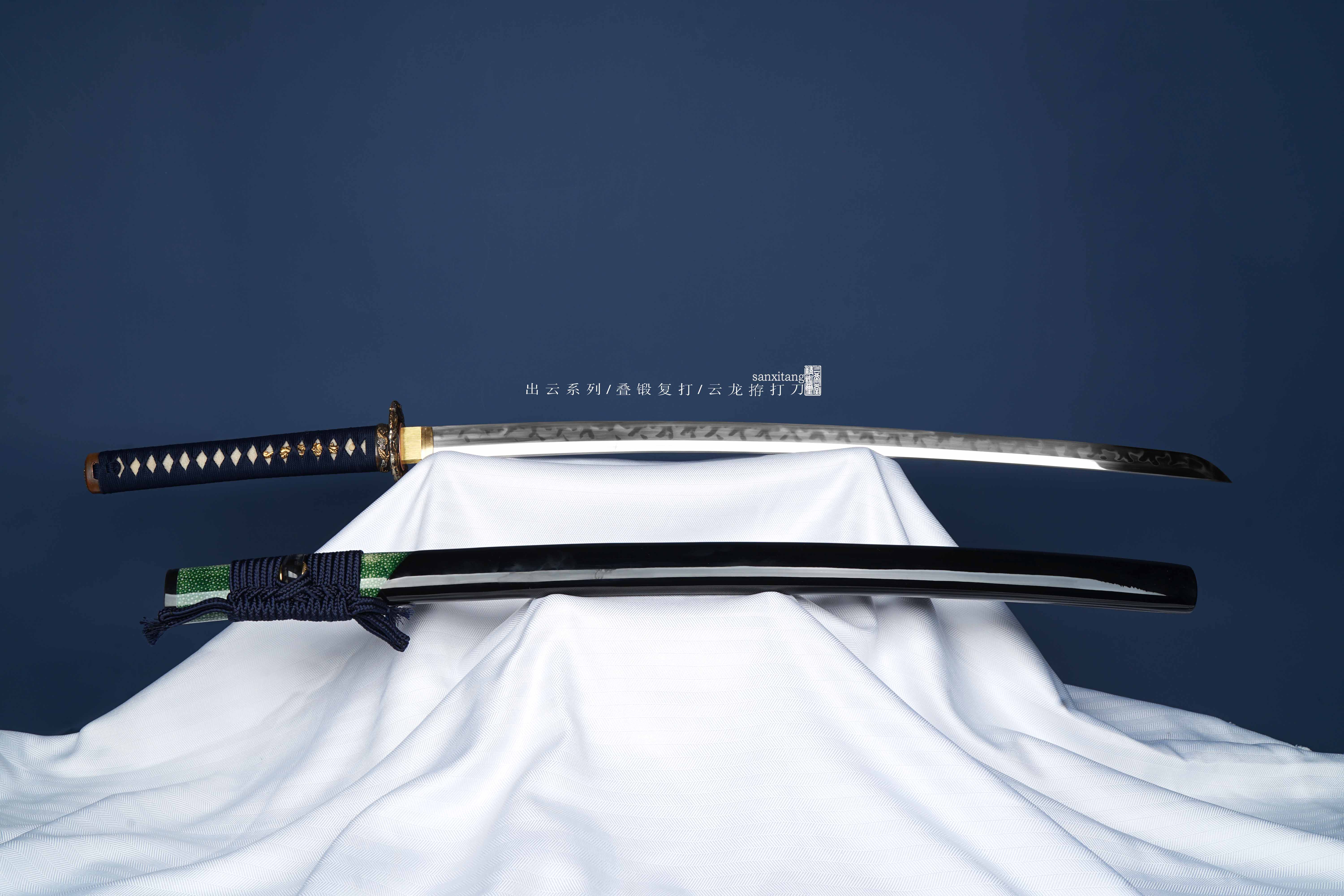 第一次出日本刀套装 斟酌了很久才定下来做这套作品 大家家里摆摆应该挺好看的 做了很多年的云龙金具 重新制作了铜地复古鎏金银版本 都是真金真银 比普通的华丽不少 折叠锻打2000余层 传统的覆土烧刃工艺 烧的是海浪的感觉 波涛汹涌 起伏跌宕 这个乱刃效果还行 手工推磨 锉花黄铜刀鎺 东南亚进口珍珠鱼皮做的鞘和柄 鞘这个绿色鱼皮挺讨喜的 棉绳柄卷和下绪 手柄特别加固了一下 防滑防脱性能加强 送礼盒 各位自己玩或者送人都非常合适!!