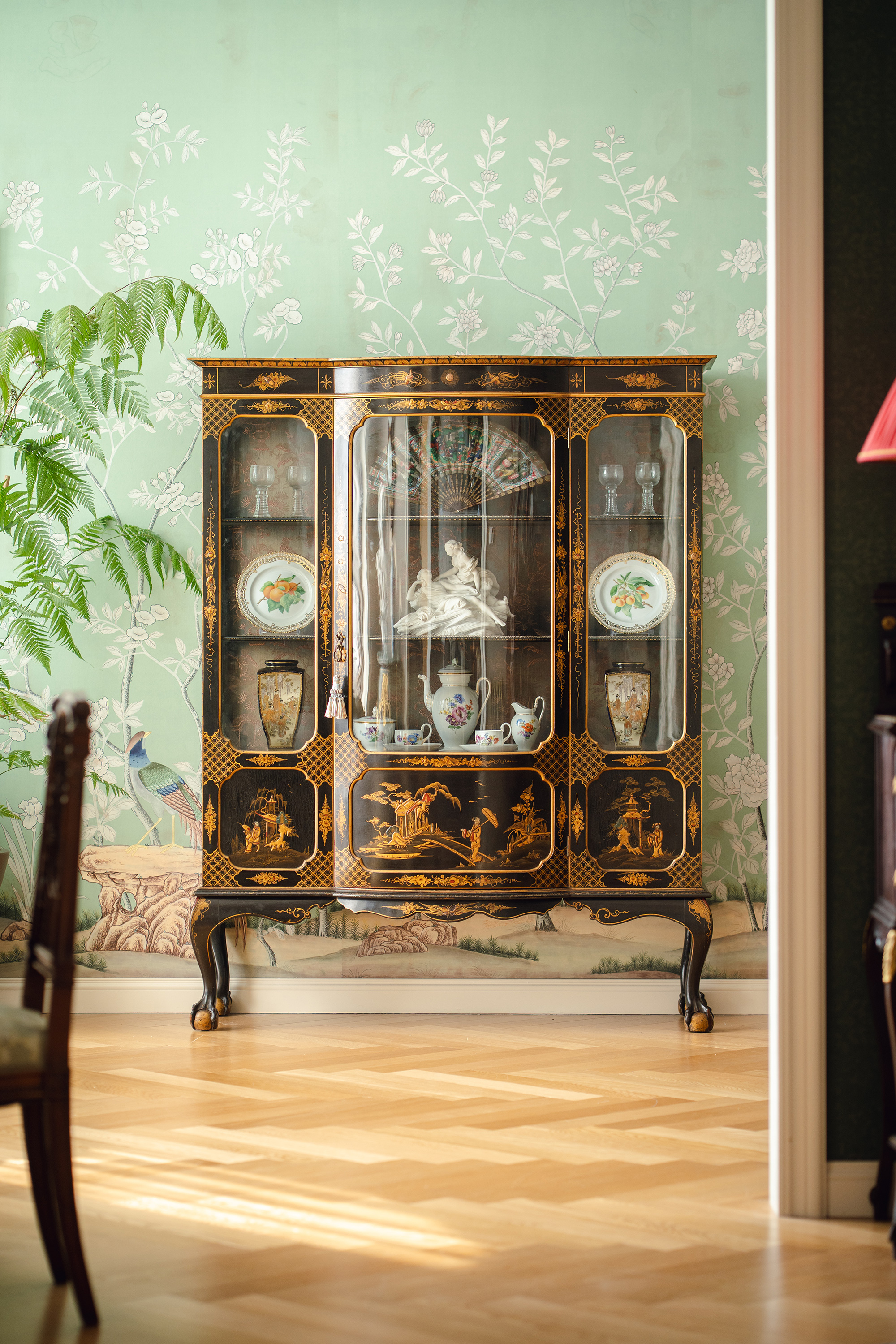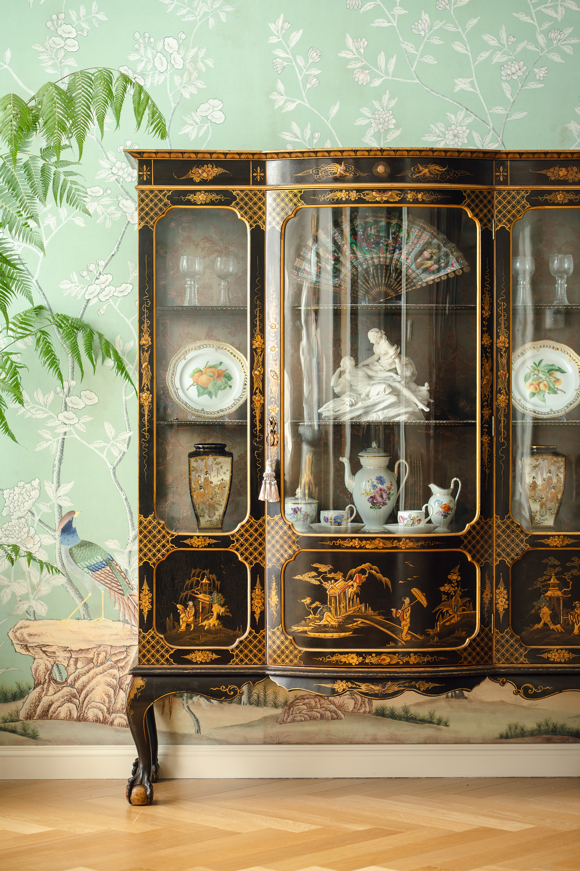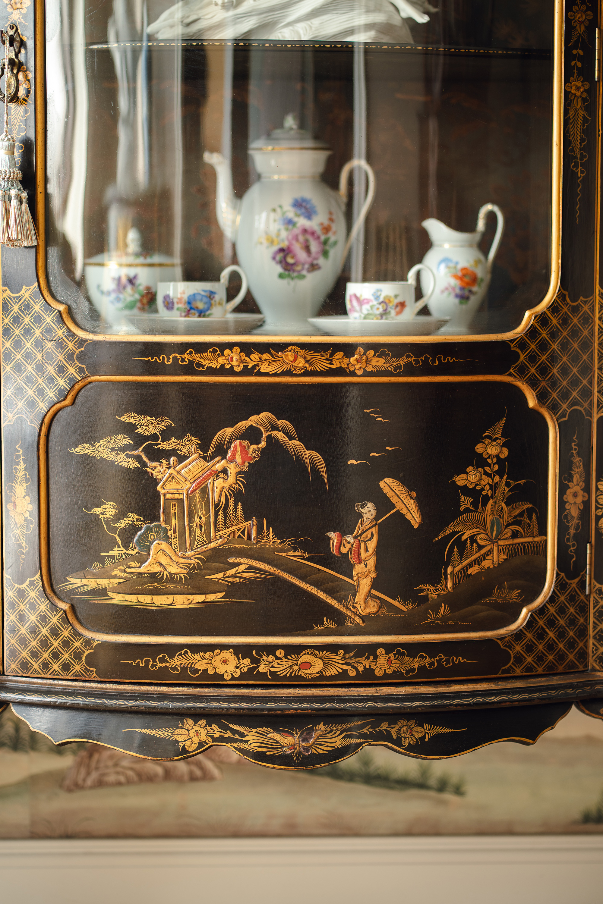 【已售】独角鹿西洋古董19世纪末法国出品东方风格庭院人物主题木胎黑漆描金彩绘面板装饰花卉纹丝绸刺绣内层玻璃展示柜