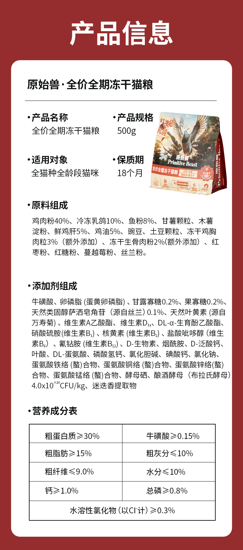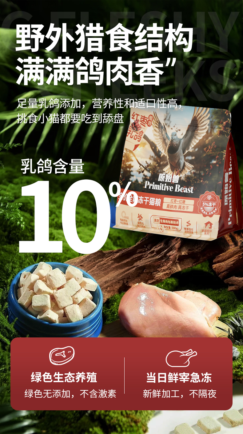 原始兽乳鸽红枣冻干猫粮500g全价主粮 红枣补气配方 添加200亿益生菌 不吃包退