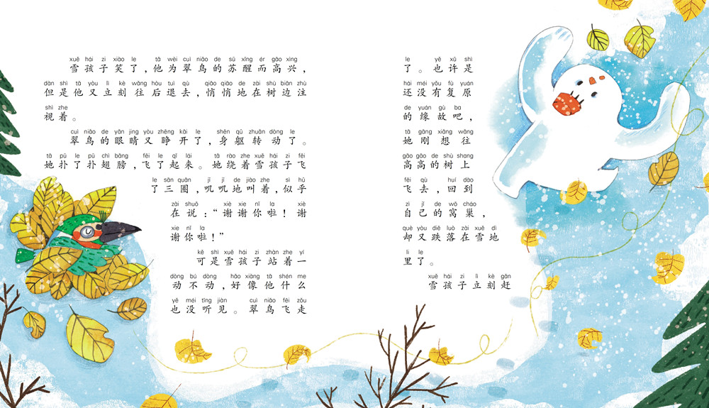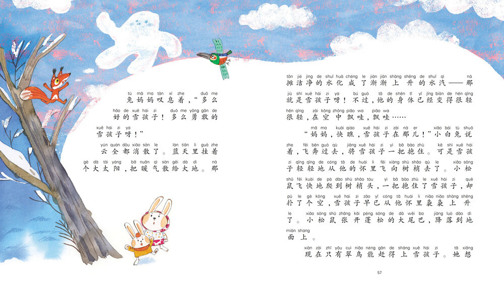 选入嵇鸿先生具有代表性的短篇童话作品,包括《雪孩子》《雪兔》《小松鼠找花生》《“没兴趣”游“无算术国”》等。《小松鼠找花生》是一篇科普童话,通过小松鼠找花生的故事,告诉孩子果实不一定长在地上的,也有长在土里的。《雪孩子》的故事是非常经典的:冬天,白兔妈妈准备出门去找萝卜时,小白兔嚷着也要去,兔妈妈堆了一个雪孩子陪小白兔玩。小白兔在房间睡觉时,火烧着了房子,雪孩子为救小白兔,奋不顾身地冲进了房子救了小白兔。雪孩子善良的举动令人感动。《雪孩子》入选小学语文教材二年级上册课文。《小松鼠找花生》入选小学语文教材一年级上册“和大人一起读”。