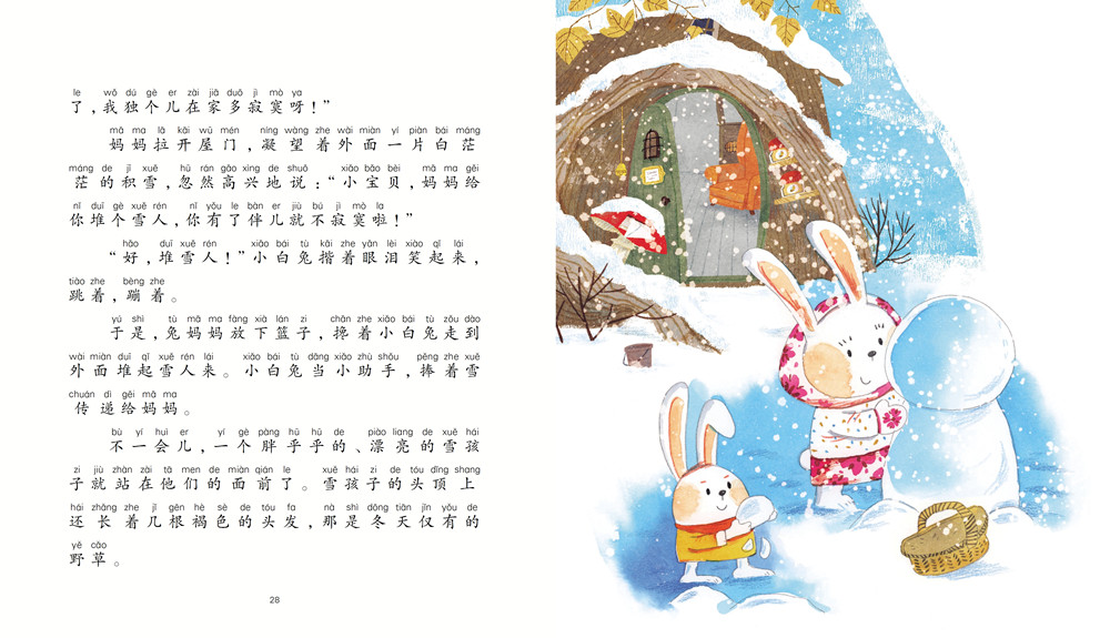 妈妈拉开屋门,凝望着外面一片白茫茫的积雪,忽然高兴地说:“小宝贝,妈妈给你堆个雪人,你有了伴儿就不寂寞啦!”“好,堆雪人!”小白兔揩着眼泪笑起来,跳着,蹦着。于是,兔妈妈放下篮子,搀着小白兔走到外面堆起雪人来。小白兔当小助手,捧着雪传递给妈妈。
