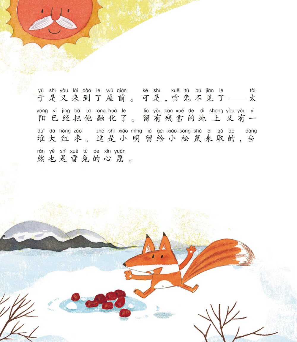 “这怎么够吃呀!孩子,”兔妈妈将胡萝卜放在桌上,“妈妈该到外面去找几个大萝卜来才行。”她顺手从墙上取下篮子,骨碌碌……从里面滚出来两颗晶亮、乌黑的龙眼核。小白兔赶紧拾了起来,心疼地说:“妈妈,这是雁姐姐从南方捎来送给我的。到了春天,我要把它们种在屋前,左边一棵,右边一棵,长出两棵龙眼树来呢!”说着,他把龙眼核小心地藏在胸前的衣袋里。“噢,”兔妈妈一面应着,一面挎起篮子往外走,“孩子,乖乖地在家里烤烤火吧……”话还没说完,就被小白兔一把拉住衣角:“妈妈,我也去,我也去!”“不,你不能去。”兔妈妈哄着小白兔说,“外面冷,冷得尾巴都会冻掉哩!孩子,家里多暖和!”说着,她蹲下来往火塘里添了几根柴。“不,我要去,我要去!”小白兔扯住妈妈的衣角不放,并且哭起鼻子来了,“妈妈,你走了,我独个儿在家多寂寞呀!”