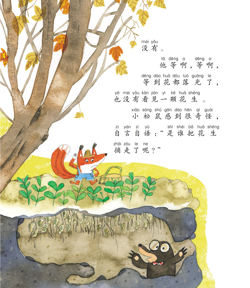 小松鼠问鼹鼠:“这是什么花呀?”鼹鼠说:“这是花生的花。到了秋天,会结花生,花生可好吃啦!”小松鼠很高兴,他想:“等花结了果,我就把花生摘下来,留着冬天吃。”