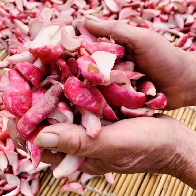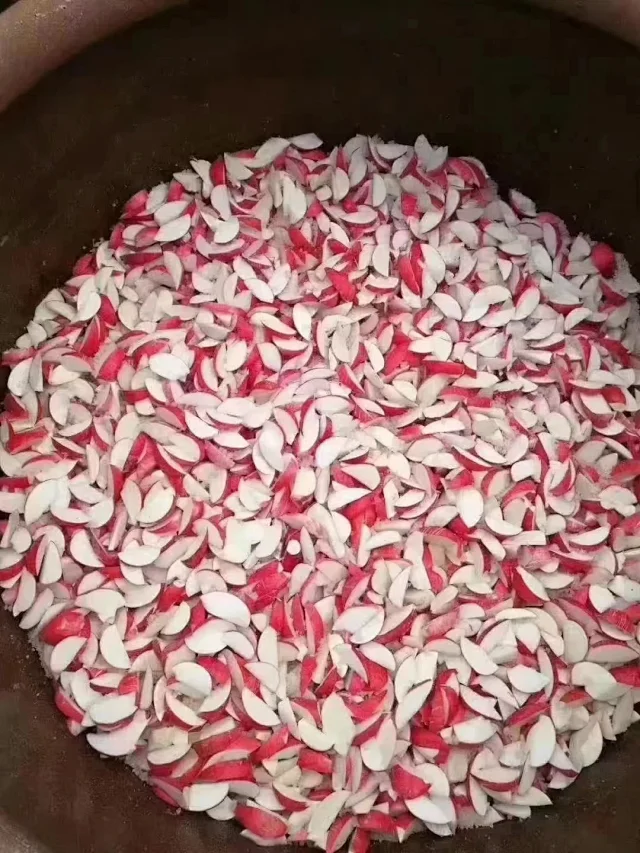 红皮小萝卜切块天然日晒后,加入55度洋河大曲,盐、茴香,少量的冰糖,拌匀入坛,腌制15天,每个一天要翻坛,压榨,特别的费功夫,待萝卜皮的红色满满褪去,香脆的萝卜干就制成了