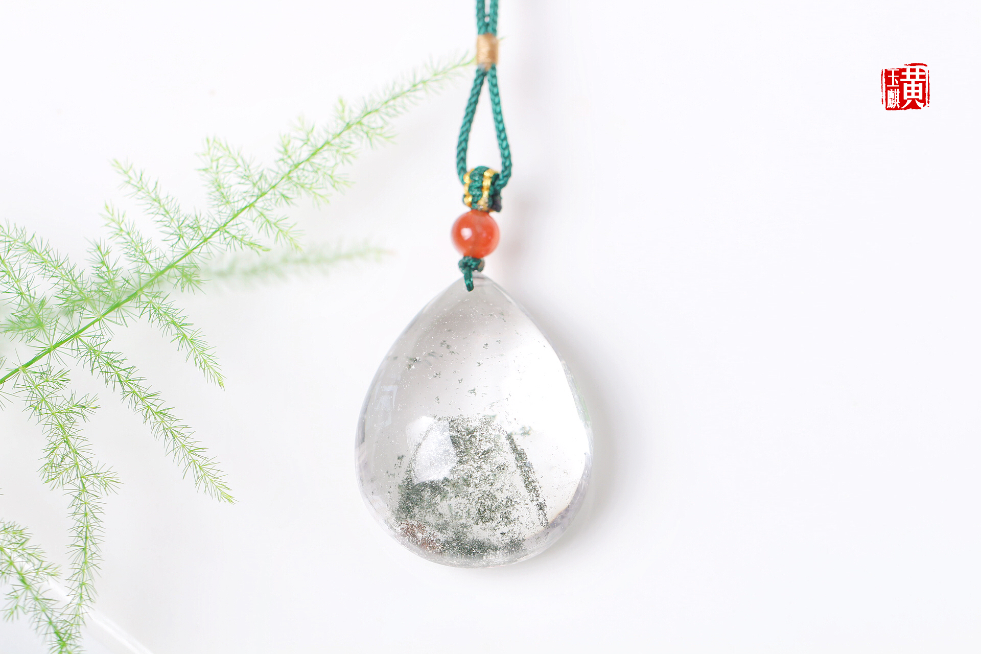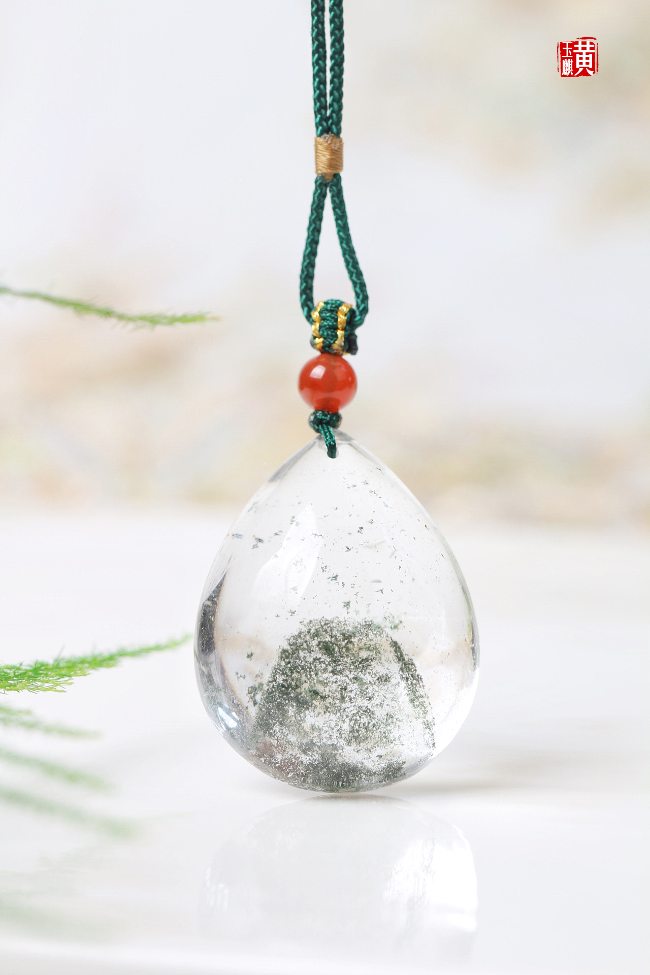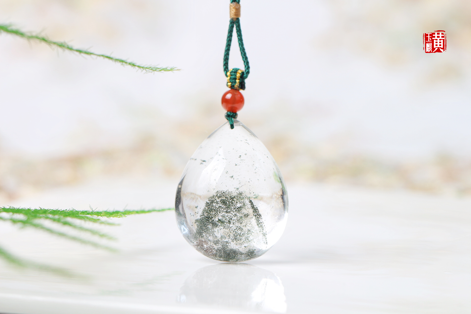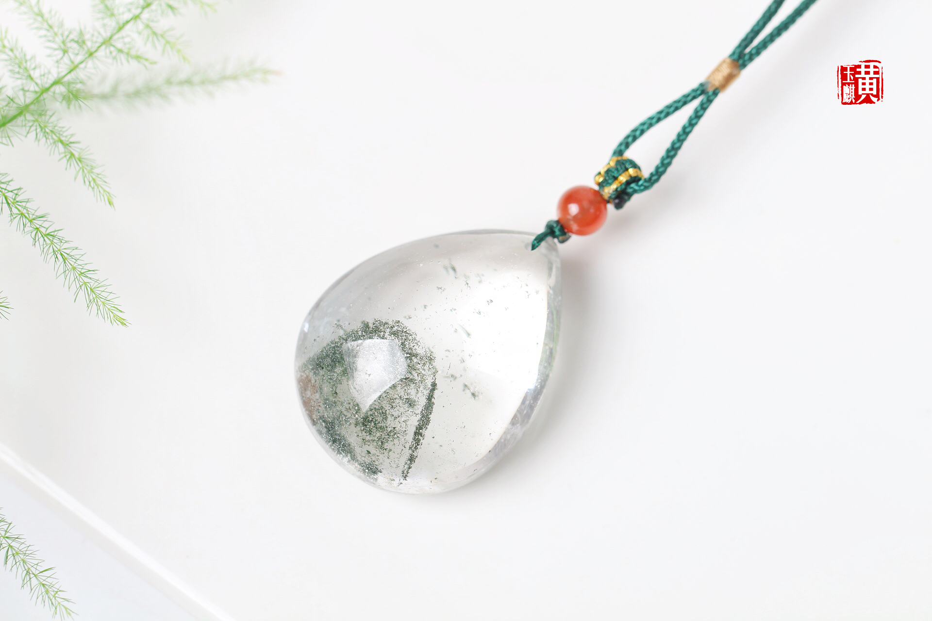 绿幽灵水晶吊坠,被誉为“鬼佬财神”,晶体很干净,内含绿幽灵形成财富山造型,寓意事业兴旺,财富如山。
