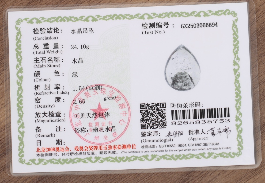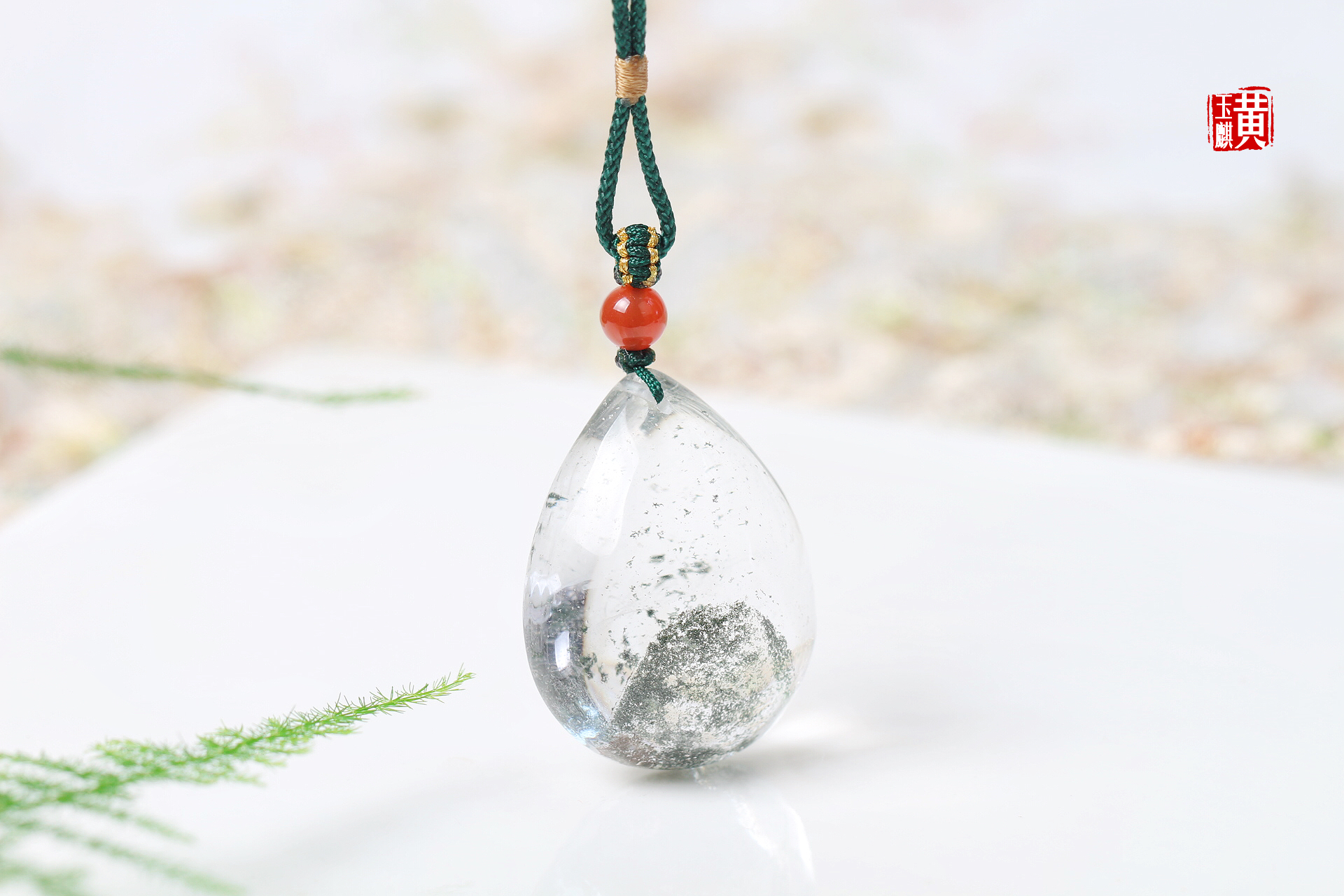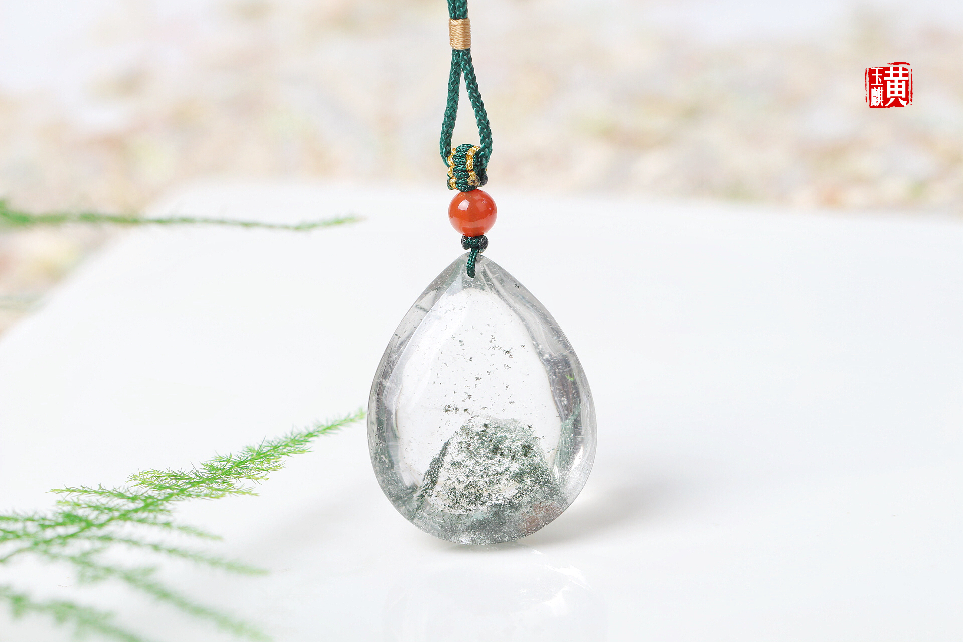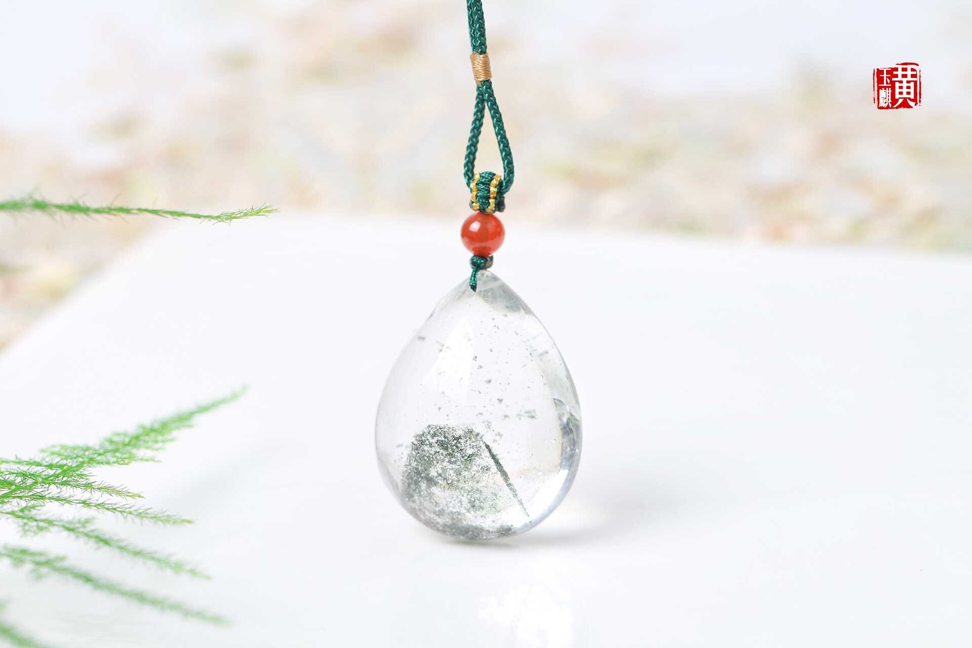 绿幽灵水晶吊坠,被誉为“鬼佬财神”,晶体很干净,内含绿幽灵形成财富山造型,寓意事业兴旺,财富如山。
