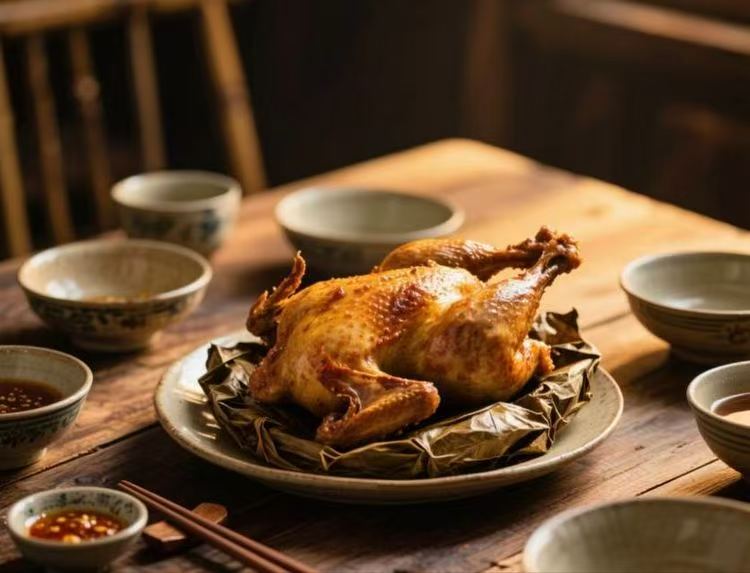 敲开干燥的泥壳,荷叶清香扑鼻而来。鸡肉在密封环境中被原汁原味焖熟,最大程度锁住了鲜嫩与水分,色泽金黄,酥烂脱骨,入口油而不腻,