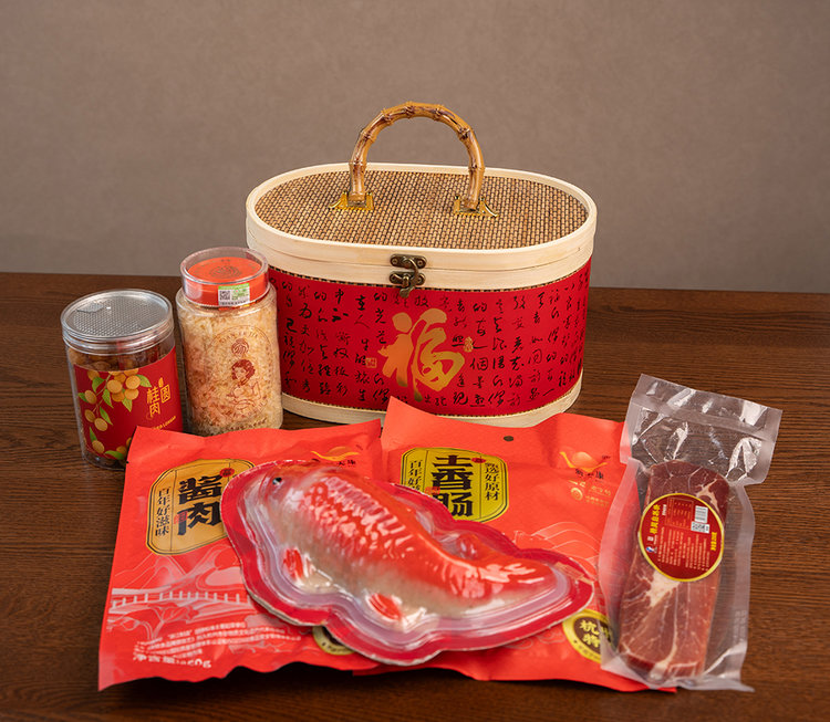 土香肠(非遗) 200克金华火腿自然块(非遗) 250克锦鲤八宝饭(老字号) 350克古田有机本草银耳(国家地理标志产品) 80克高州老树桂圆肉(国家地理标志产品) 200克