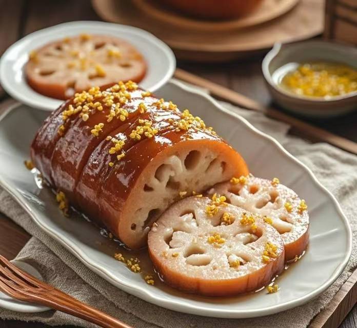 煮好的糯米藕待凉后切片淋上桂花蜜便可享用。裹着桂花香气的糯米藕,入口软糯,丝丝桂花蜜的甜缠绕舌尖,令人回味。