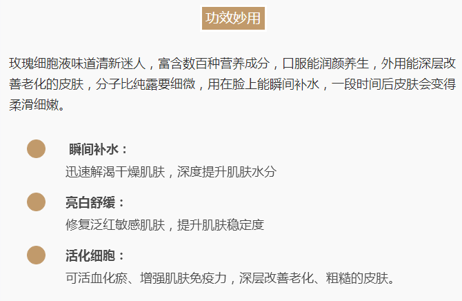 此玫瑰细胞液来自有机酵素玫瑰园,是百分百玫瑰花瓣精华,1200朵玫瑰平均才能生产248毫升精华液,因而非常珍贵,提取的细胞液 具有超强亲肤渗透力,天然可食用,富含数百种珍贵成分,被誉为补水修复之王。