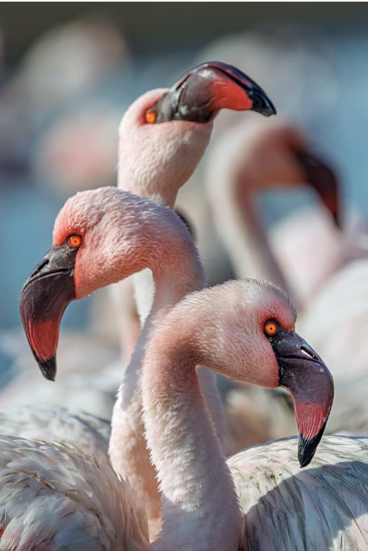 在靠近岸边的浅水区,有各种各样的火烈鸟在这里生活。