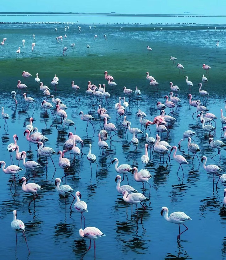 鲸湾港沿海浅滩面积达7000多公顷,以海鸟、水禽众多著称.纳米比亚西临大西洋的海岸线上,聚集的火烈鸟是独特一景。
