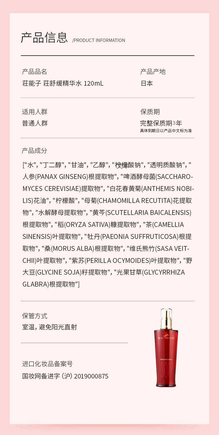 银座SONOKO 荘能子 荘舒缓精华水 120mL 日本进口【28年2月到期全新】