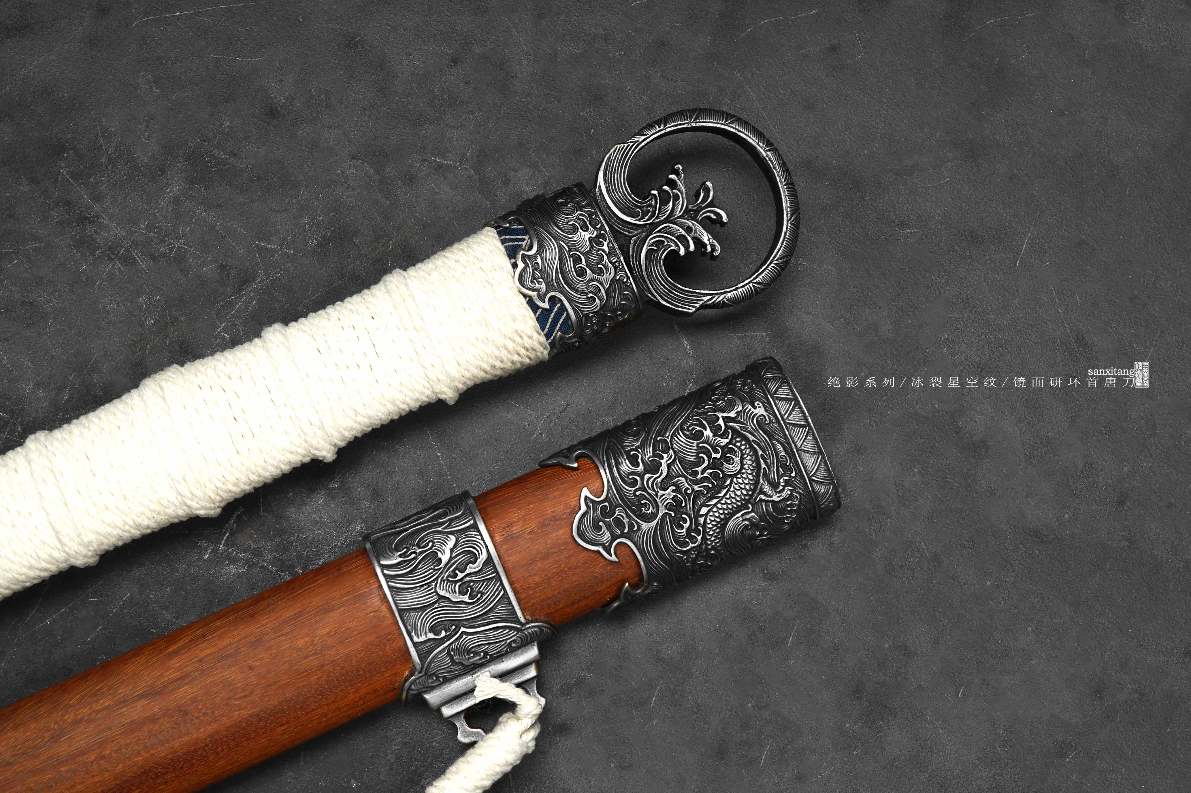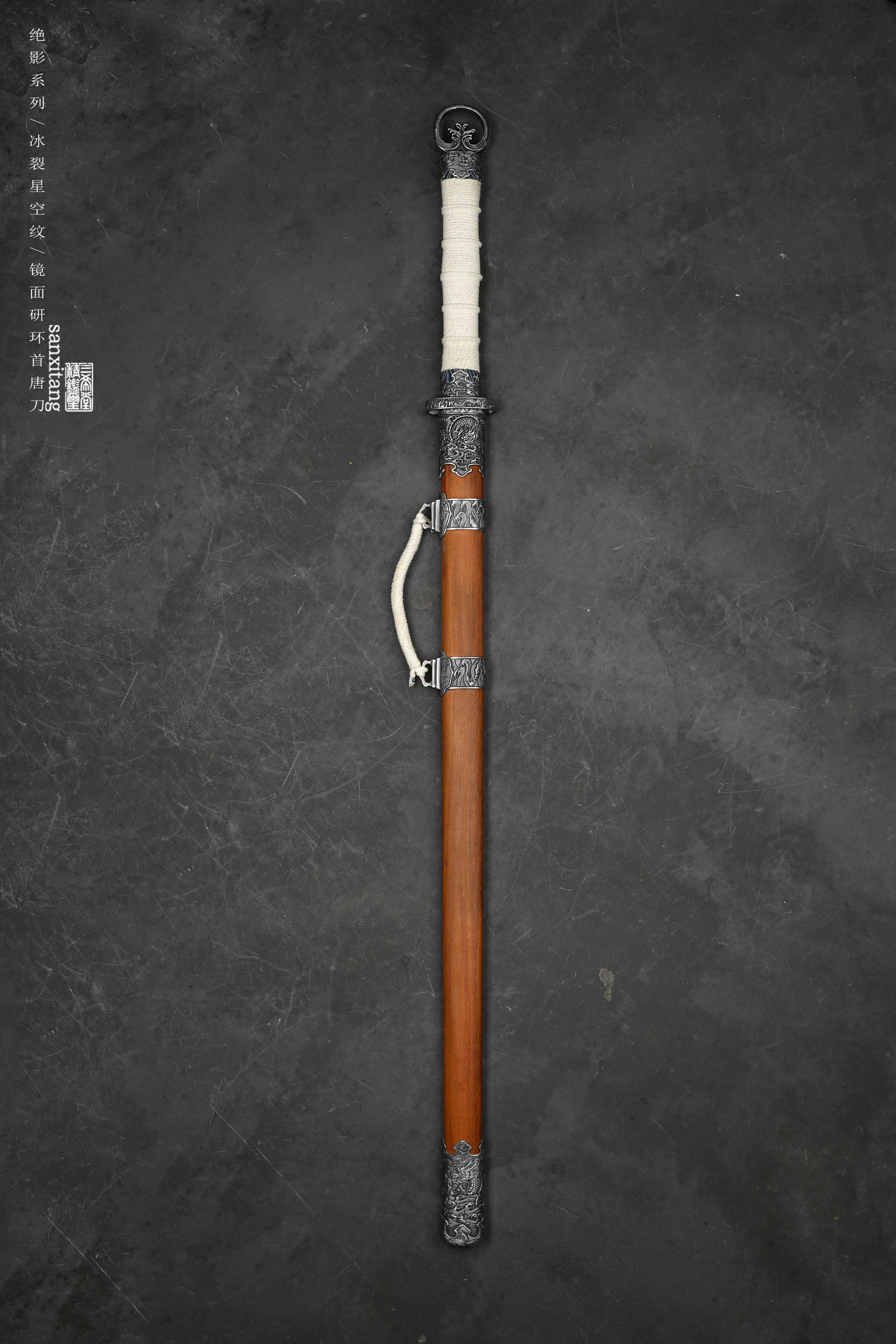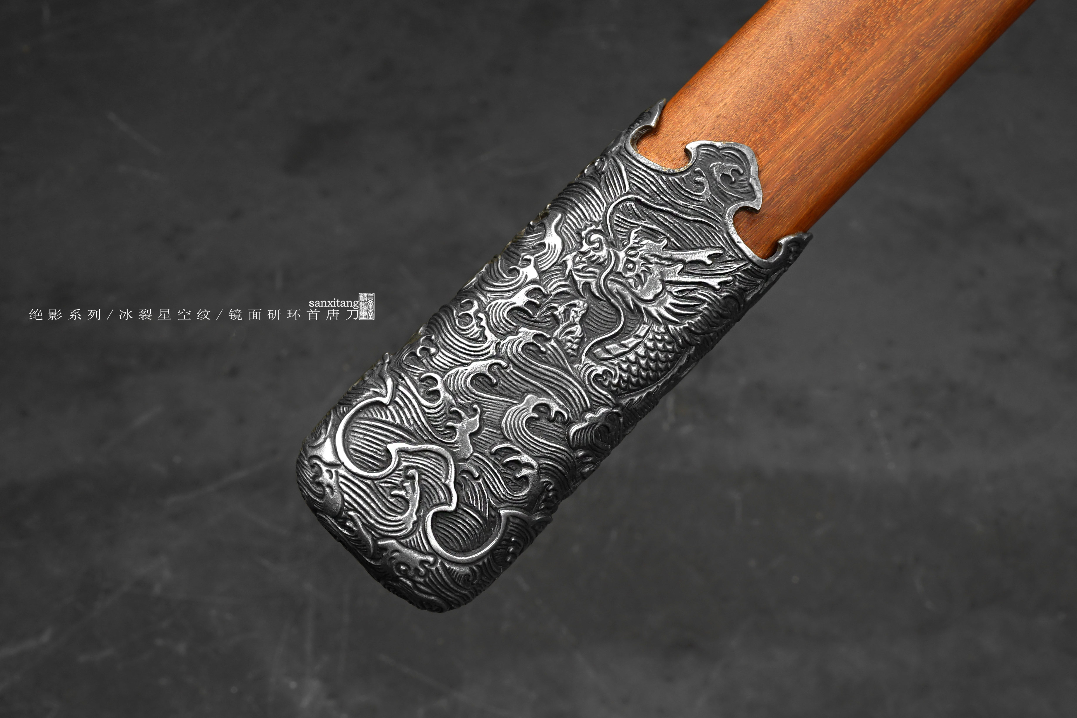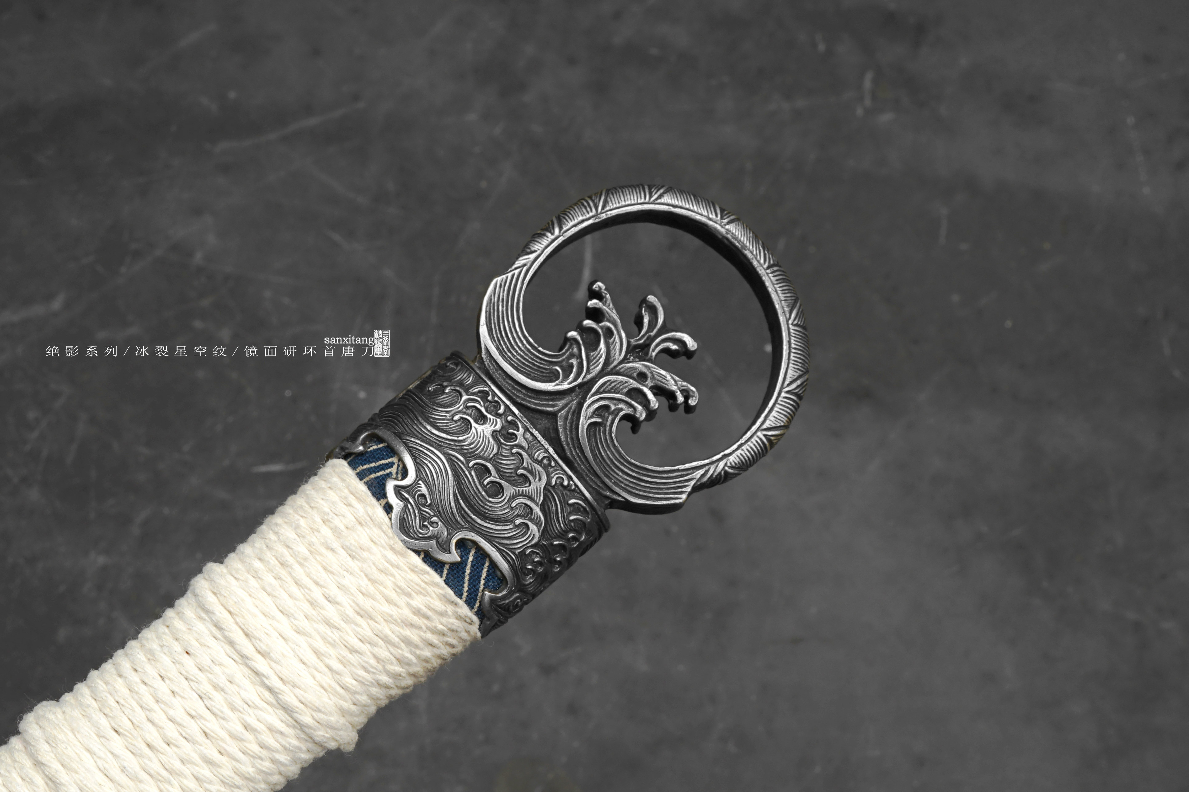 做了非常久的海龙冰裂环首出来啦,由于太难做现在只做出来5只,老规矩,国内给大家很便宜,这个在国外定价25800一只,给你们很便宜,看完视频你们心里都有数了,效果太炸裂了,应该不需要我去推荐了,直接冲把。绝影系列长款唐环首,全长有100这么长,重点就是这根刀条,很开心的告诉大家,三希堂核心工艺又升级了,真的把冰裂纹干出来了,而且在窄面刀条上面实现了,虽然目前报废率比较高,制作时间和成本都非常惊人,但也算是做出来了,先把这半年做出来的4只上架给大家。研发了比较久,中间和日本还有美国的大师交流了很多细节,取了他们的优点进一步升级,目前大家都是锤一些抽象一点的冰裂纹,我觉得没啥意思,我要做就做具象的、写实的。这次我以北极结冰海面为元素创造了这种冰裂纹钢材,用粉末烧结的技术加上锻打和研磨,秉承了我们尊古且创新的理念。大家看下图三,基本上还原了这个场景,甚至还有点疏密的渐变,搭配我们的核心研磨工艺,这只环首一拔出来就是寒光凛凛的感觉,远看镜面寒气逼人,近看冰裂纹震慑人心,很有质感的一只作品。黑老酸枝木鞘搭配铜地复古海龙金具,本来老百姓是不让用龙纹的,但是我觉得这个做比较好看,就雕刻了这套金具,几节大块金具比较复杂,摆放起来也挺有牌面的,送架子和礼盒,自己玩或者送人都合适,大家直接冲就是了!!!