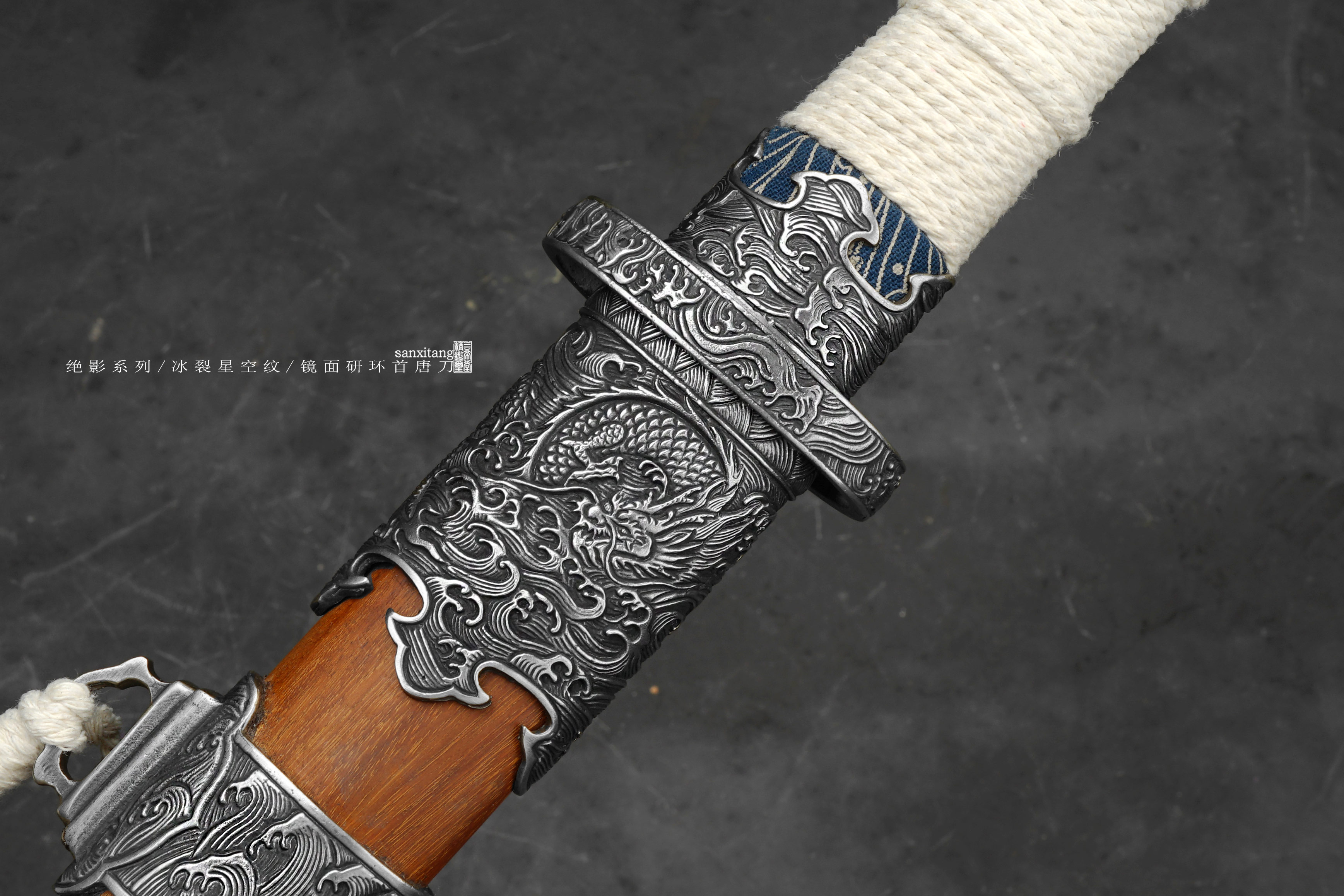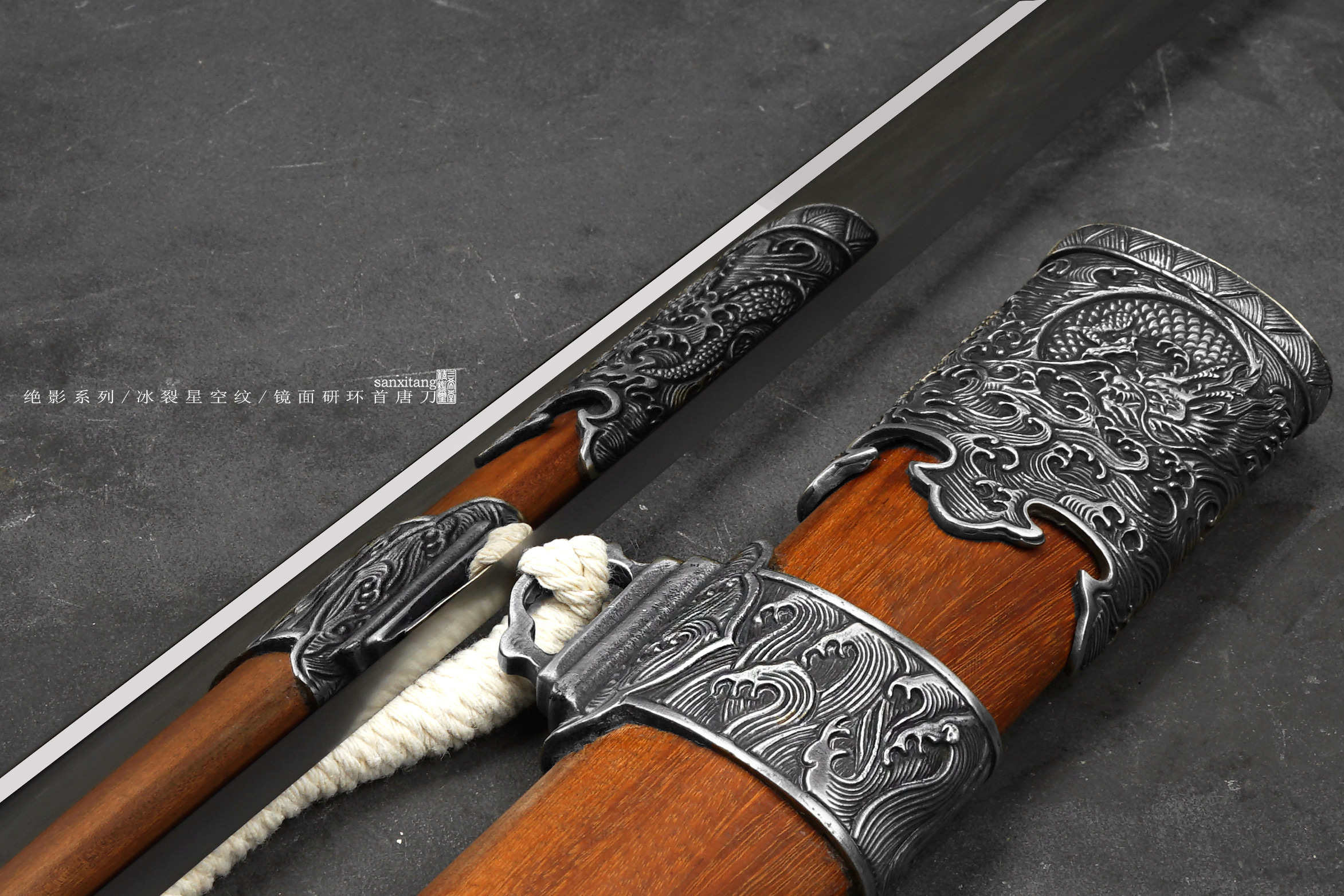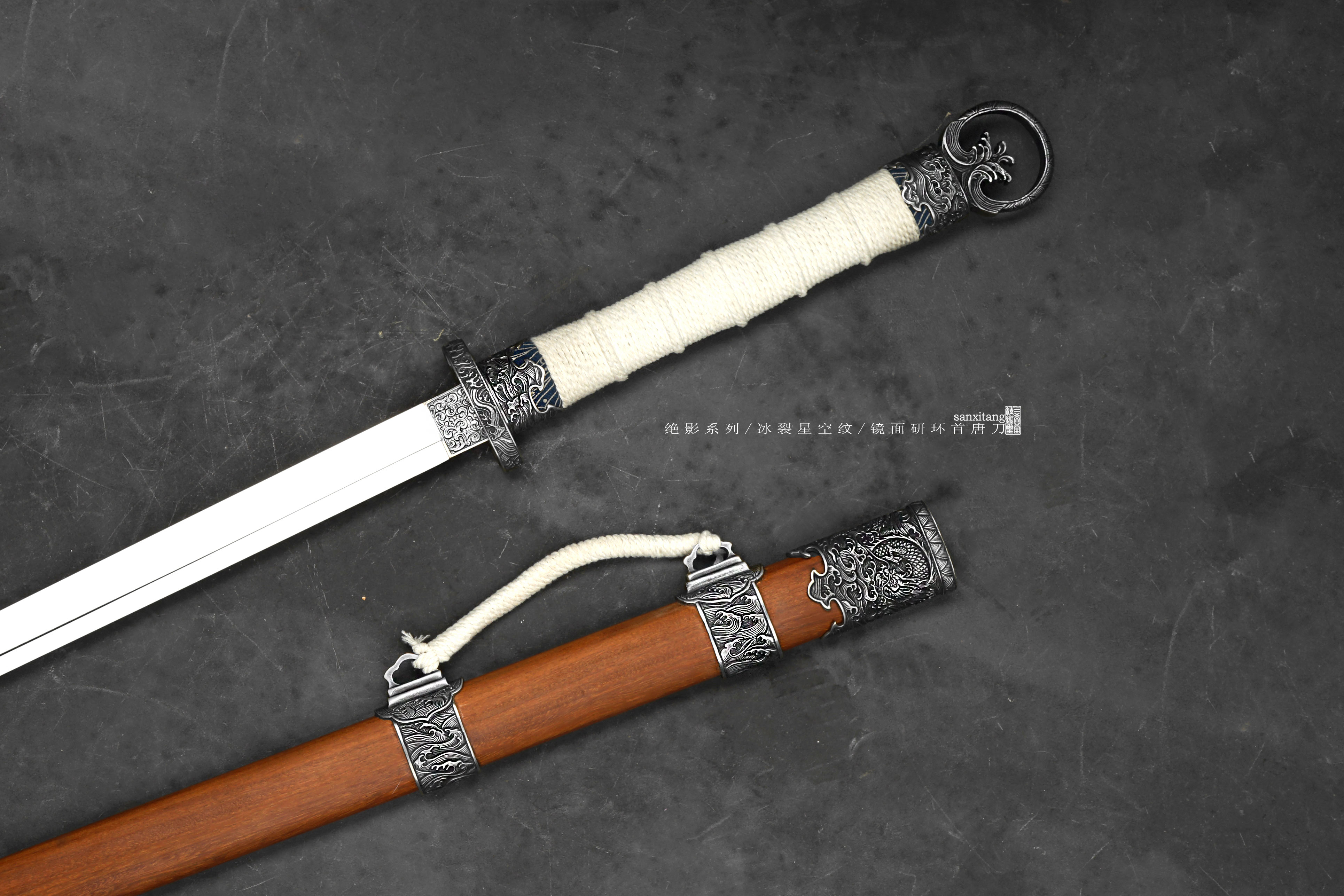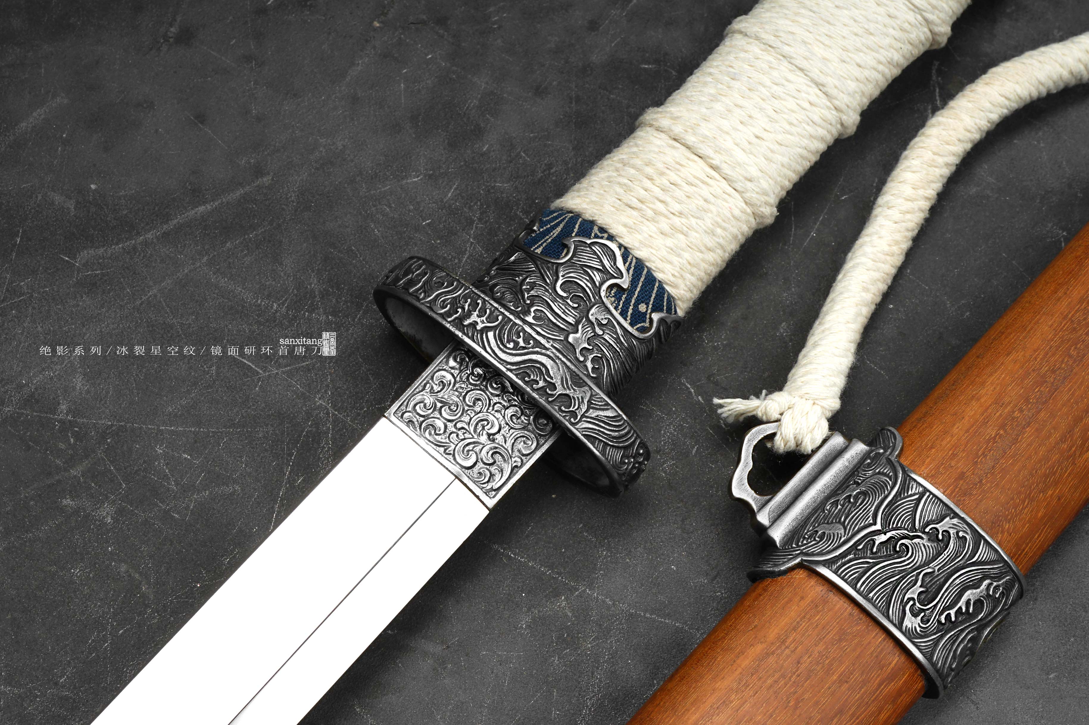 做了非常久的海龙冰裂环首出来啦,由于太难做现在只做出来5只,老规矩,国内给大家很便宜,这个在国外定价25800一只,给你们很便宜,看完视频你们心里都有数了,效果太炸裂了,应该不需要我去推荐了,直接冲把。绝影系列长款唐环首,全长有100这么长,重点就是这根刀条,很开心的告诉大家,三希堂核心工艺又升级了,真的把冰裂纹干出来了,而且在窄面刀条上面实现了,虽然目前报废率比较高,制作时间和成本都非常惊人,但也算是做出来了,先把这半年做出来的4只上架给大家。研发了比较久,中间和日本还有美国的大师交流了很多细节,取了他们的优点进一步升级,目前大家都是锤一些抽象一点的冰裂纹,我觉得没啥意思,我要做就做具象的、写实的。这次我以北极结冰海面为元素创造了这种冰裂纹钢材,用粉末烧结的技术加上锻打和研磨,秉承了我们尊古且创新的理念。大家看下图三,基本上还原了这个场景,甚至还有点疏密的渐变,搭配我们的核心研磨工艺,这只环首一拔出来就是寒光凛凛的感觉,远看镜面寒气逼人,近看冰裂纹震慑人心,很有质感的一只作品。黑老酸枝木鞘搭配铜地复古海龙金具,本来老百姓是不让用龙纹的,但是我觉得这个做比较好看,就雕刻了这套金具,几节大块金具比较复杂,摆放起来也挺有牌面的,送架子和礼盒,自己玩或者送人都合适,大家直接冲就是了!!!