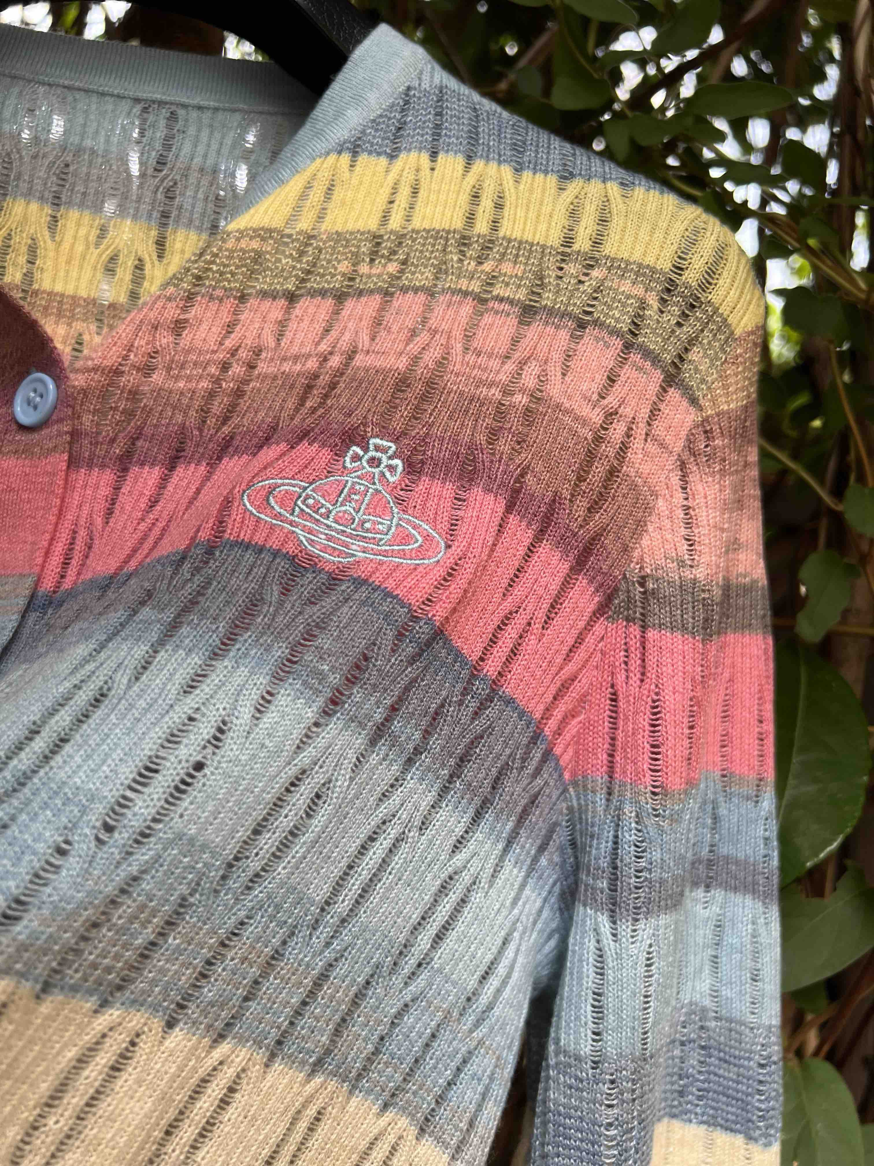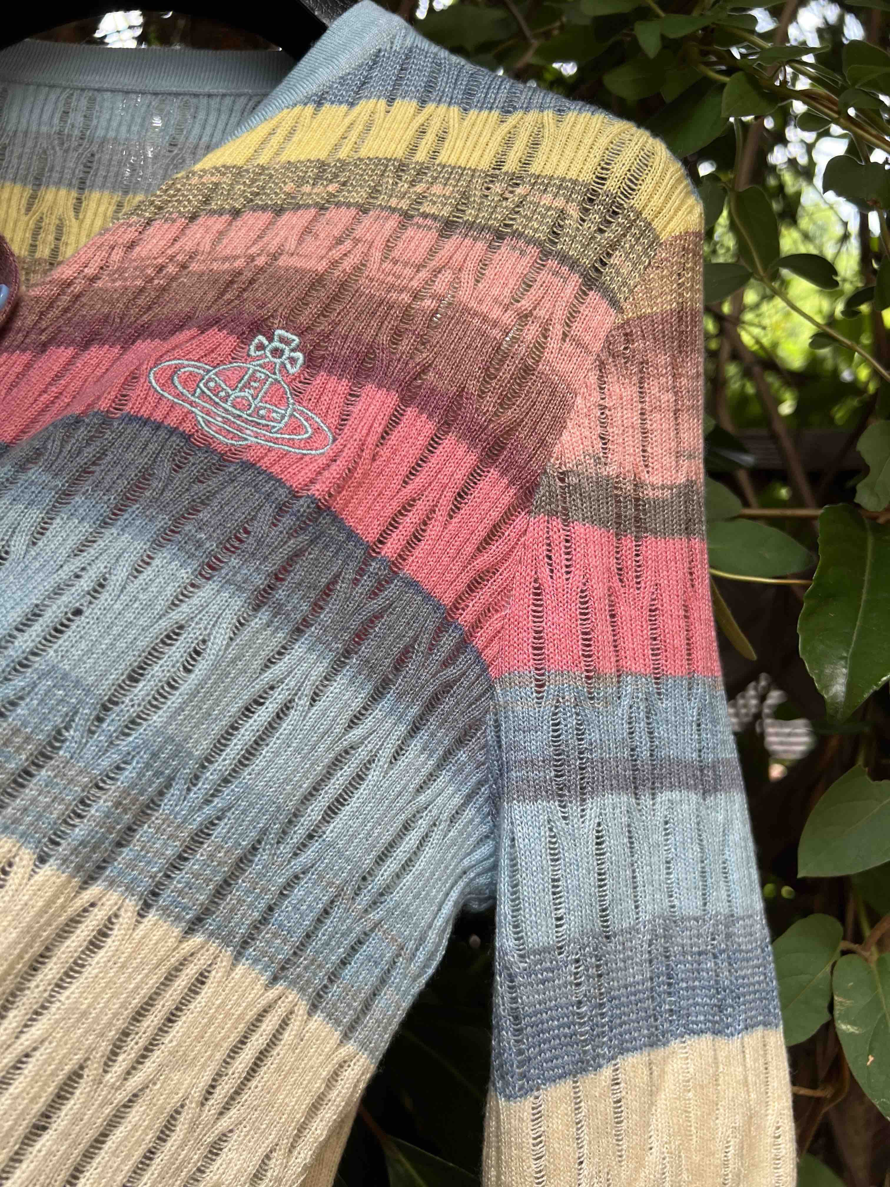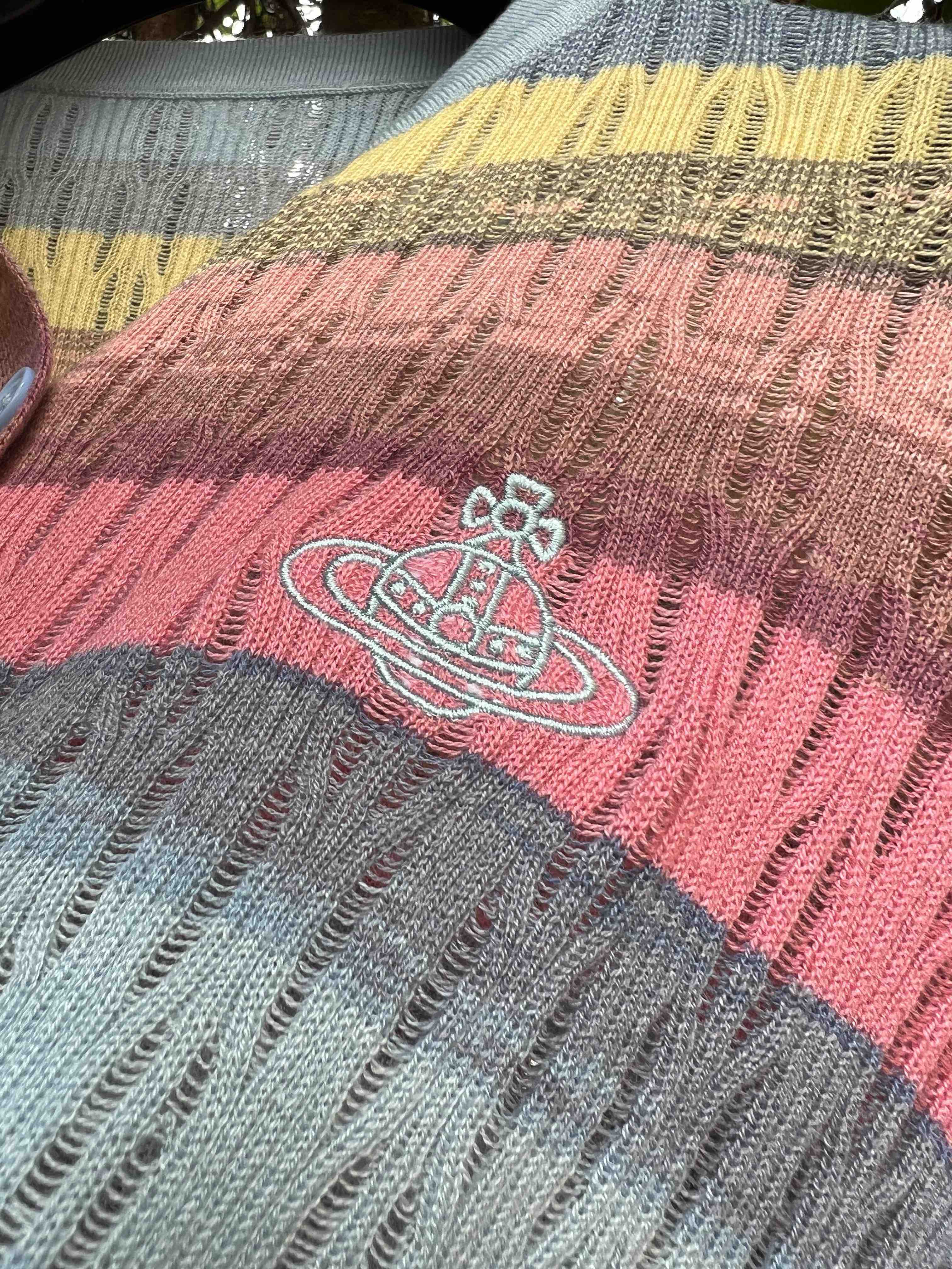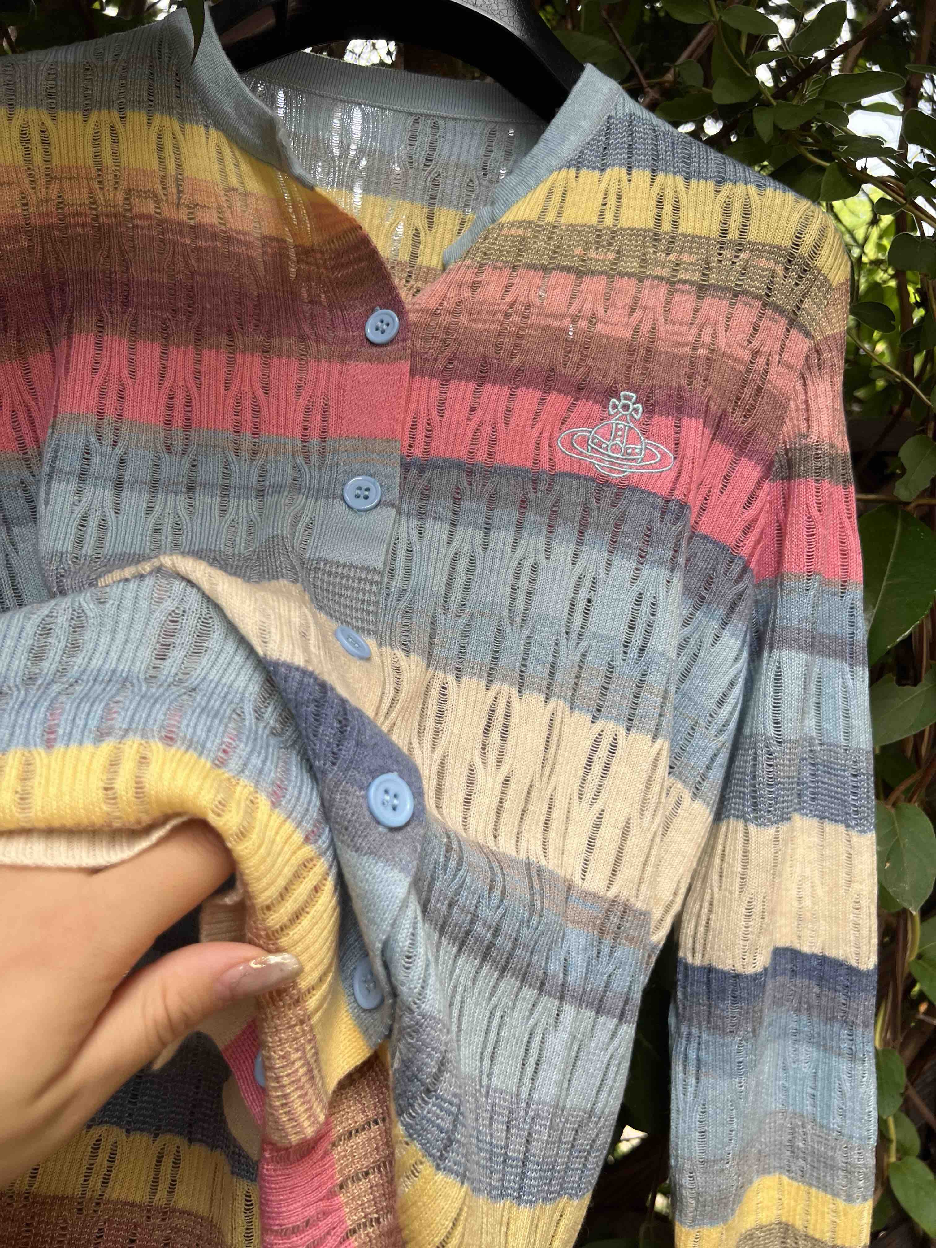 镂空彩色条纹,明媚洋气,时髦减龄,西太后张扬的基因还是在的,这款小开衫,乖巧可人,but不甜腻。标志性的土星刺绣,这番操作,堪称艺术品水准,如此纤薄的针织上刺绣徽标,着实需要功力的,材质是50%羊毛30%粘胶20%尼龙,科学的配比混纺,细腻亲肤软糯柔滑,相当的滑溜溜,适合夏季空调房,微凉早秋,搭配吊带或背心都好看