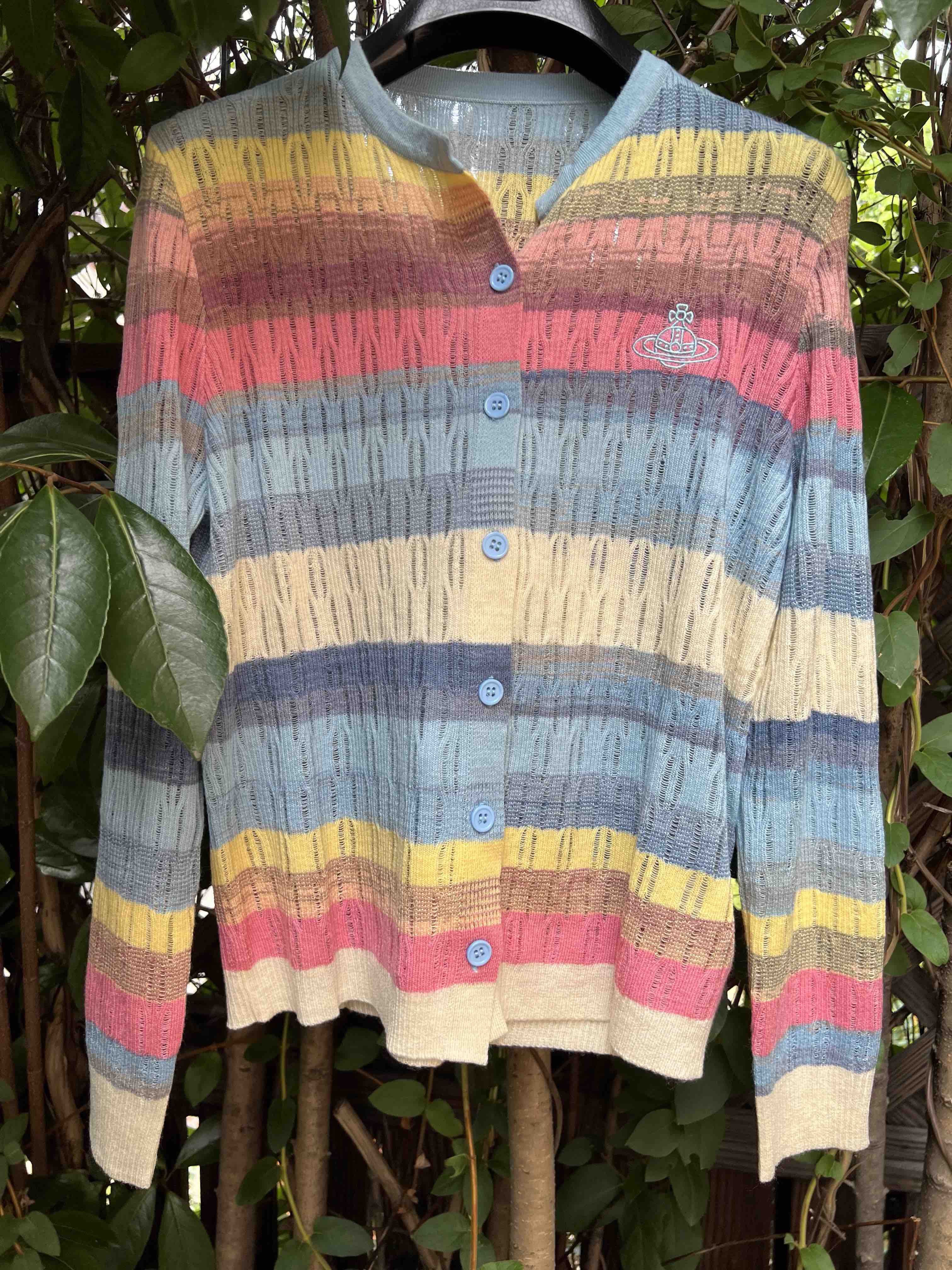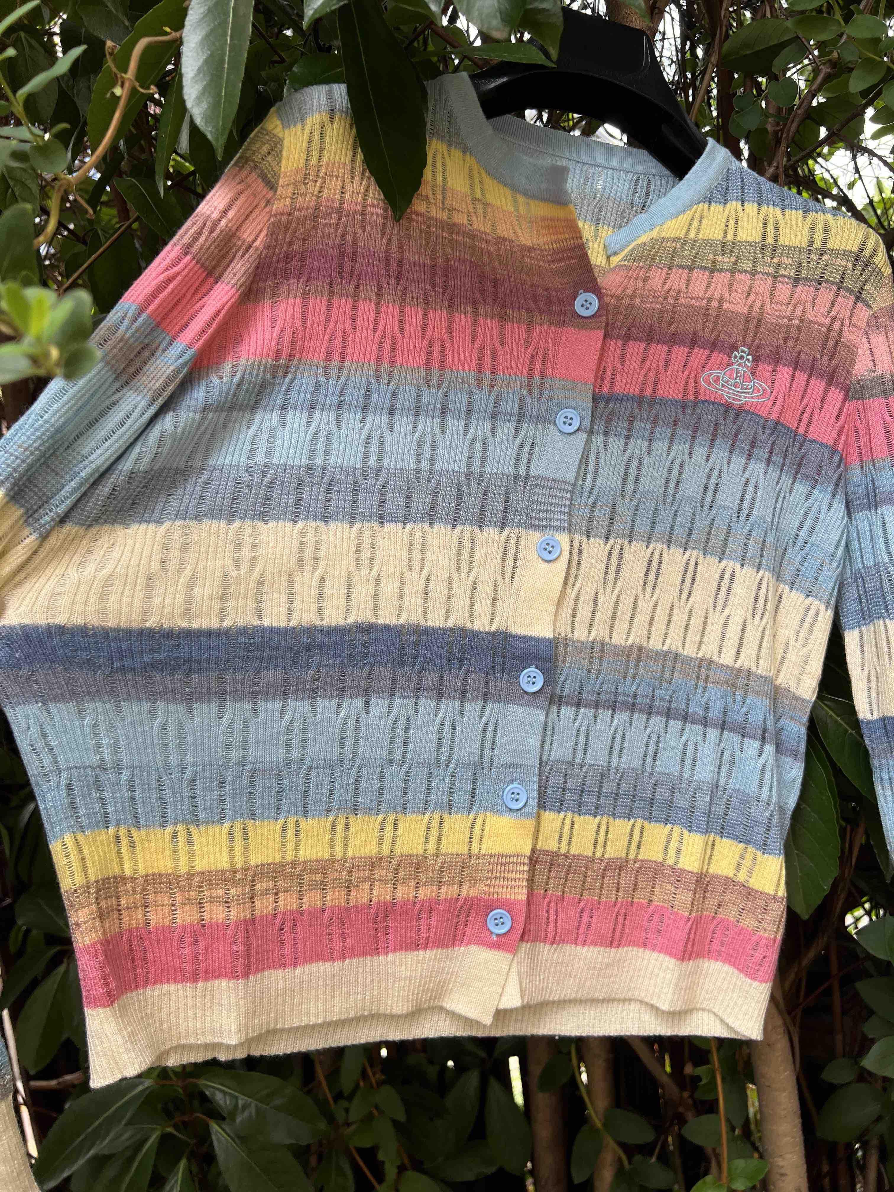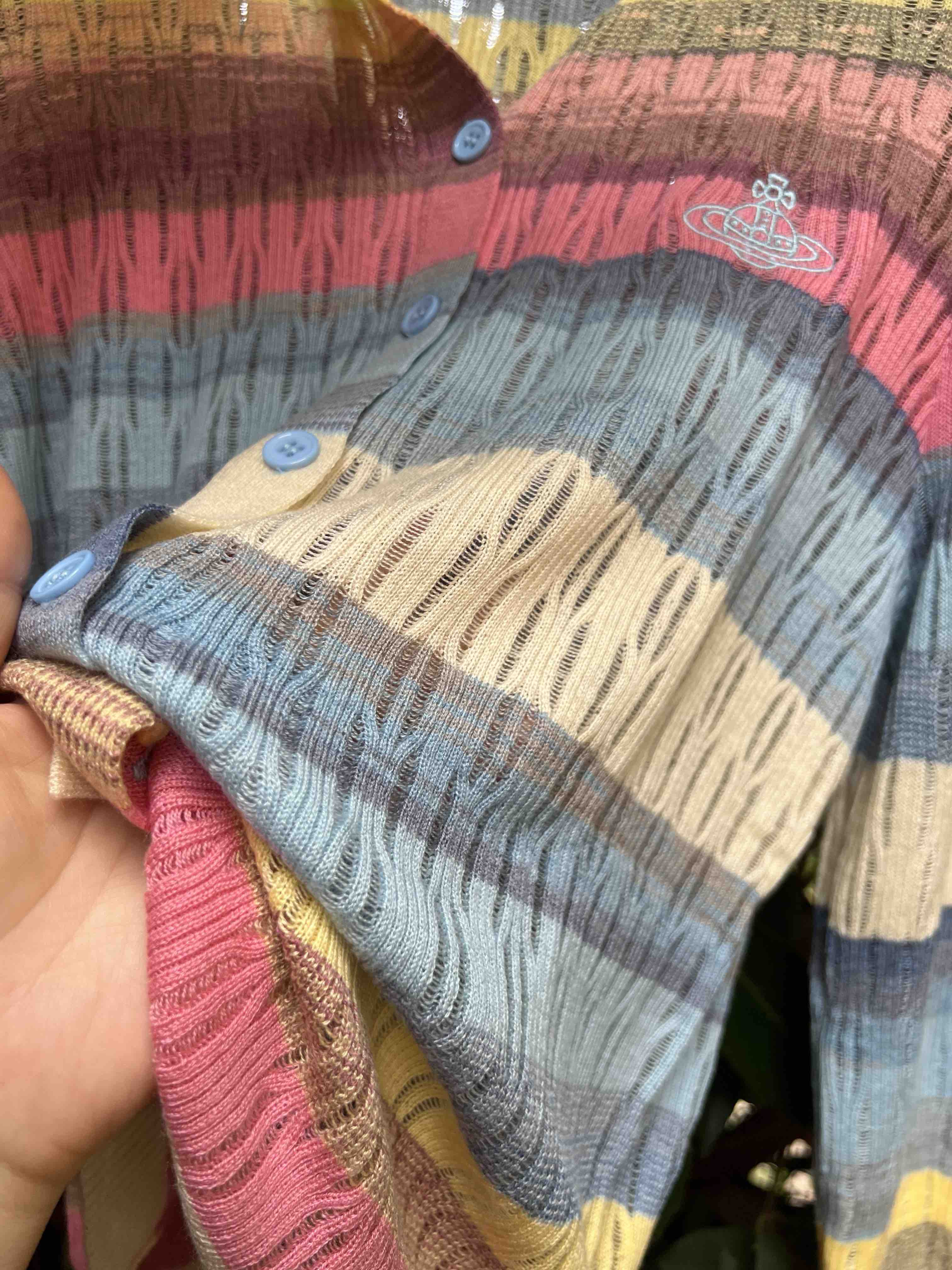 镂空彩色条纹,明媚洋气,时髦减龄,西太后张扬的基因还是在的,这款小开衫,乖巧可人,but不甜腻。标志性的土星刺绣,这番操作,堪称艺术品水准,如此纤薄的针织上刺绣徽标,着实需要功力的,材质是50%羊毛30%粘胶20%尼龙,科学的配比混纺,细腻亲肤软糯柔滑,相当的滑溜溜,适合夏季空调房,微凉早秋,搭配吊带或背心都好看