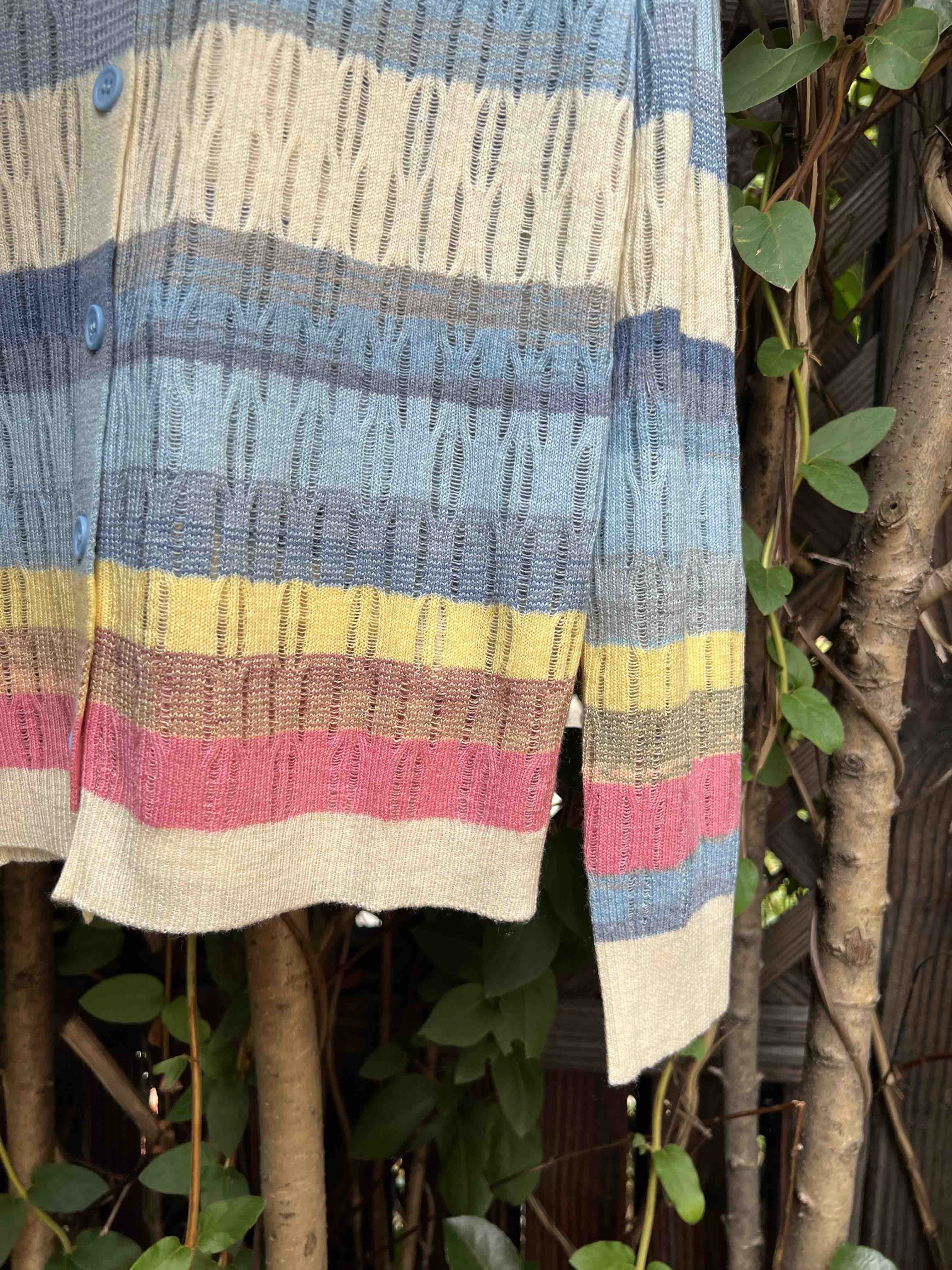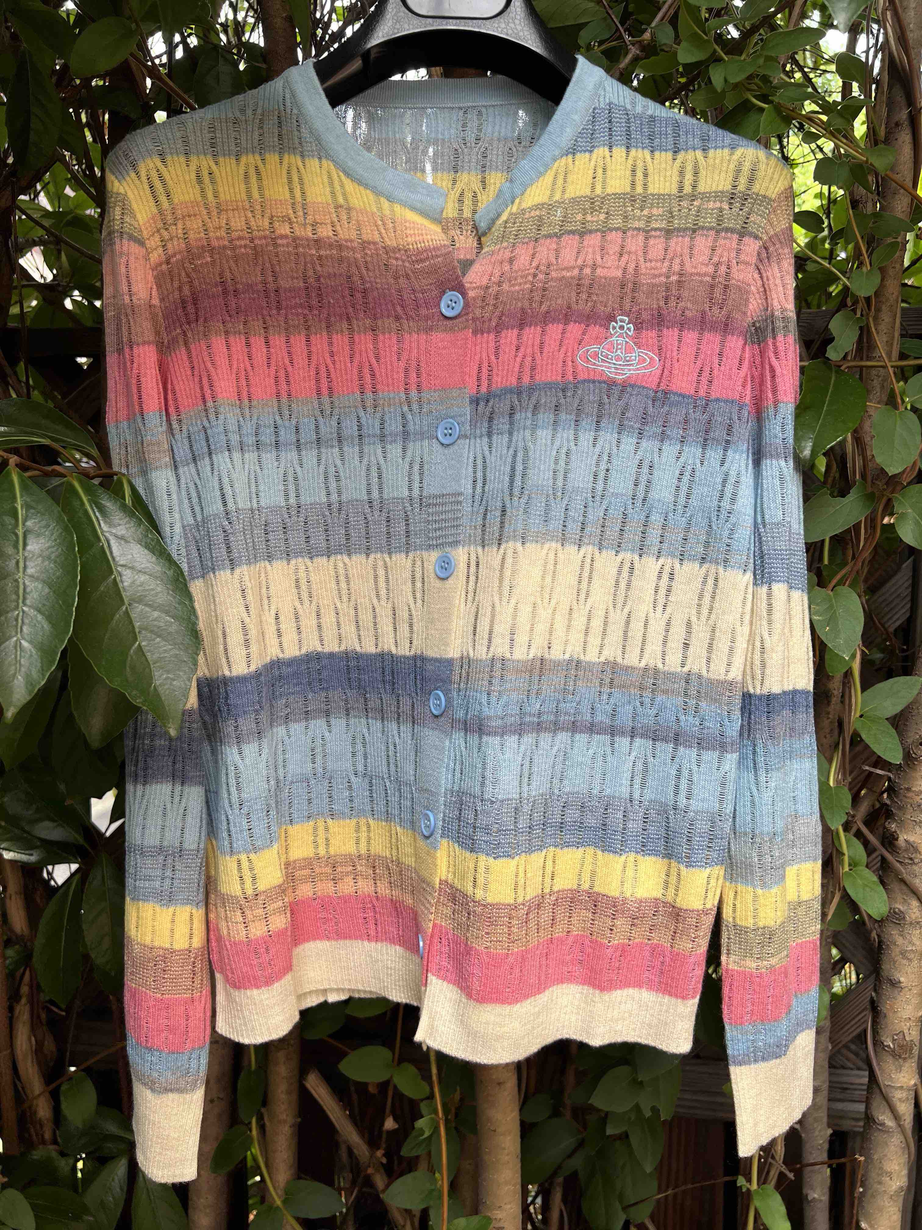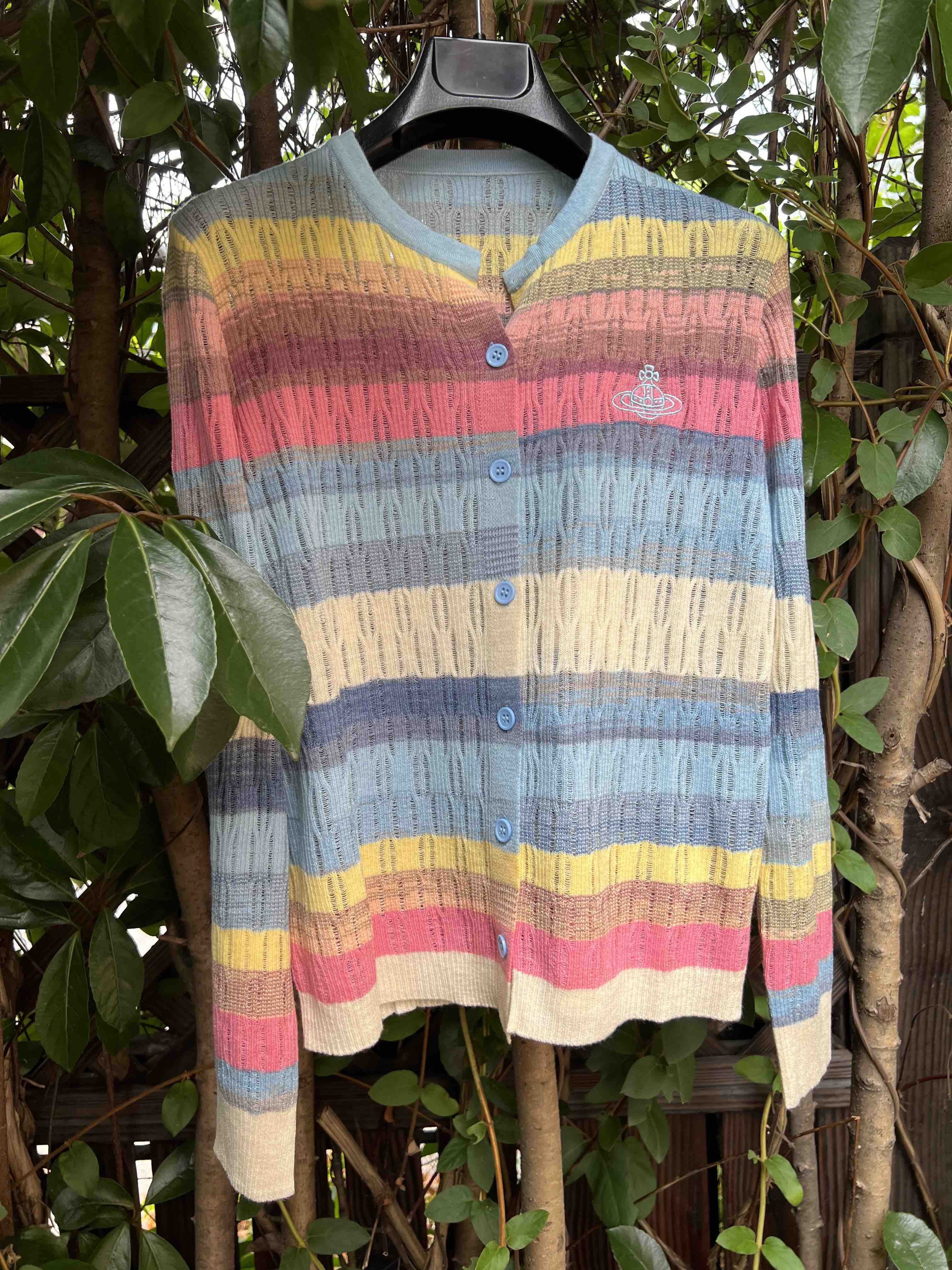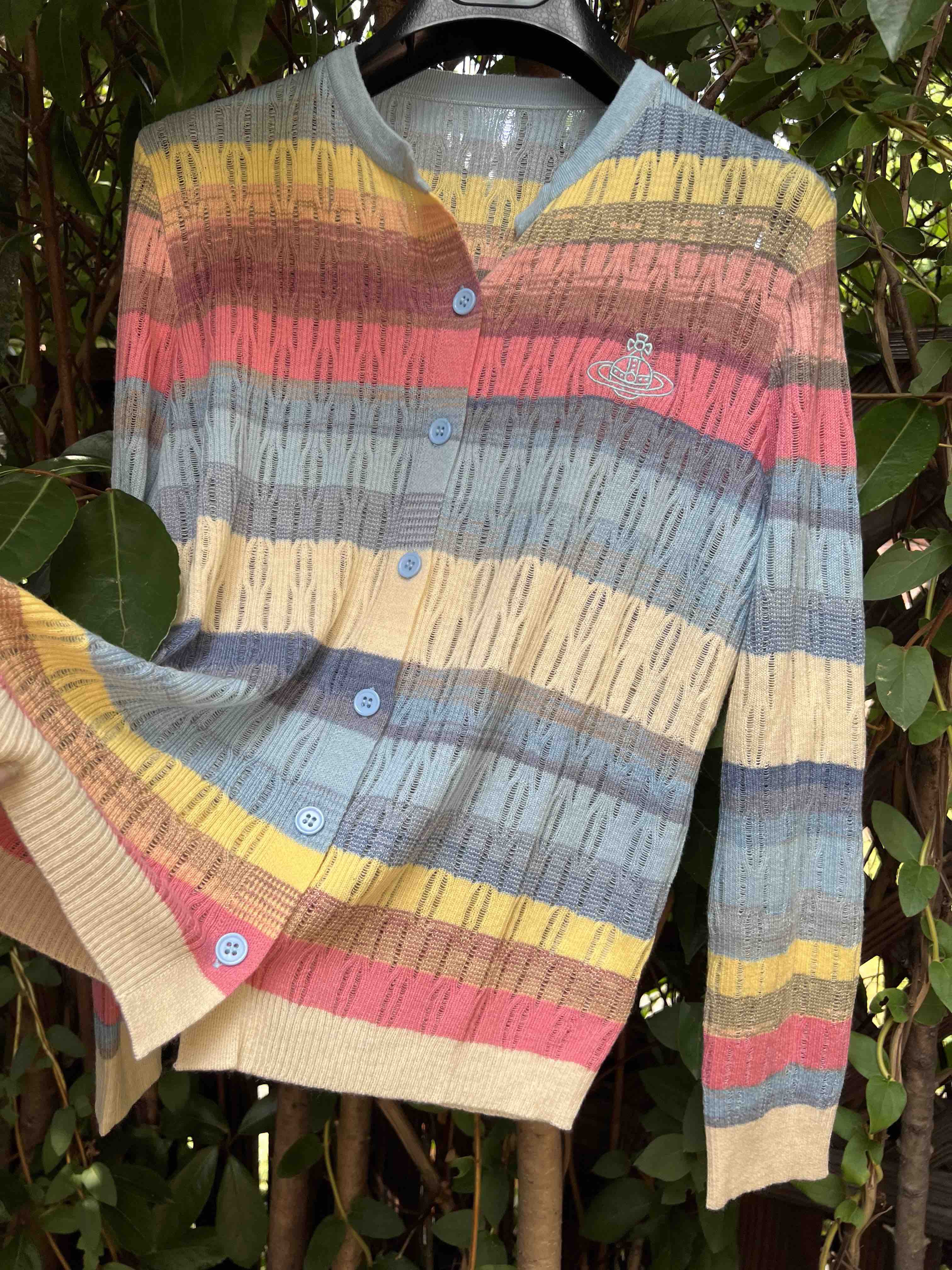 镂空彩色条纹,明媚洋气,时髦减龄,西太后张扬的基因还是在的,这款小开衫,乖巧可人,but不甜腻。标志性的土星刺绣,这番操作,堪称艺术品水准,如此纤薄的针织上刺绣徽标,着实需要功力的,材质是50%羊毛30%粘胶20%尼龙,科学的配比混纺,细腻亲肤软糯柔滑,相当的滑溜溜,适合夏季空调房,微凉早秋,搭配吊带或背心都好看
