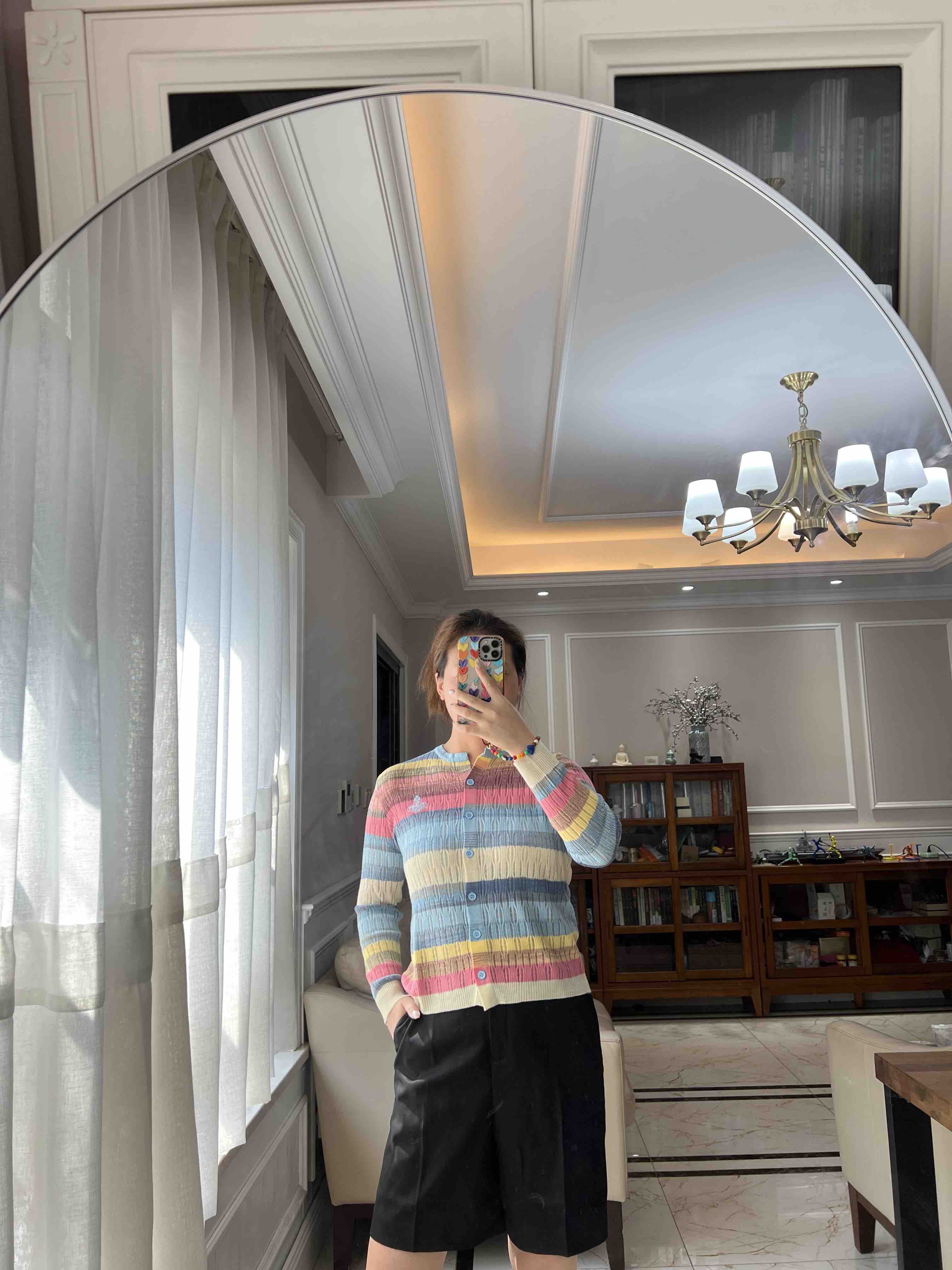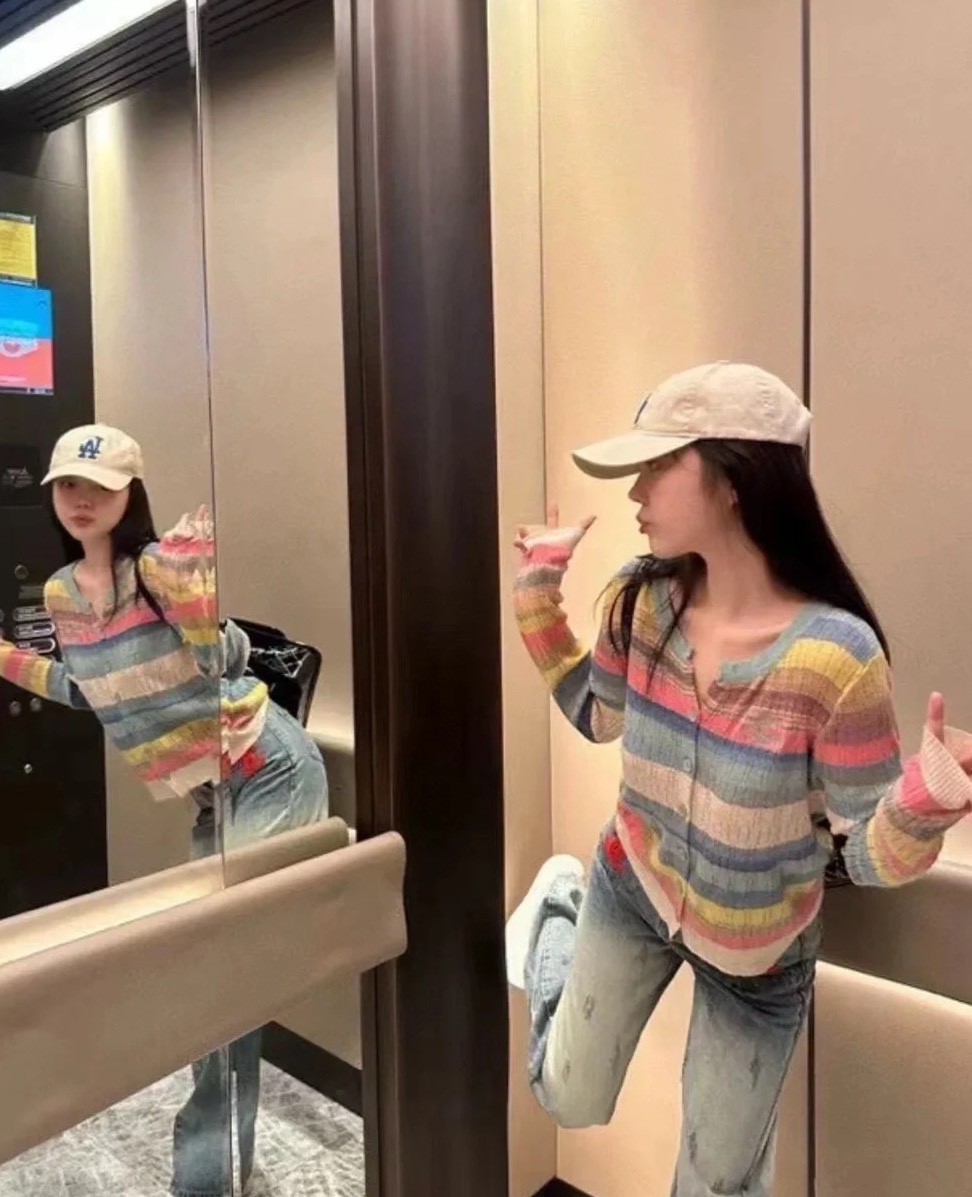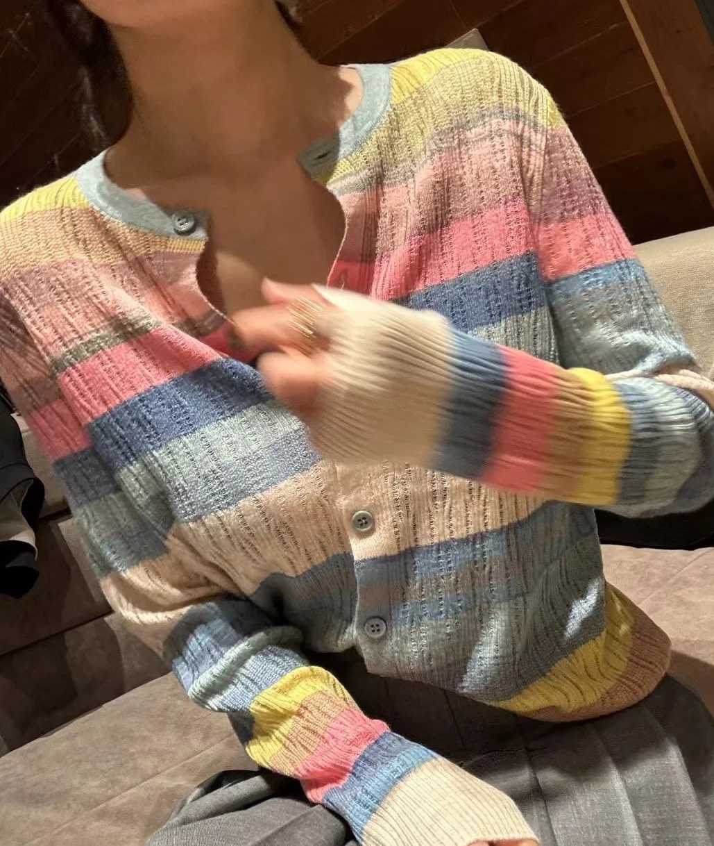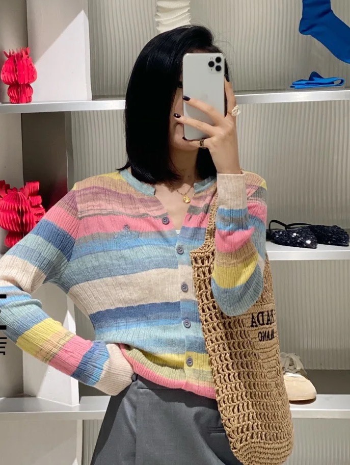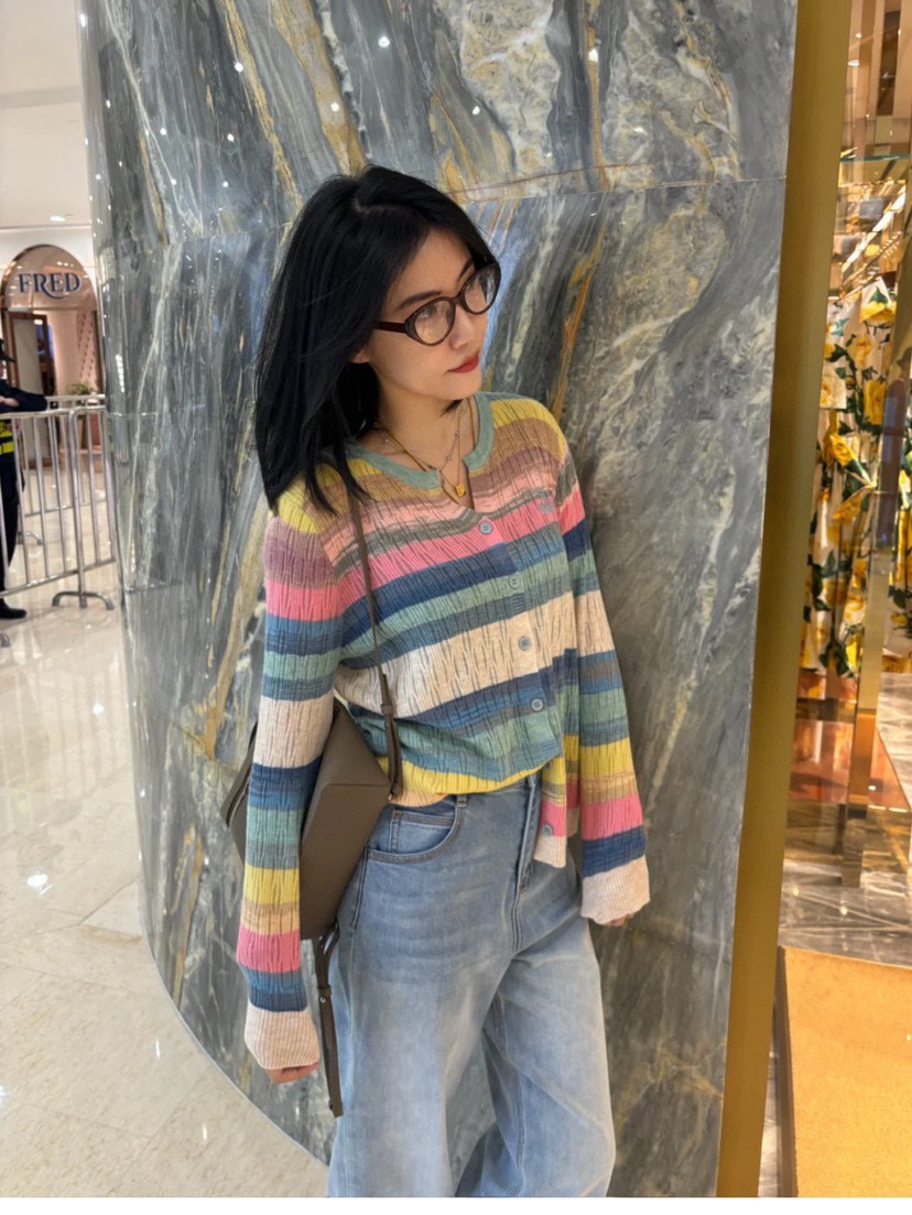 西太后土星🪐彩虹🌈多巴胺针织开衫,原厂订单纱线,有大几十件。原厂的纱线我拿到手的体感就是,怎么如此柔滑,滑溜溜的果冻质感,镂空针织彩色条纹,明媚阳光,这个配色,分外清爽黑色,因为有大面积粉蓝色和白色去平衡一丢丢粉色,所以完全不装嫩,一点点都不小气,分外大气明媚。