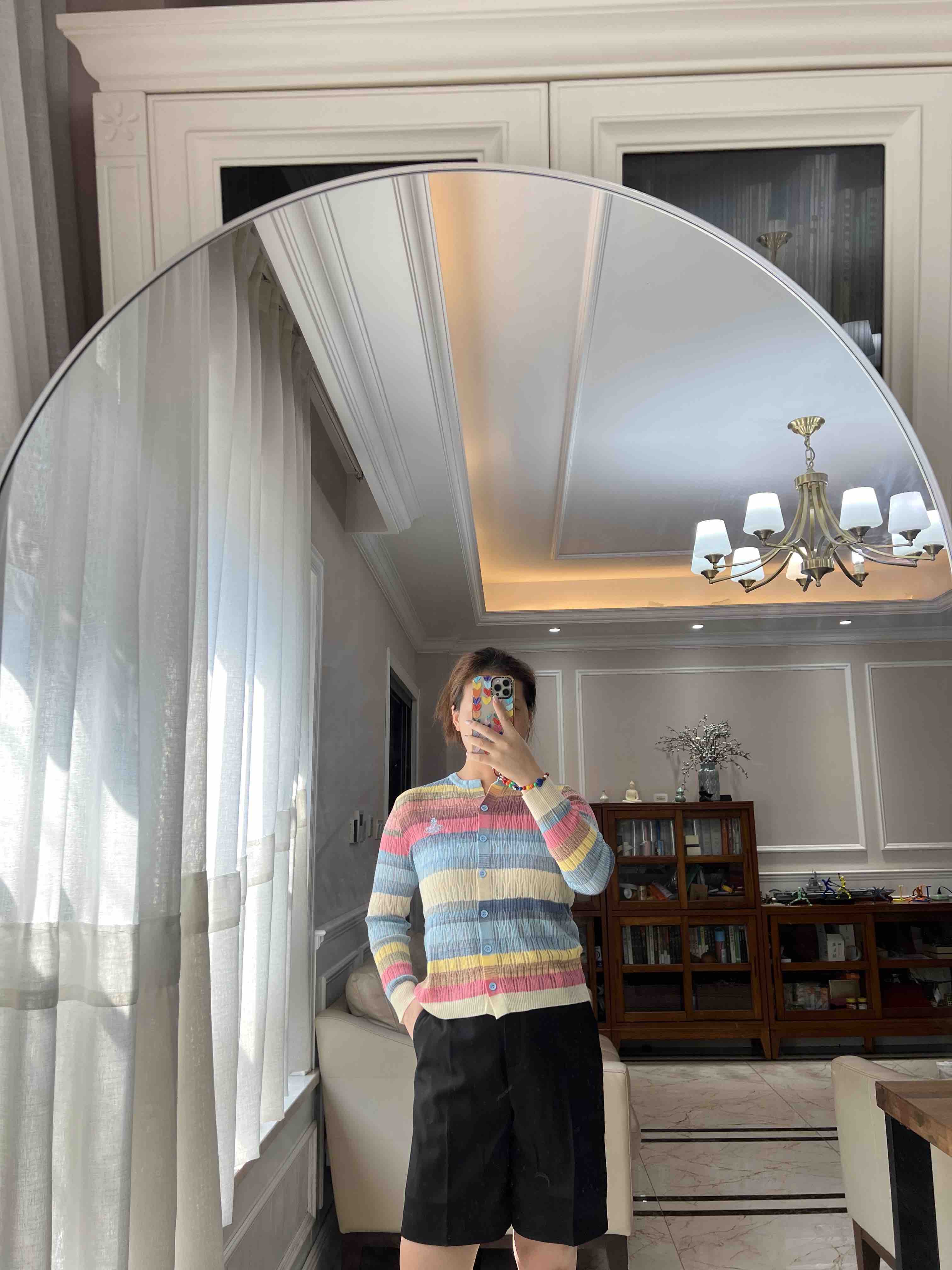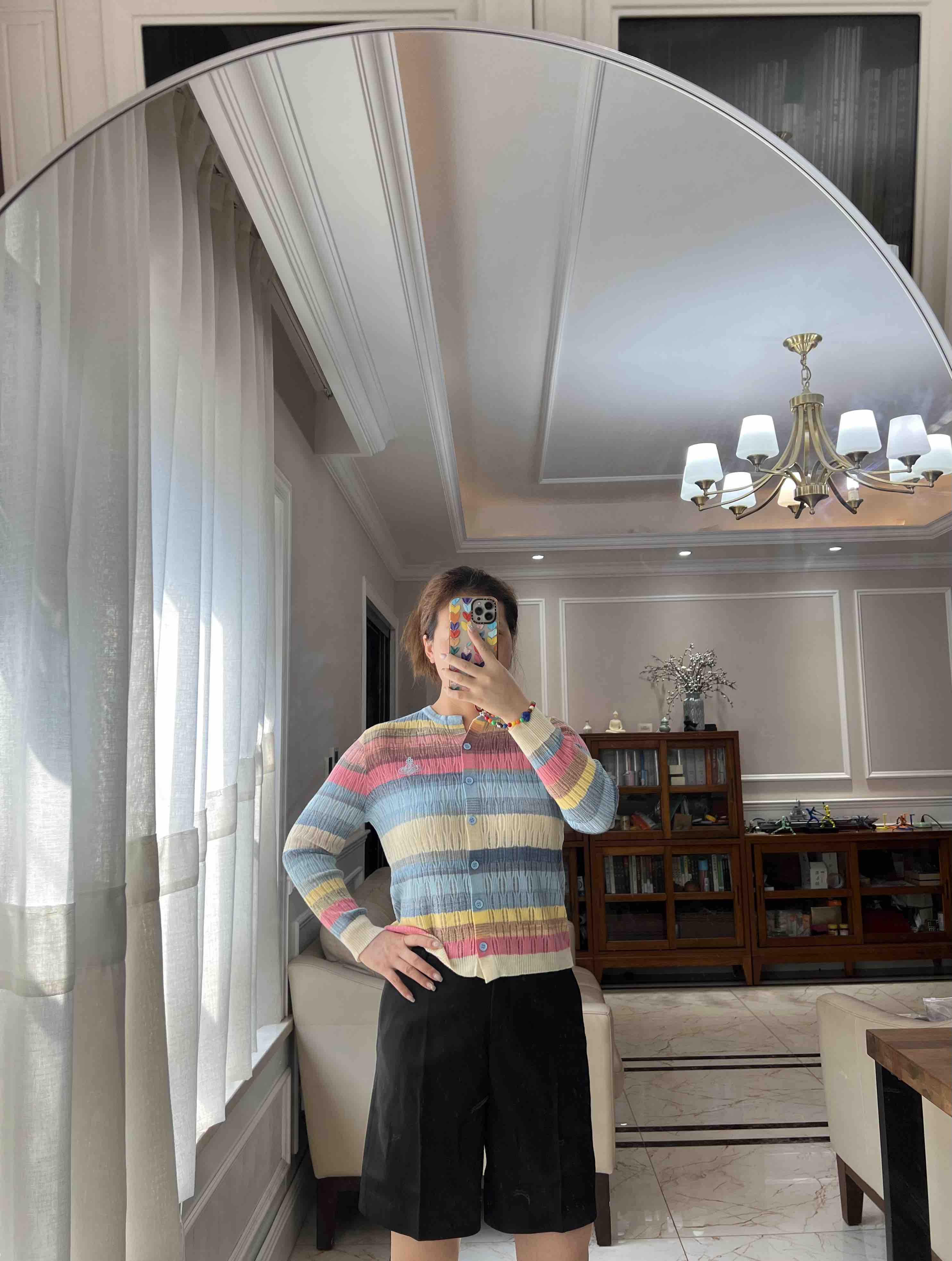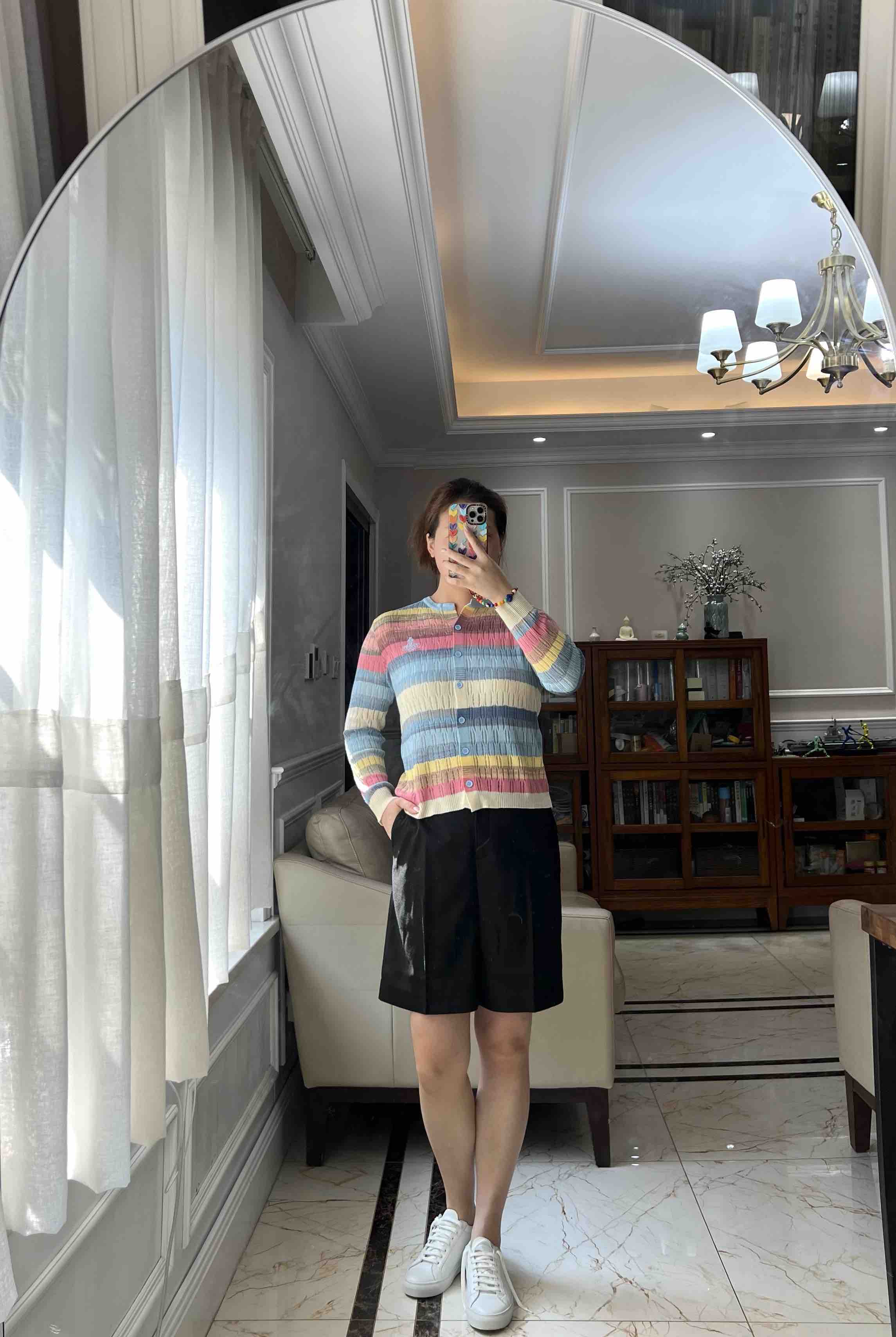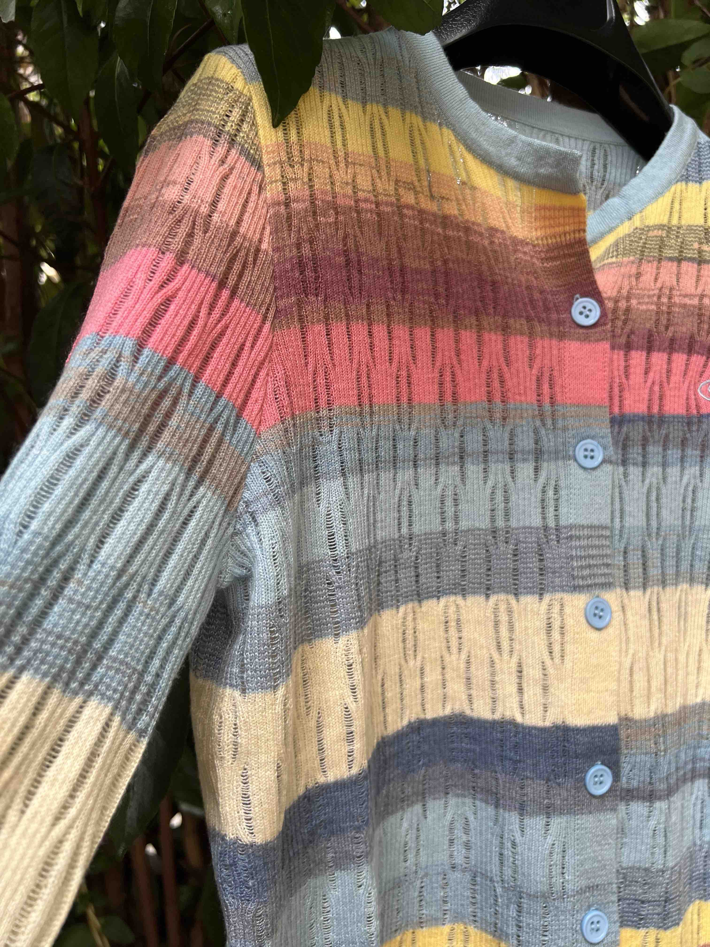 西太后土星🪐彩虹🌈多巴胺针织开衫,原厂订单纱线,有大几十件。原厂的纱线我拿到手的体感就是,怎么如此柔滑,滑溜溜的果冻质感,镂空针织彩色条纹,明媚阳光,这个配色,分外清爽黑色,因为有大面积粉蓝色和白色去平衡一丢丢粉色,所以完全不装嫩,一点点都不小气,分外大气明媚。