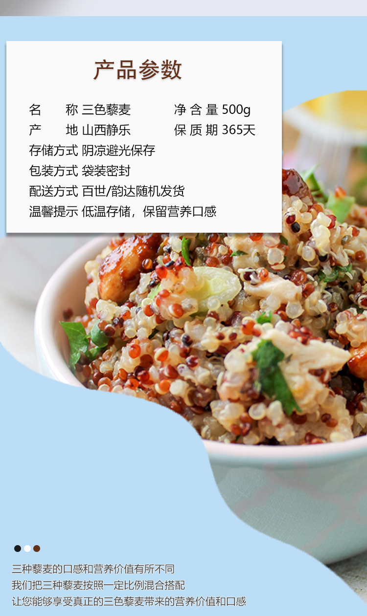 产品规格:三色藜麦500g.三色藜麦500g*2.三色藜麦500g*3(如购买多件分多个包裹发出,可能会前后陆续到货)