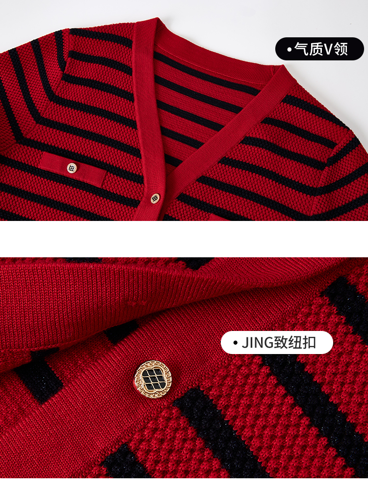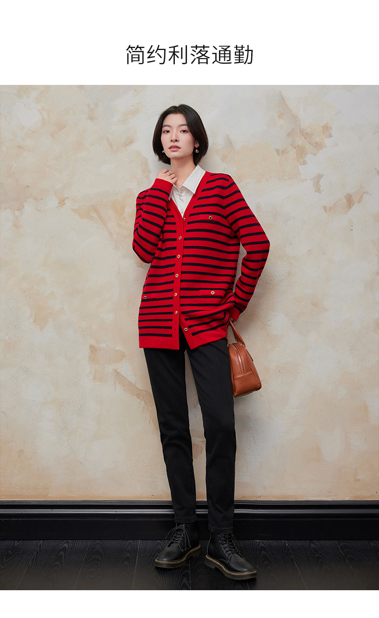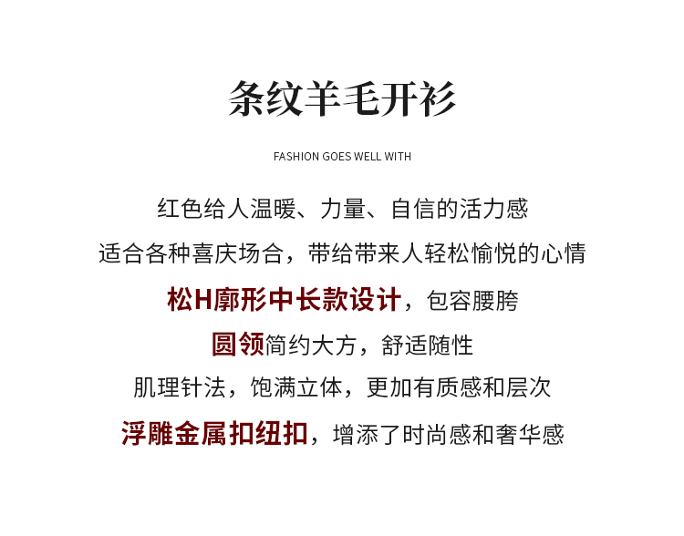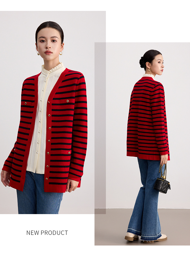 【商场同款】CNR4A97“经典条纹开衫”氛围感红色轻松愉悦 松H廓形中长款包容腰胯 浮雕金属扣增添时尚奢华感 肌理感针法有质感 羊毛开衫