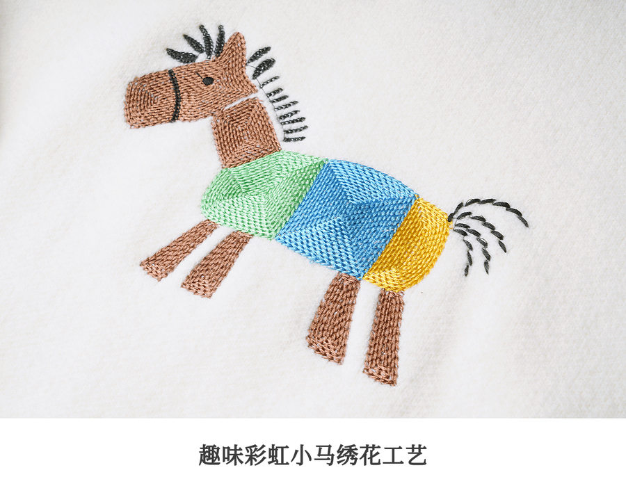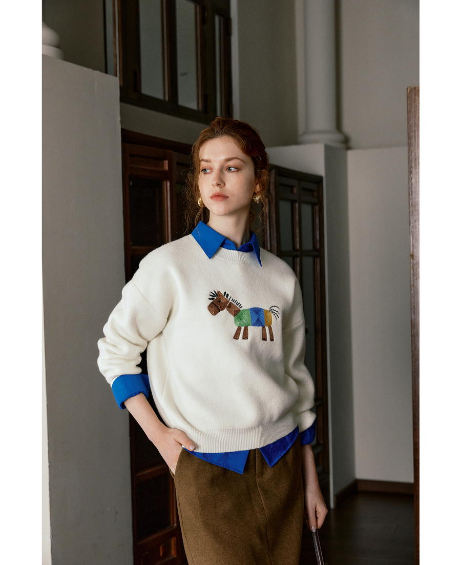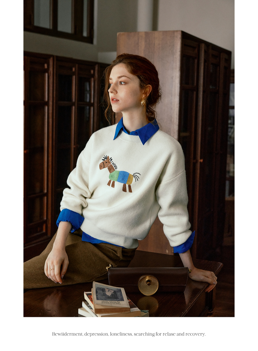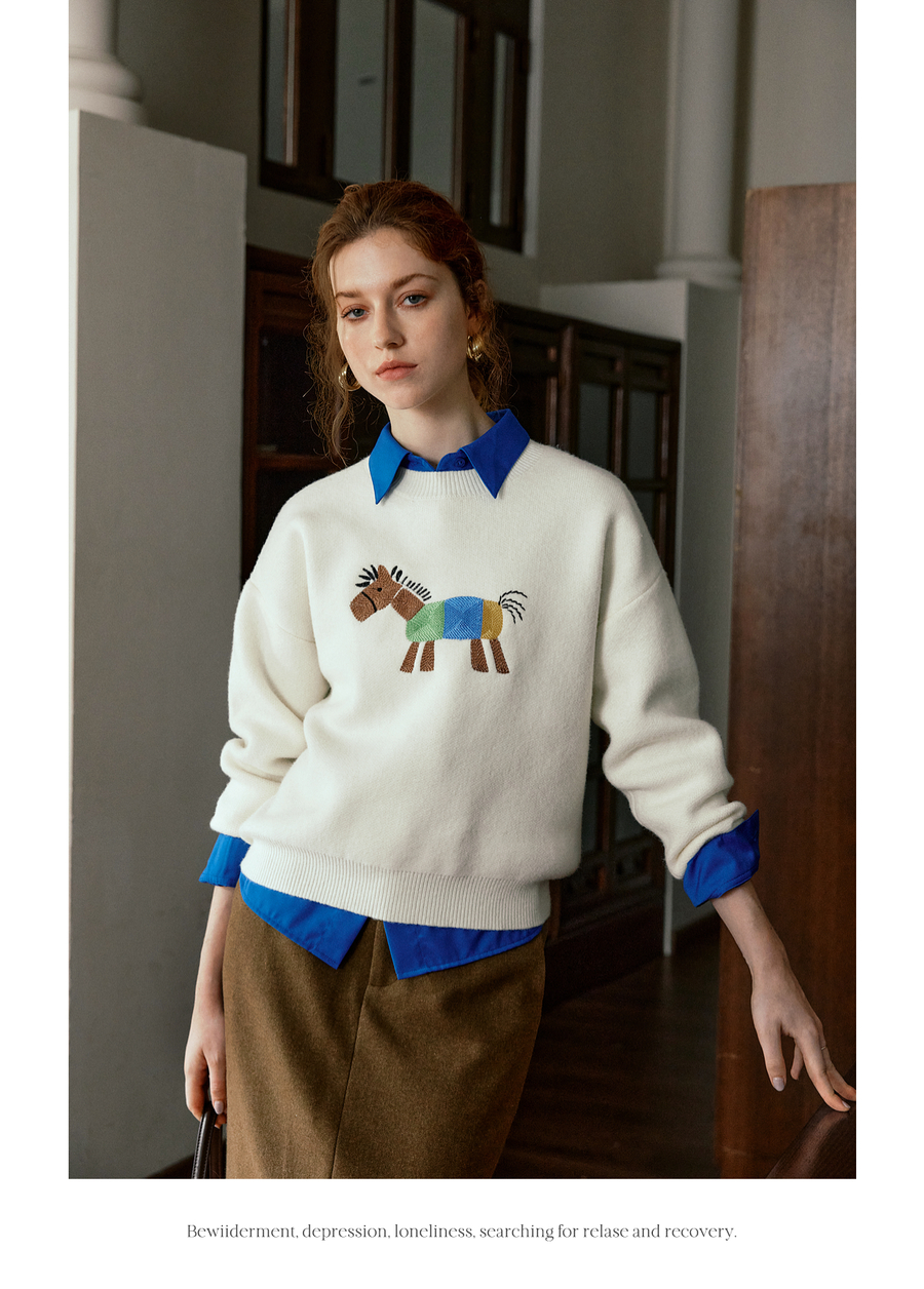 OLrain欧芮儿趣味小马绣花毛织套头衫女秋季2025新款慵懒羊毛上衣