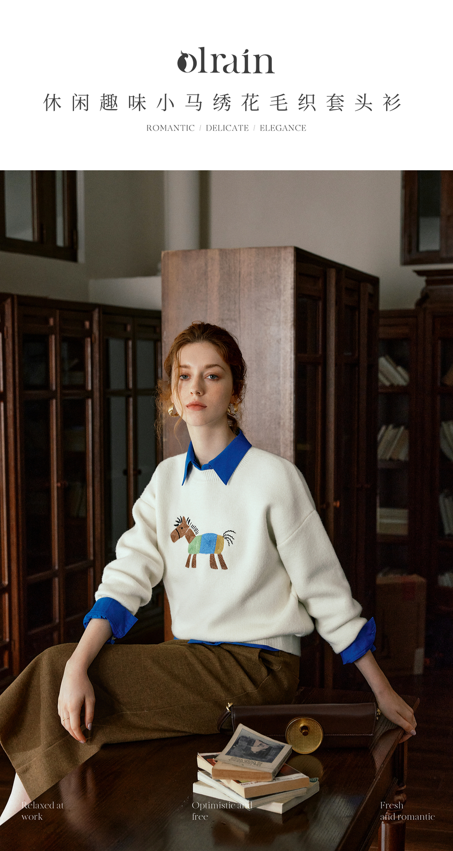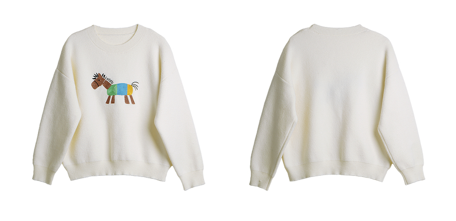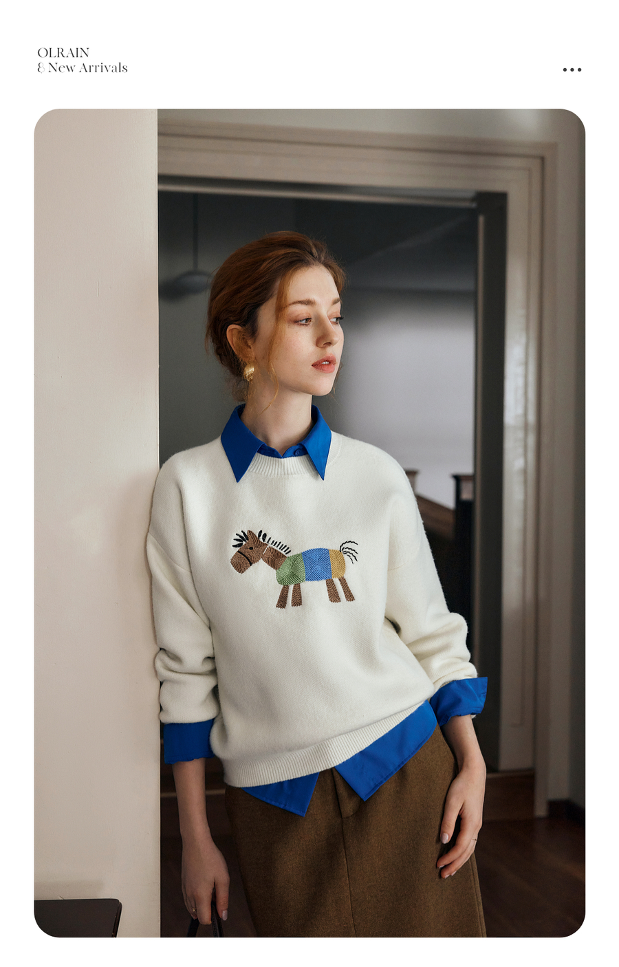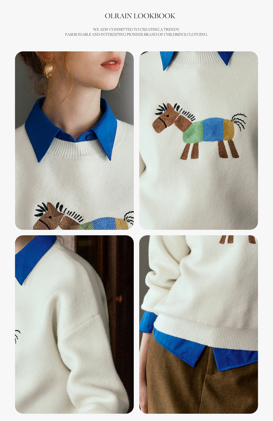 OLrain欧芮儿趣味小马绣花毛织套头衫女秋季2025新款慵懒羊毛上衣