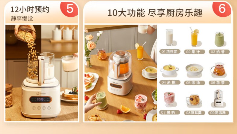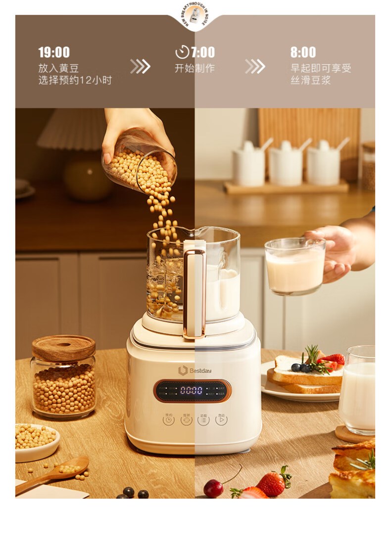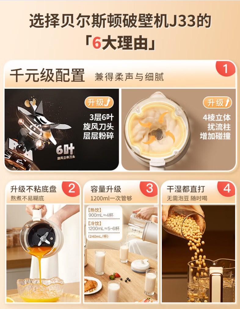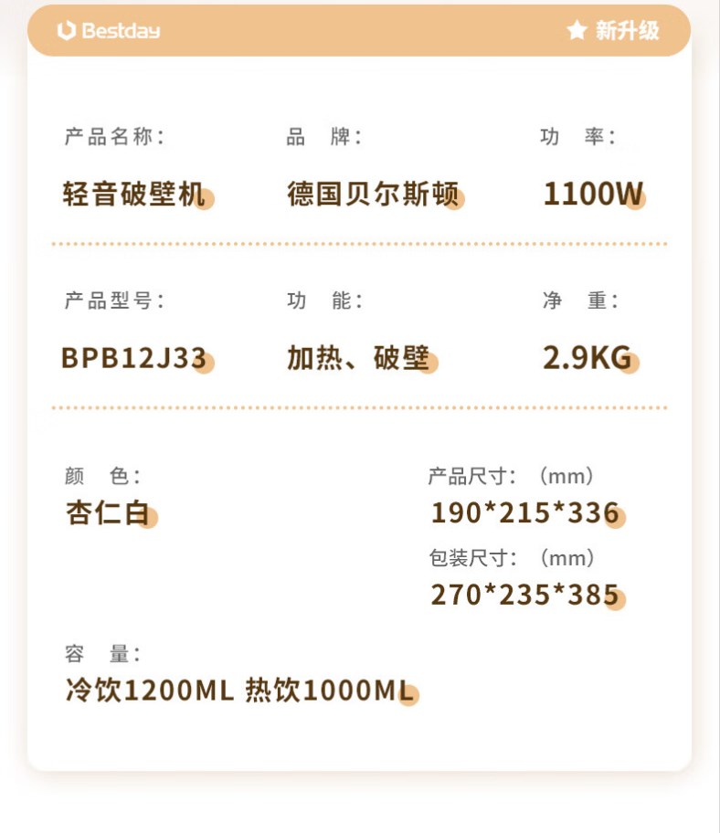 【超静柔音破壁机】贝尔斯顿(Bestday)超静柔音破壁机家用全自动豆浆机加热降噪榨汁机搅拌机 米色