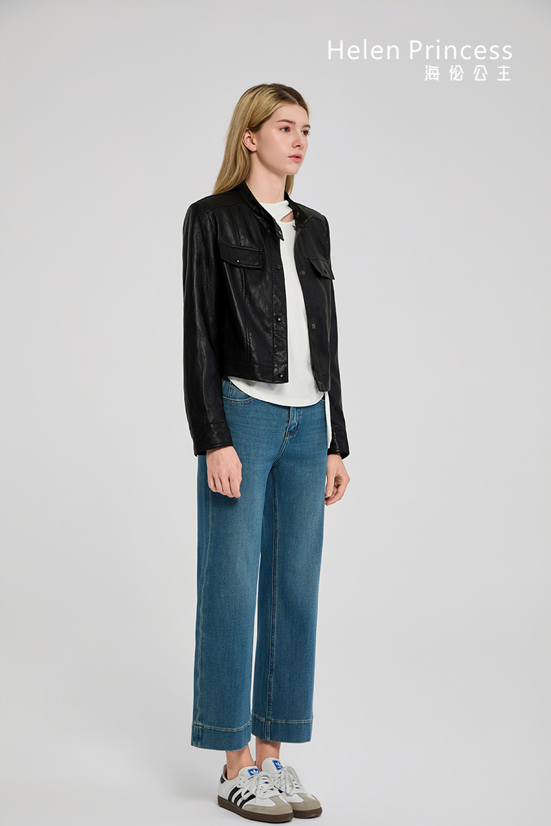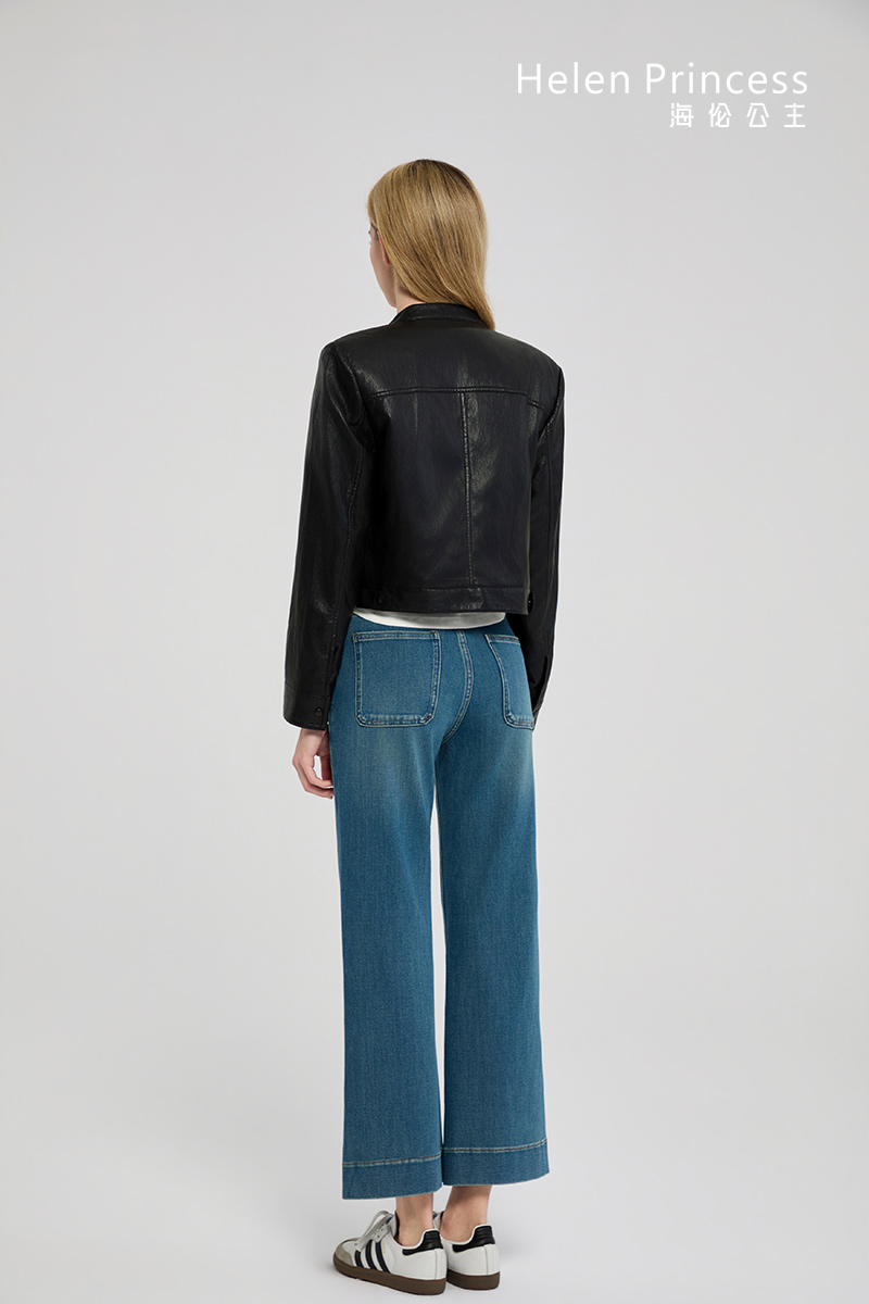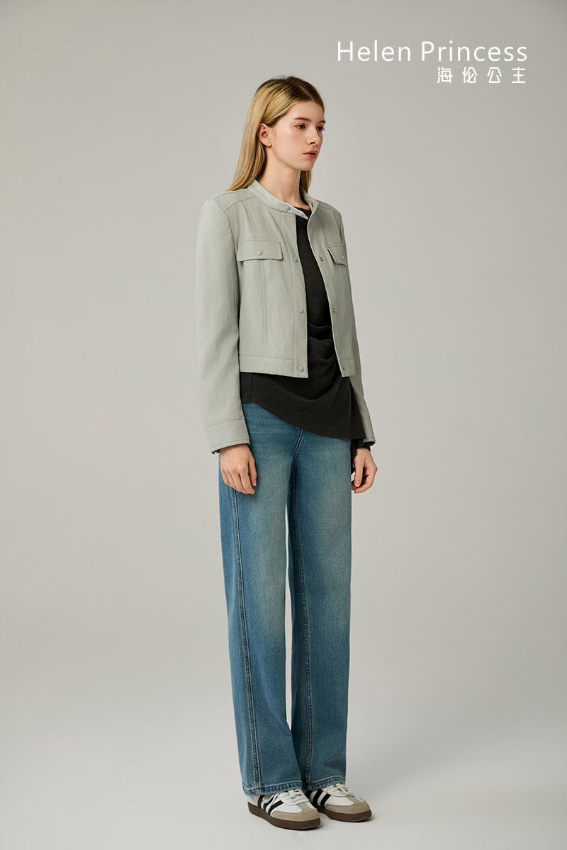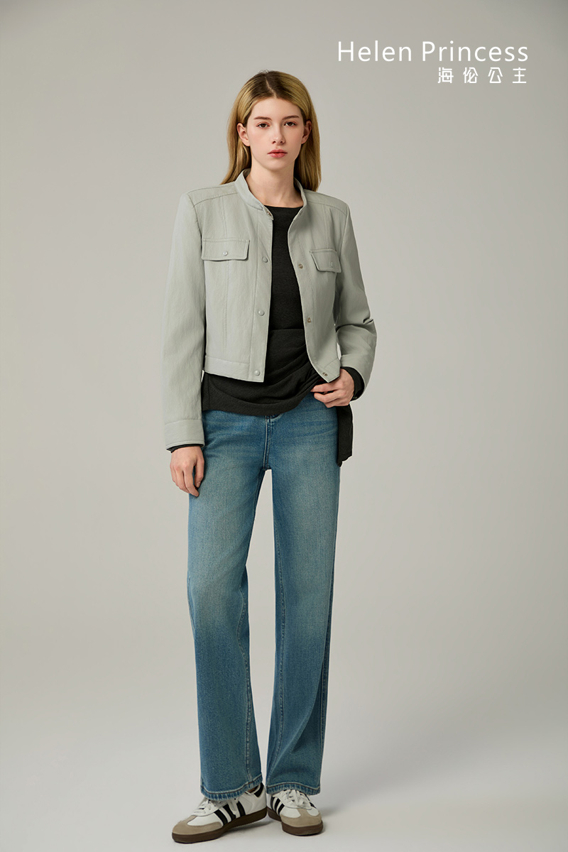 经典小立领勾勒干净修长的肩颈比例,搭配哑面同色扣饰,凸显简洁利落的时尚品味。正肩短款版型重塑身材比例,展现干练气场的同时更显腿长。