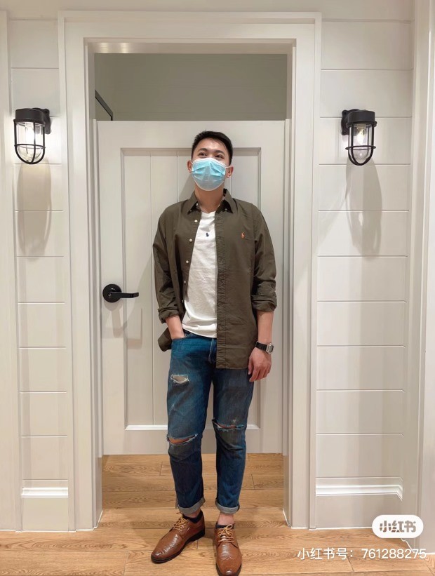 跟他类似身形的爷们 重点考虑衣长 如穿大 卷袖效果更好