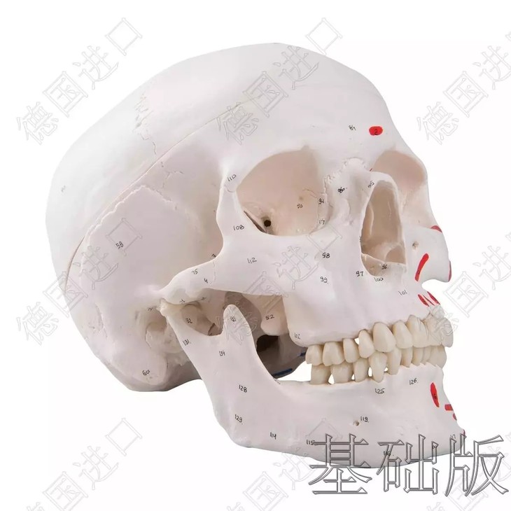 此模型为医生和教师用于展示、教学、实践的理想选择。左半边头颅用色彩标明,肌底端(红色)和附着肌(蓝色)。右半边用数字标明颅骨和结构。此颅模型逼真再现了140多个解剖细节。
