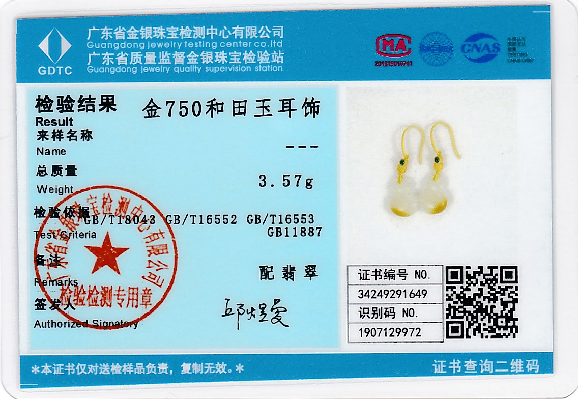 18K古法黄金和田玉(白玉)耳饰