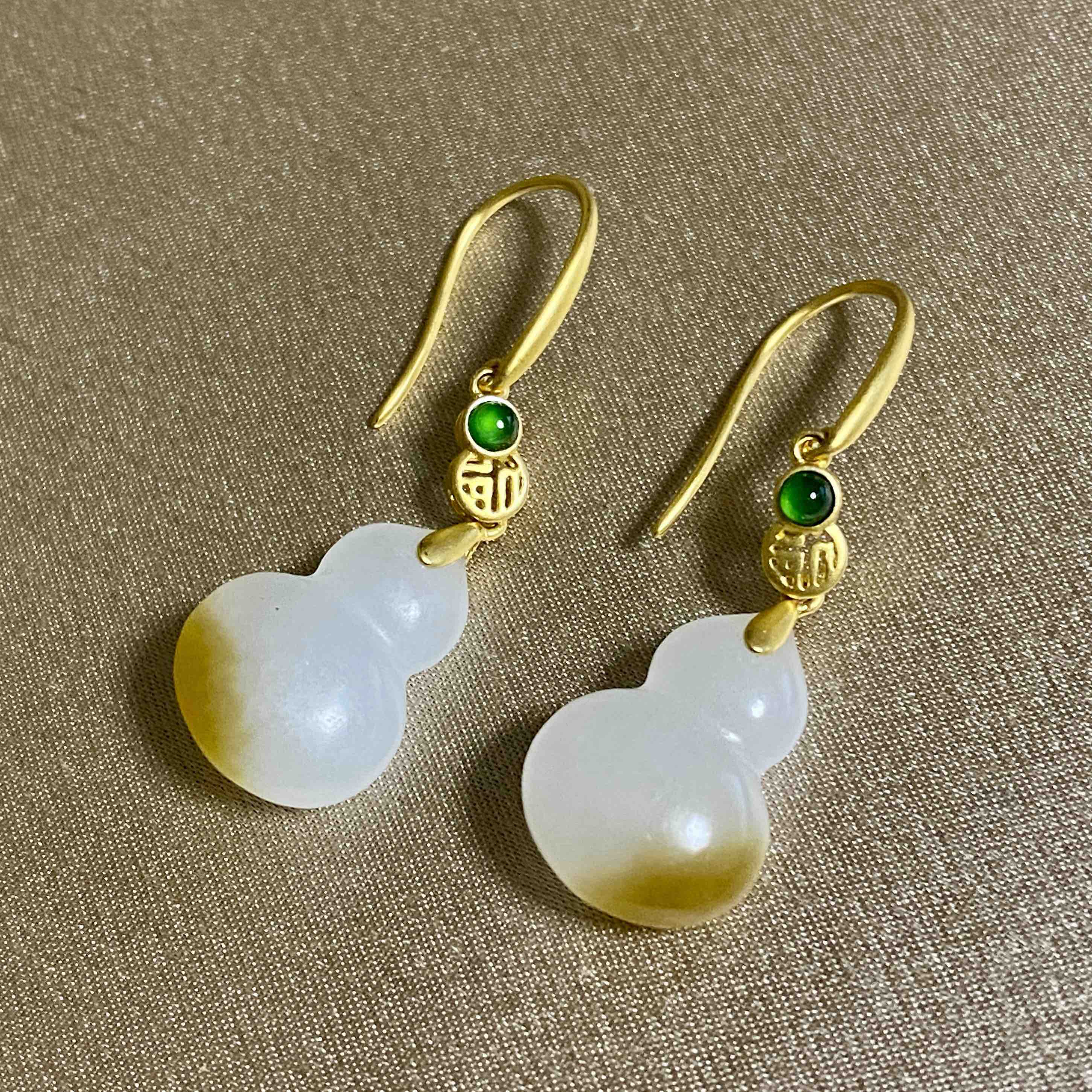 18K古法黄金和田玉俄料(白玉)葫芦耳饰/双面葫芦11*15.5mm/总长35mm/伴镶翡翠