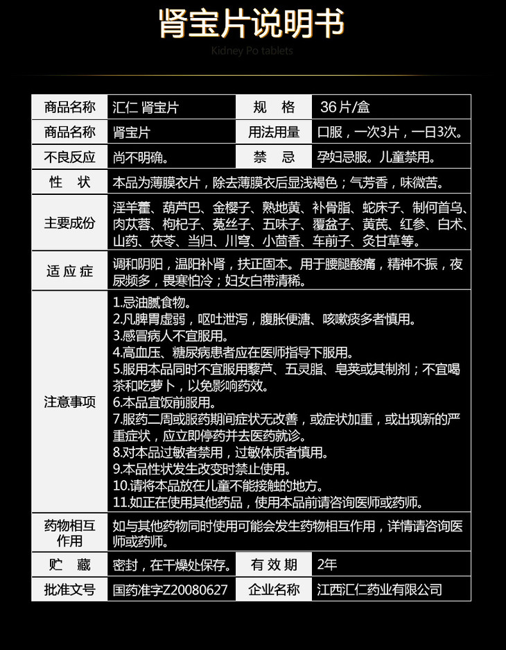 汇仁 肾宝片 36片 调和阴阳男女肾虚亏阴阳虚 温阳补肾药品 1盒(36片装)