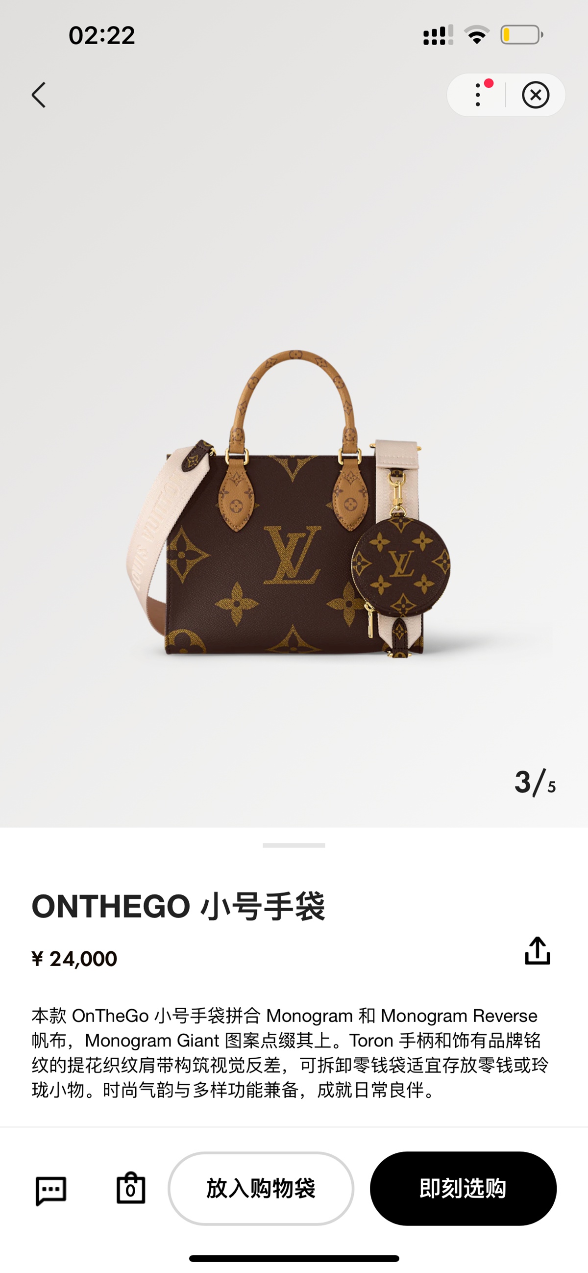 ONTHEGO这两年算是一包难求,在国内居然还要配货才能买了。价格一直飞涨,小号这款是24000,中号那只更是26800。