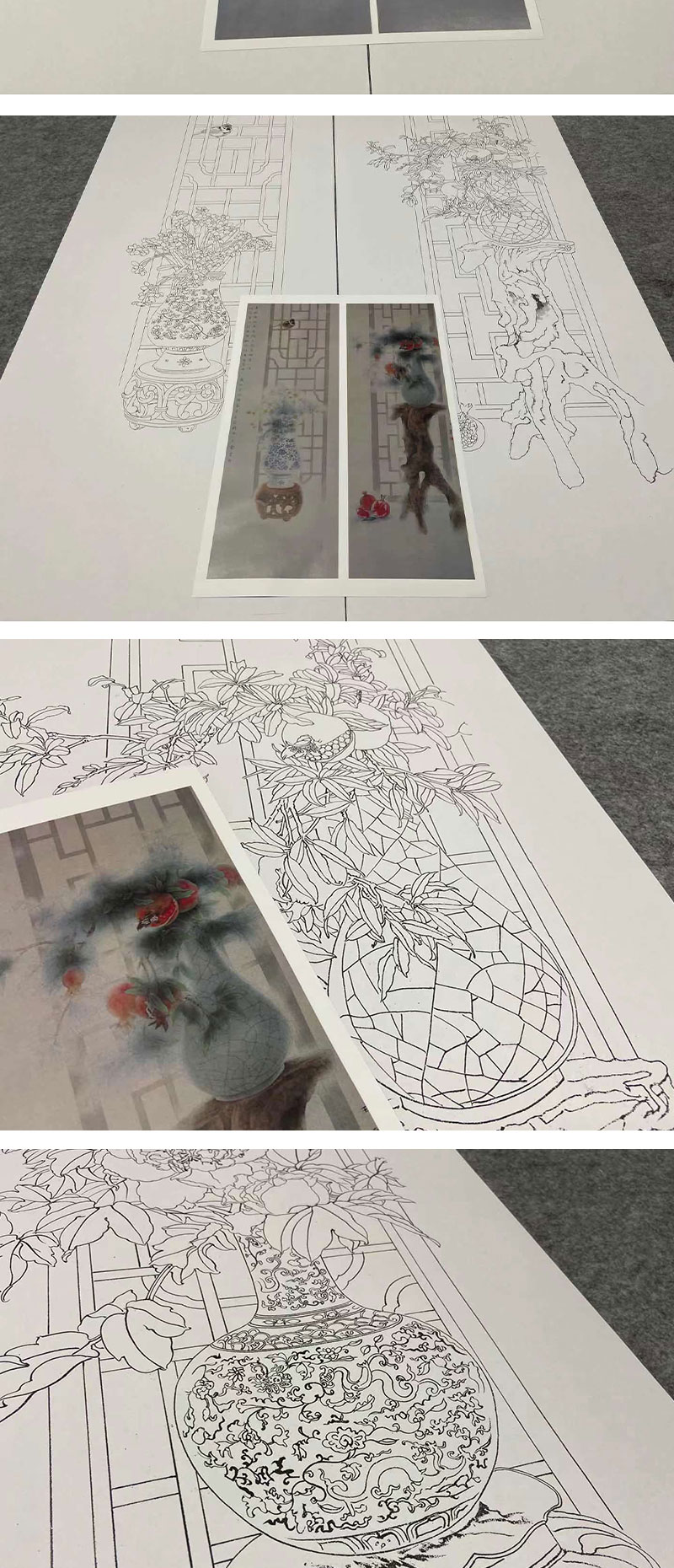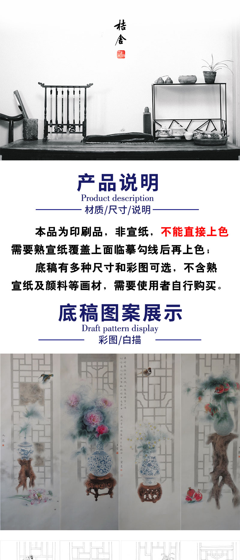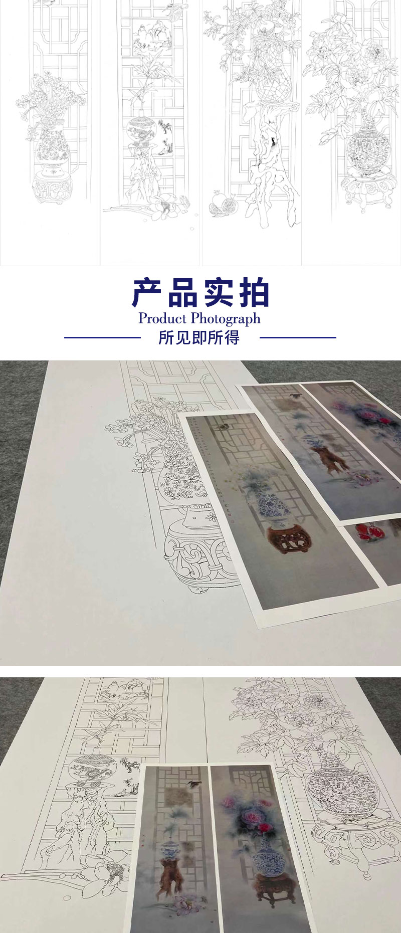 【四条屏】工笔画白描底稿《只此浮生》没骨画花瓶图临摹勾线高清打印稿WZ55