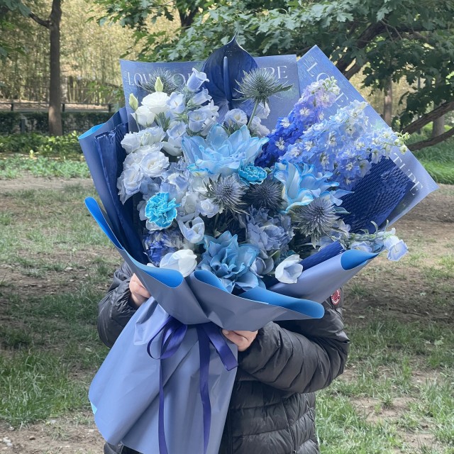 精选花材:蓝色重瓣百合,蓝刺芹,蓝色大花飞燕草,蓝玫瑰,蓝色洋桔梗(喷色)