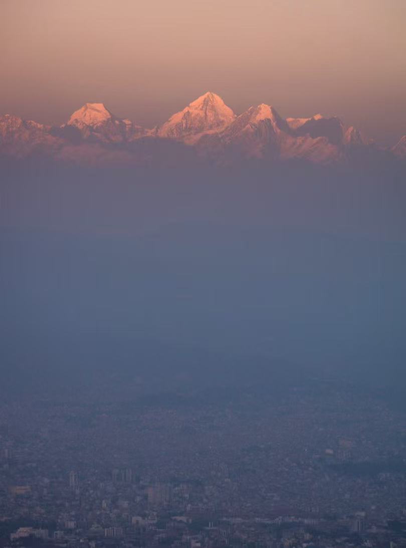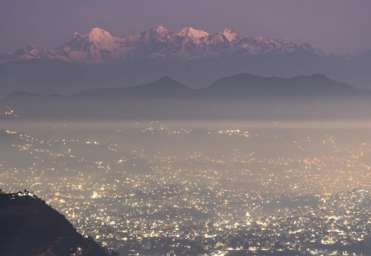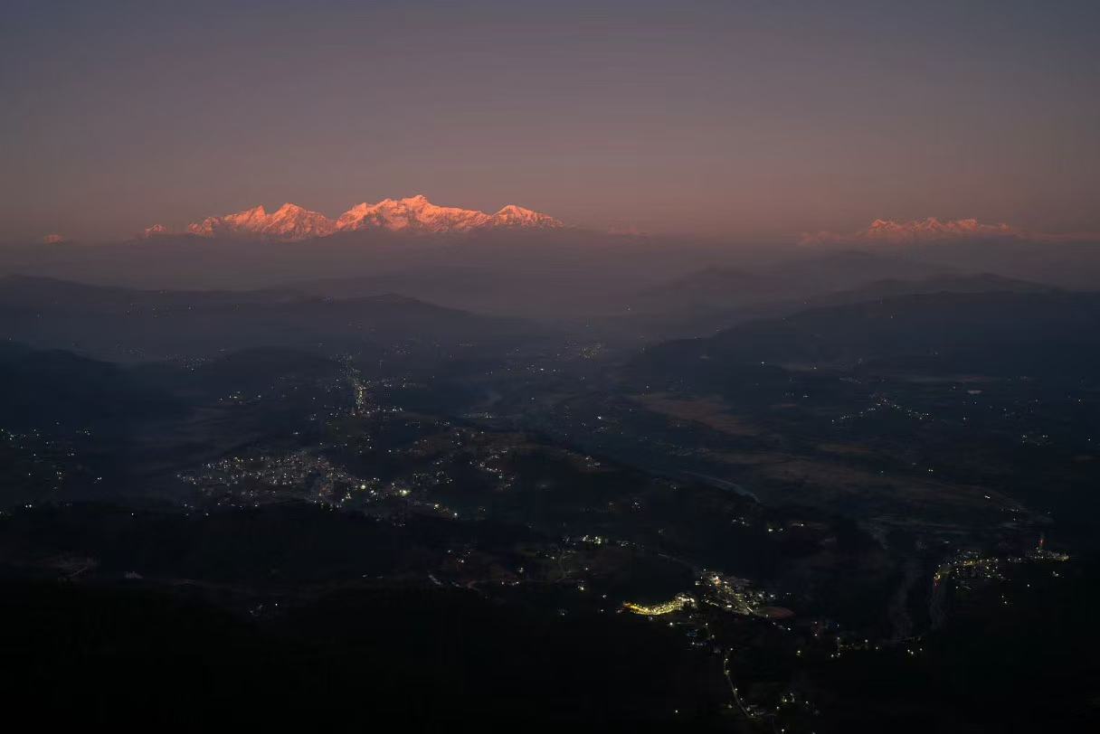 各地乘坐飞机前往加德满都,下午4点加德满都机场集合出发,喜马拉雅雪山日落金山前景是城市和加德满都全景夜景。