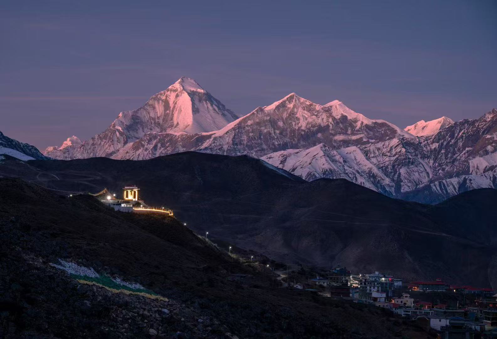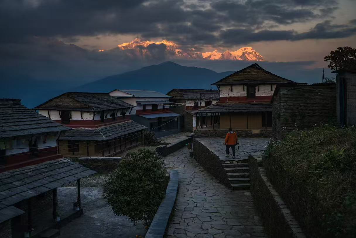 早上拍摄马纳斯鲁雪山。沿途村寨拍摄,田园风光与喜马拉雅雪山的组合,拍经典建筑与雪山组合的日落及蓝调。