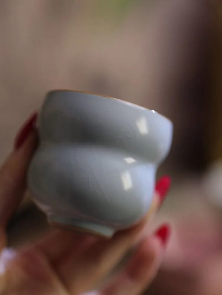 普通茶杯都是圆形的、方形的,但这个汝窑杯是带有国人喜欢的形状:葫芦、元宝、竹节、梅花、蟠桃。