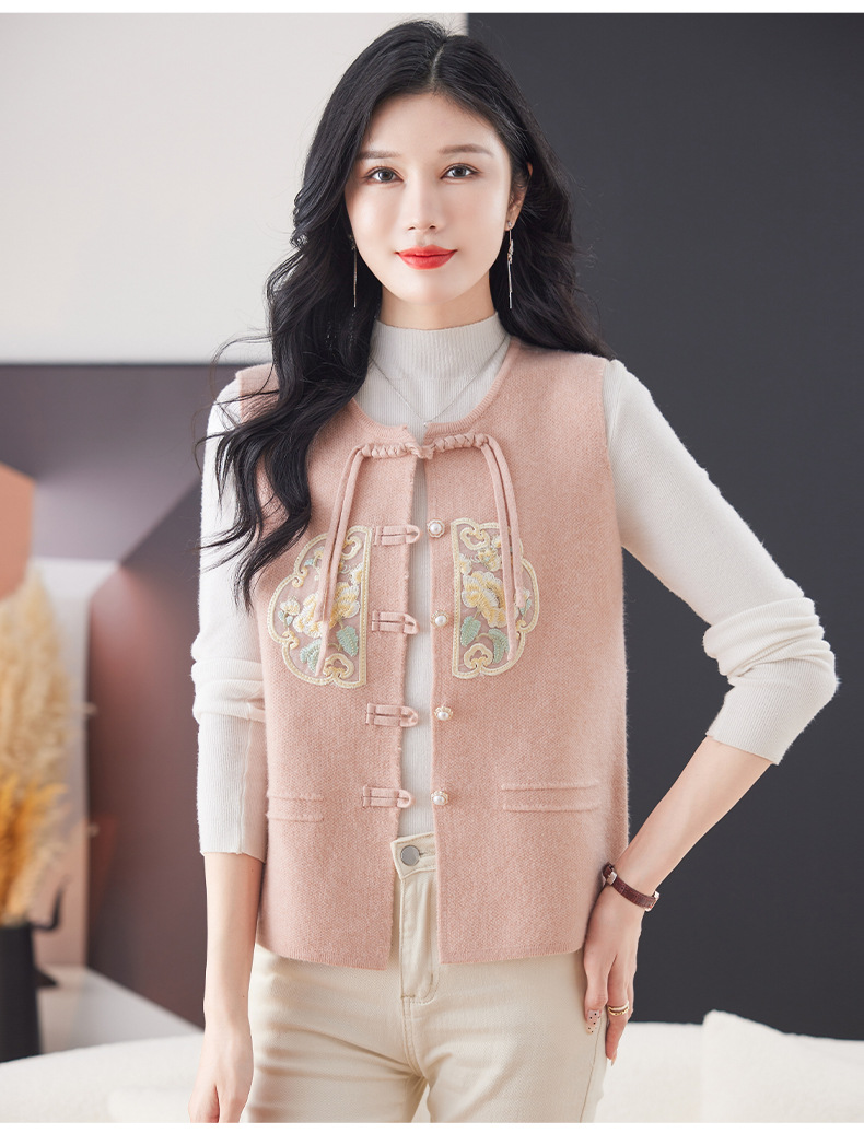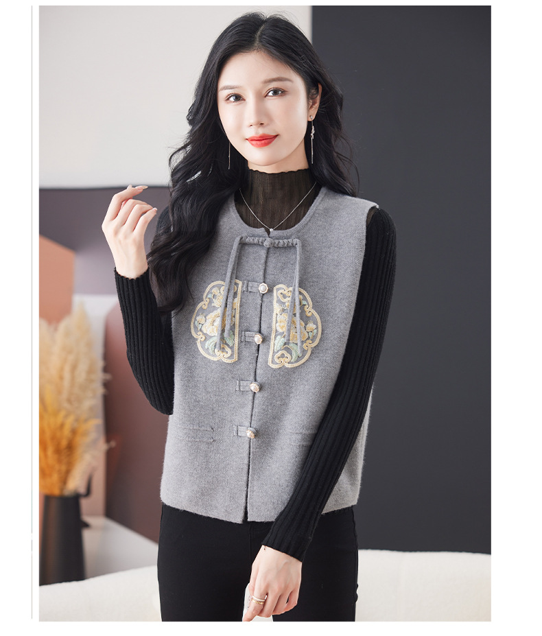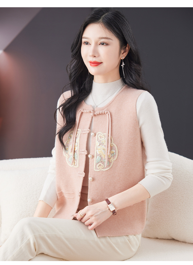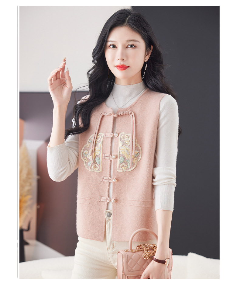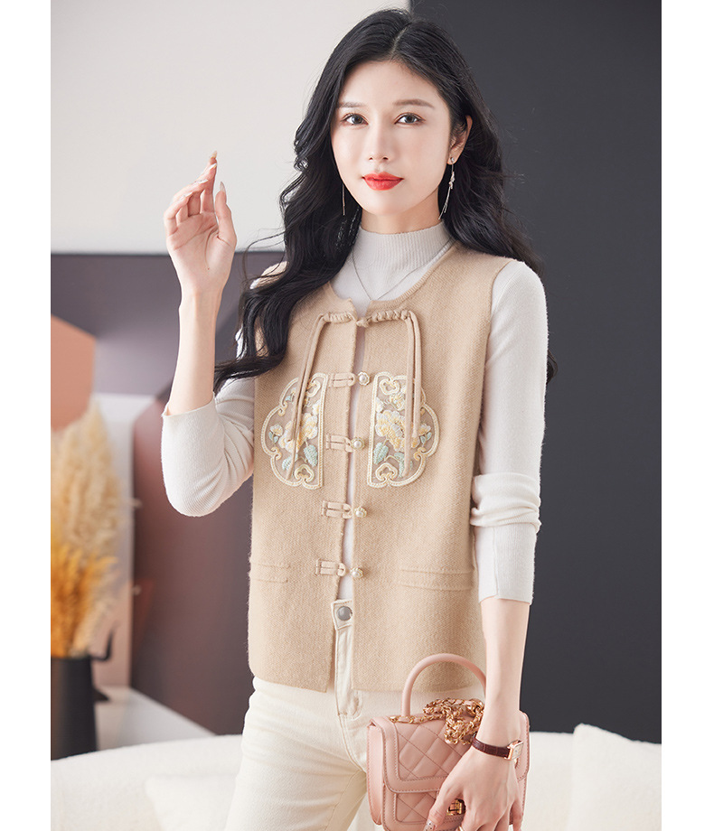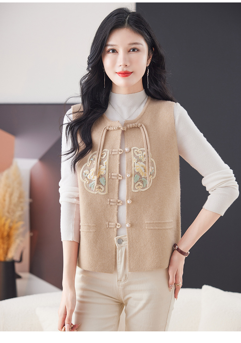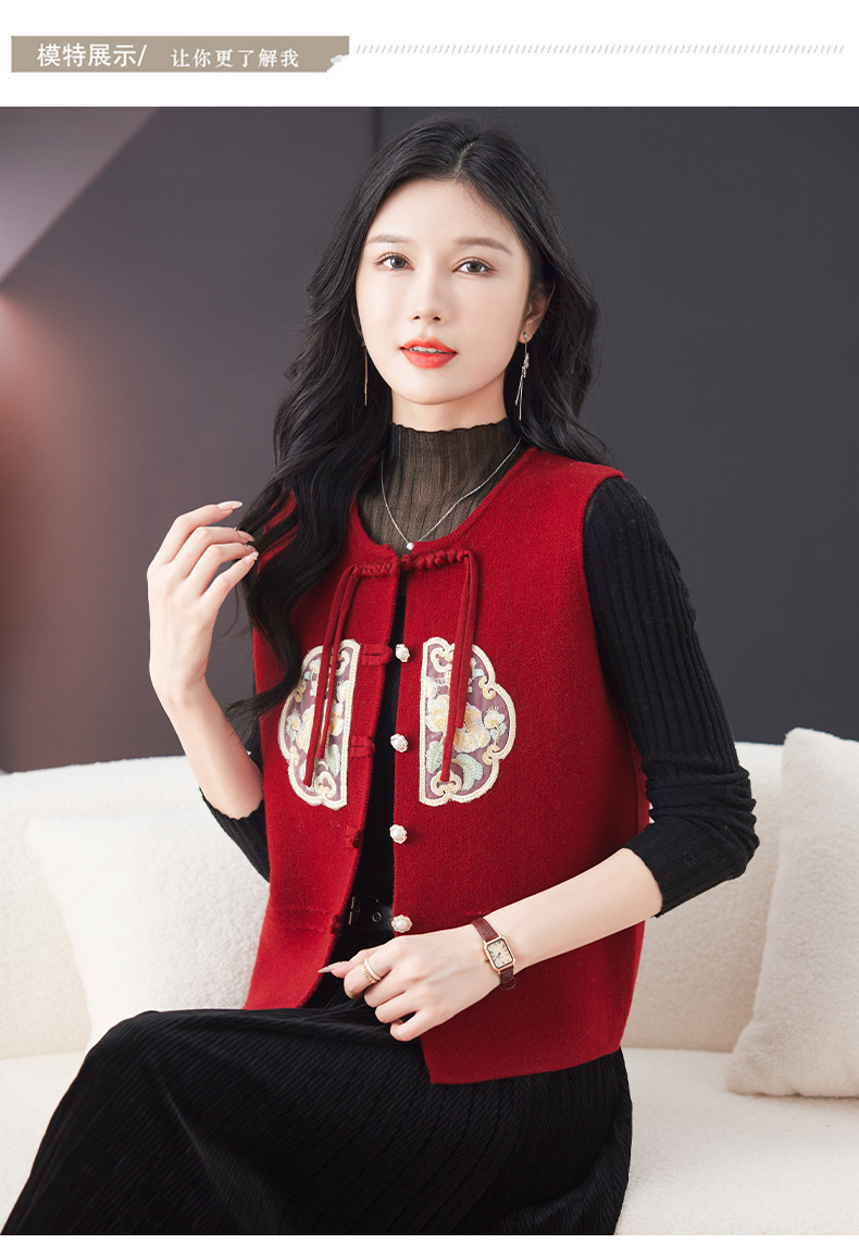 CC-9-6925新中式盘扣刺绣针织马甲开衫女春秋短款宽松无袖外穿毛衣外套上衣