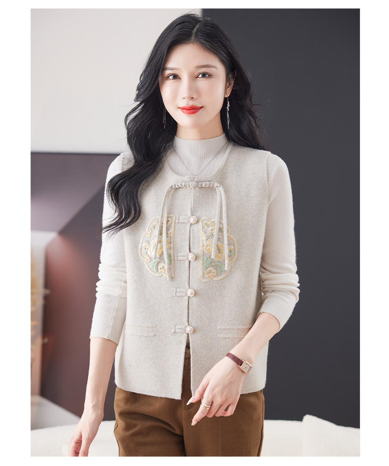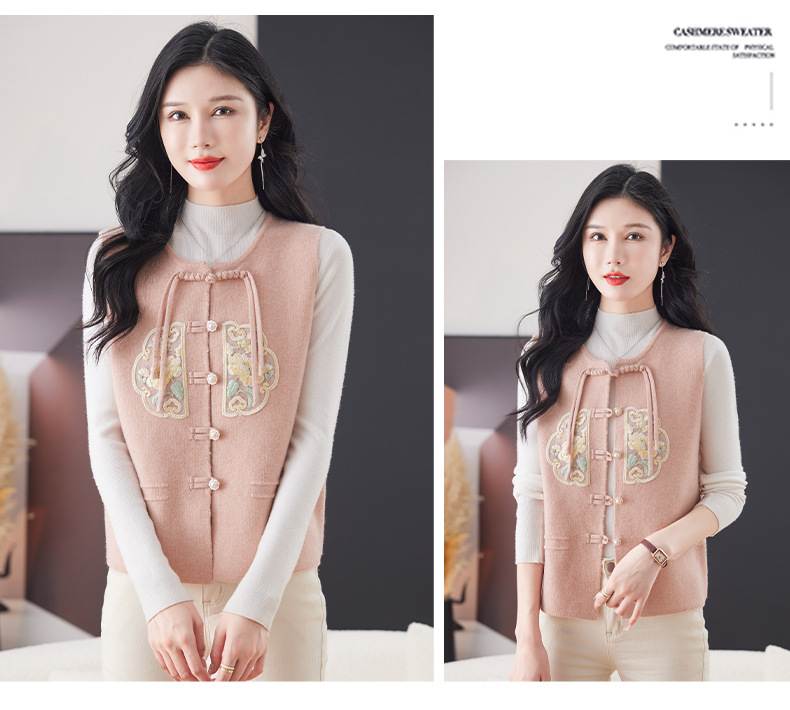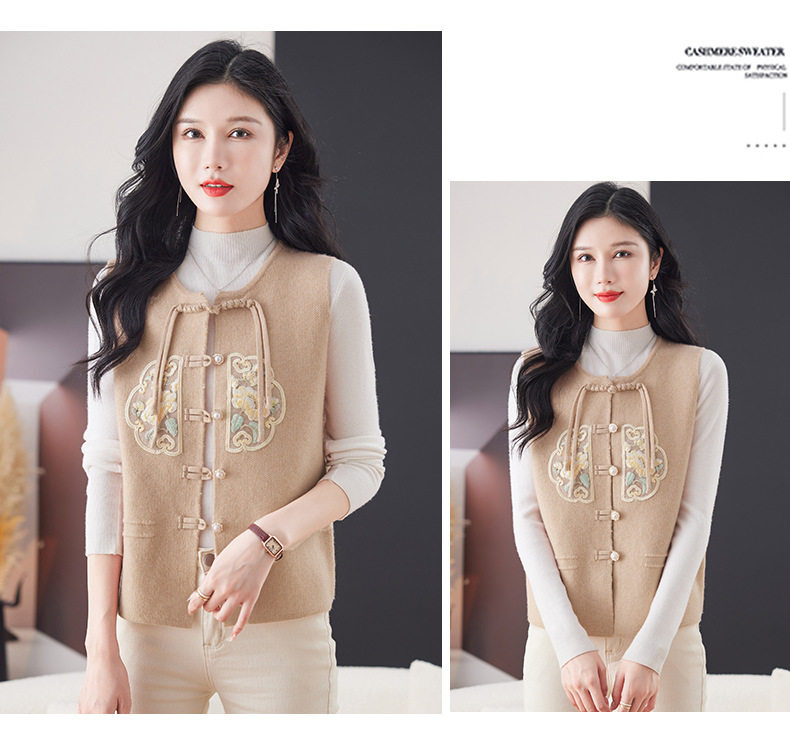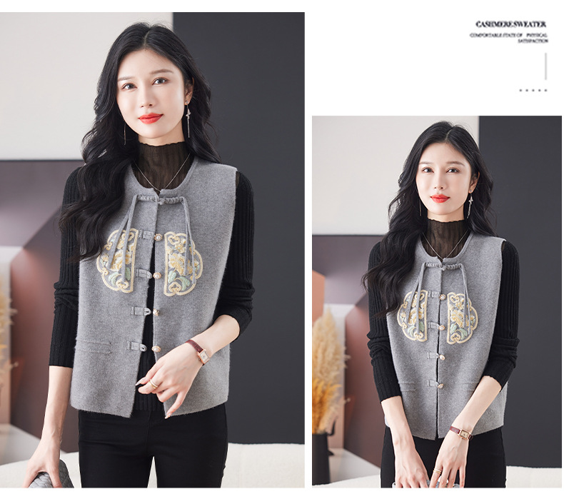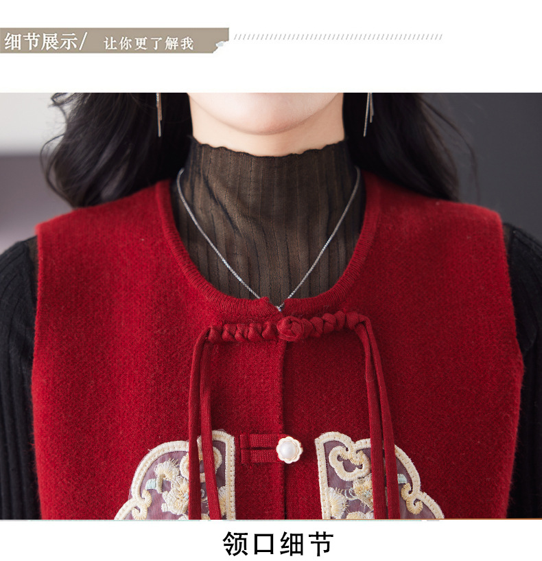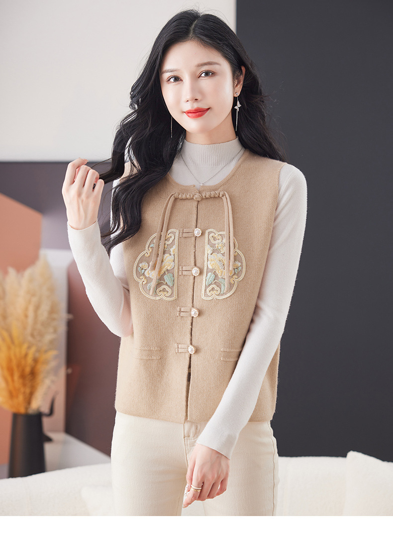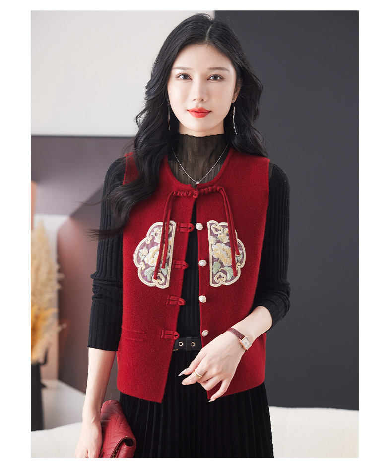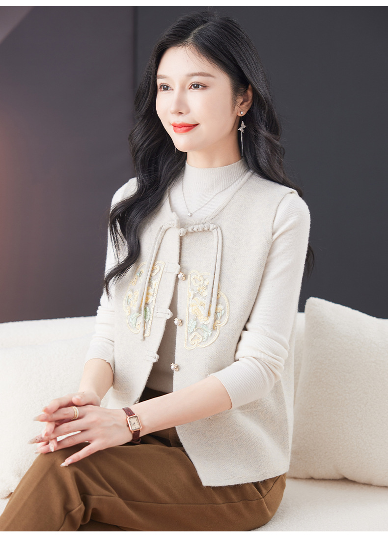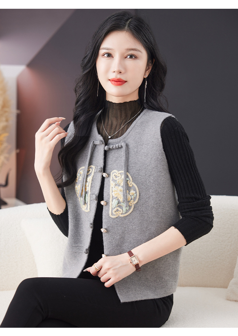 CC-9-6925新中式盘扣刺绣针织马甲开衫女春秋短款宽松无袖外穿毛衣外套上衣