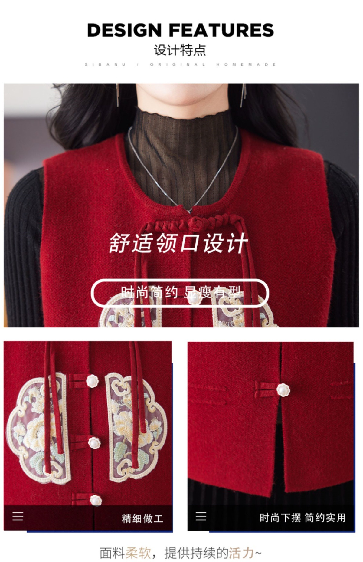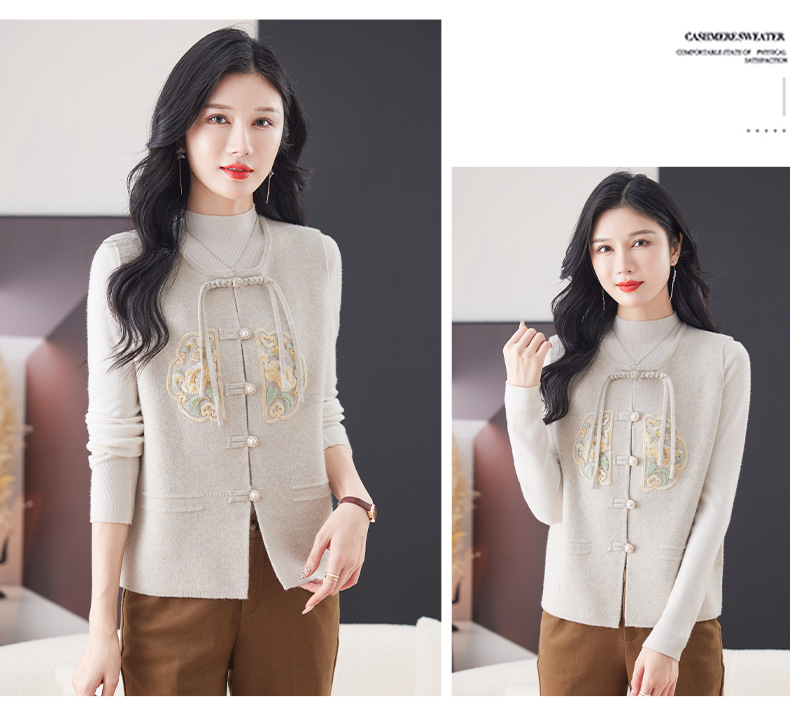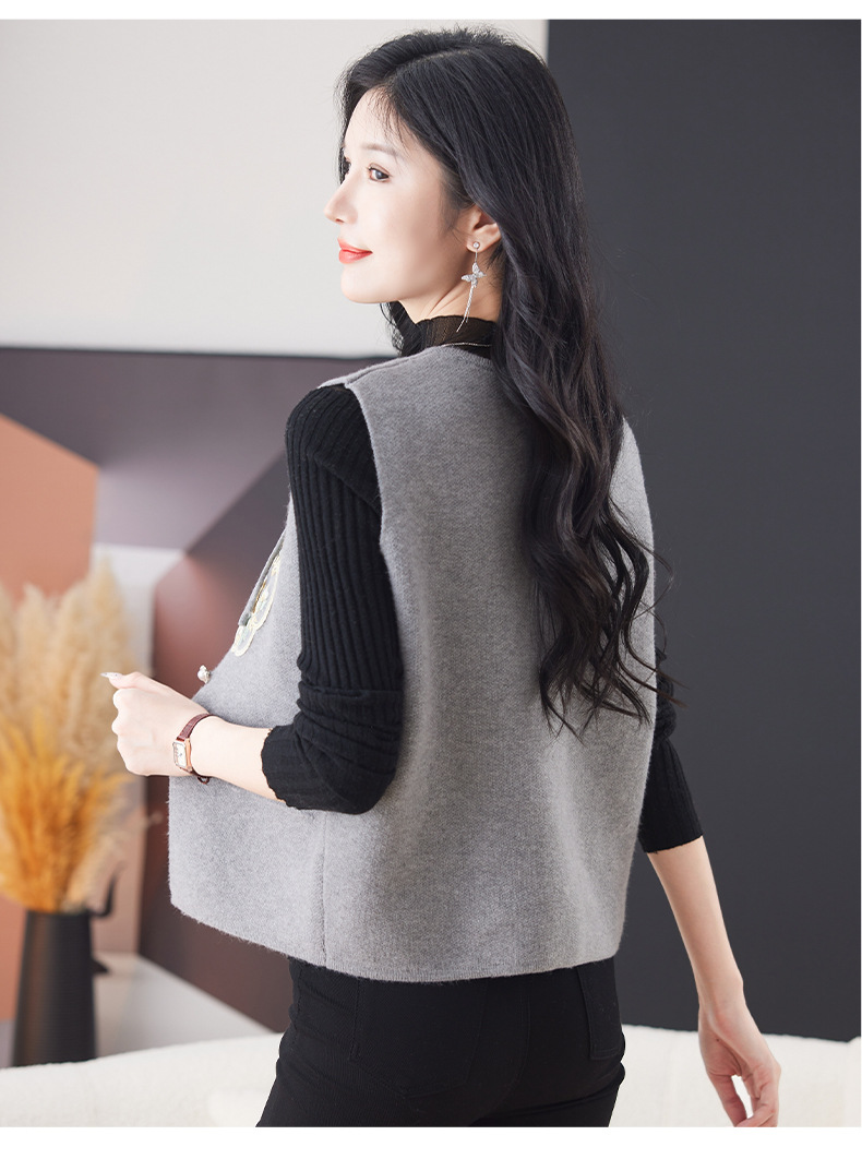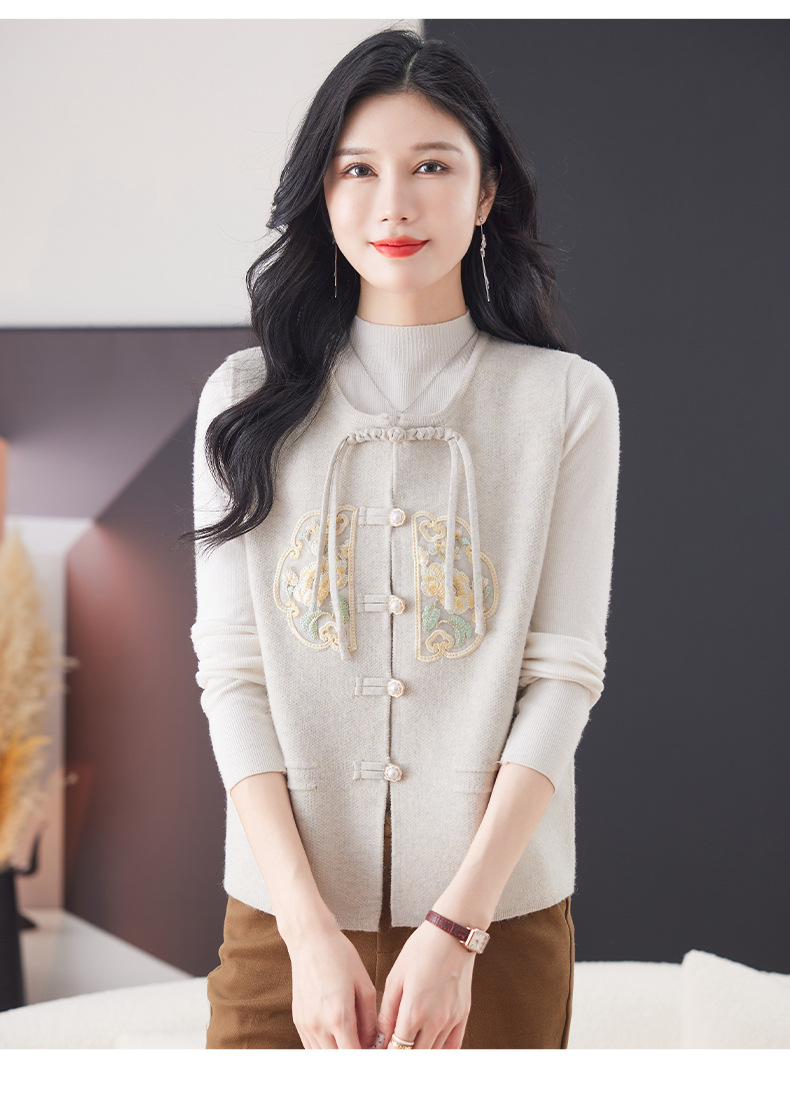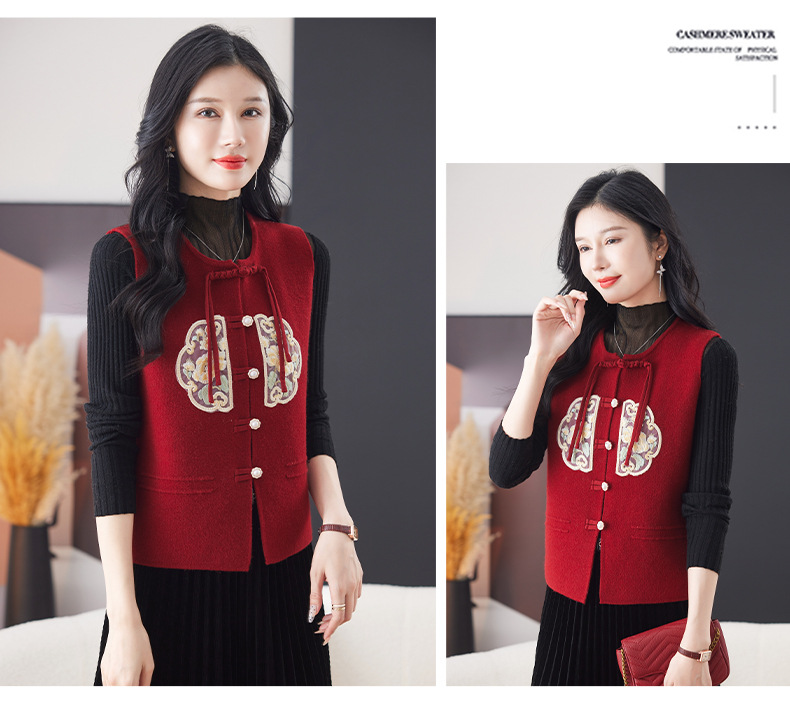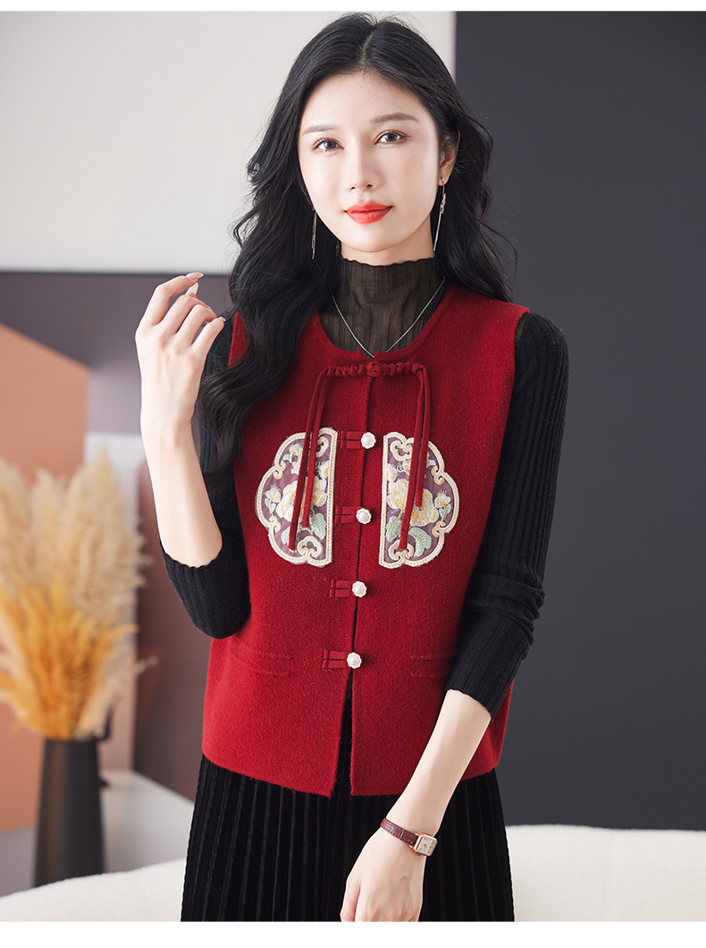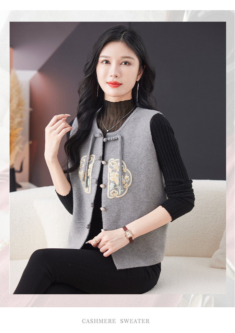 CC-9-6925新中式盘扣刺绣针织马甲开衫女春秋短款宽松无袖外穿毛衣外套上衣