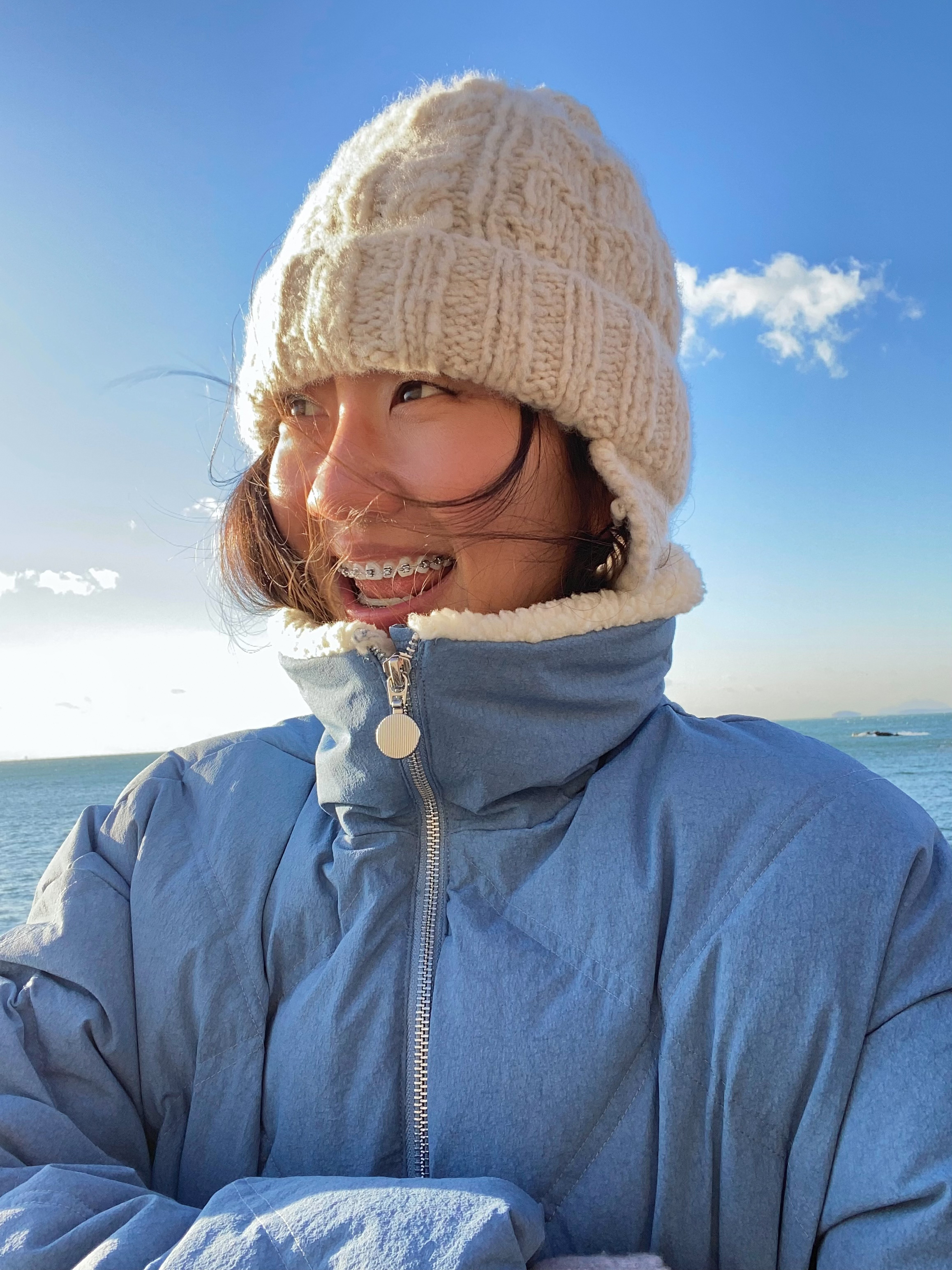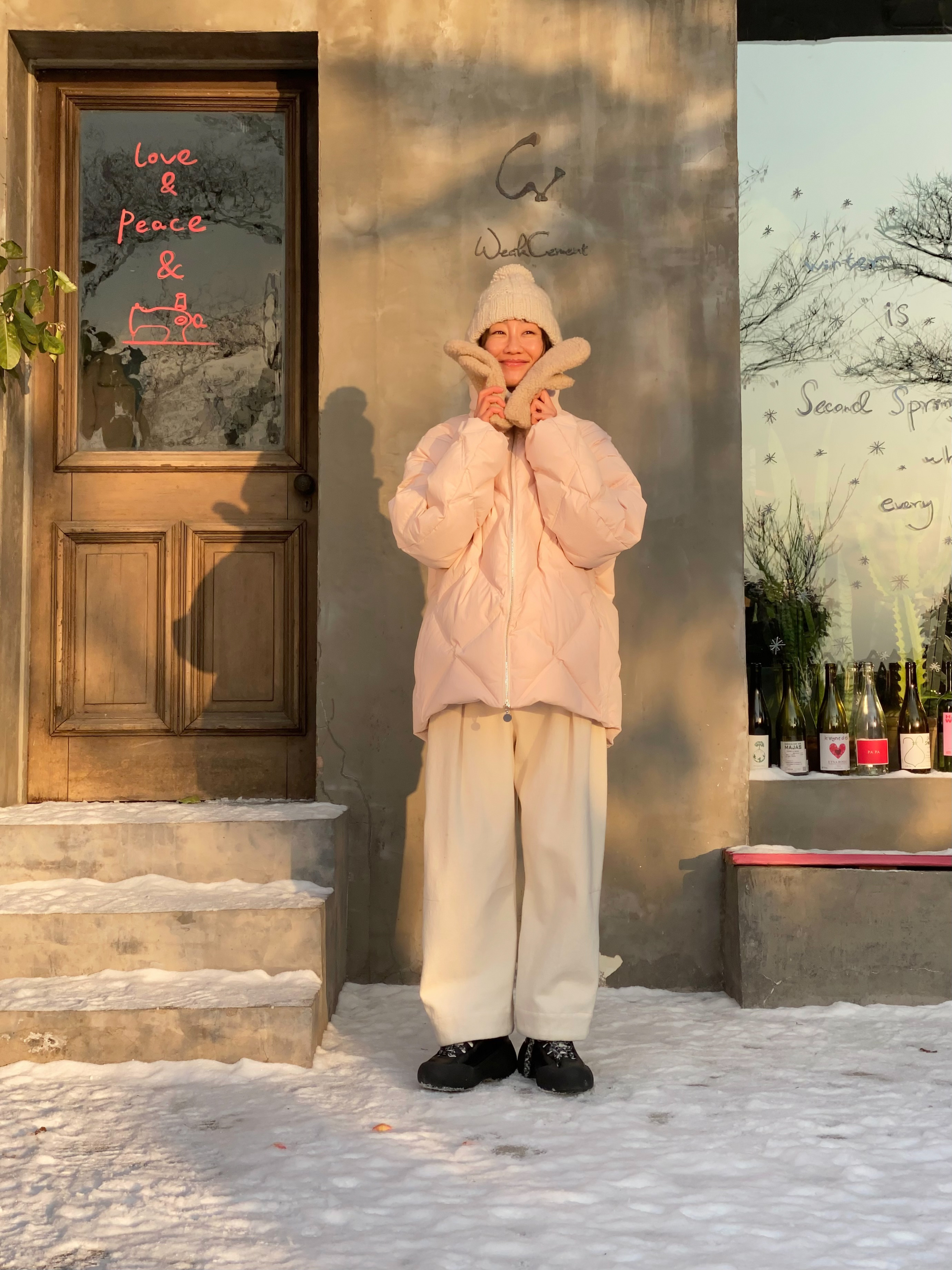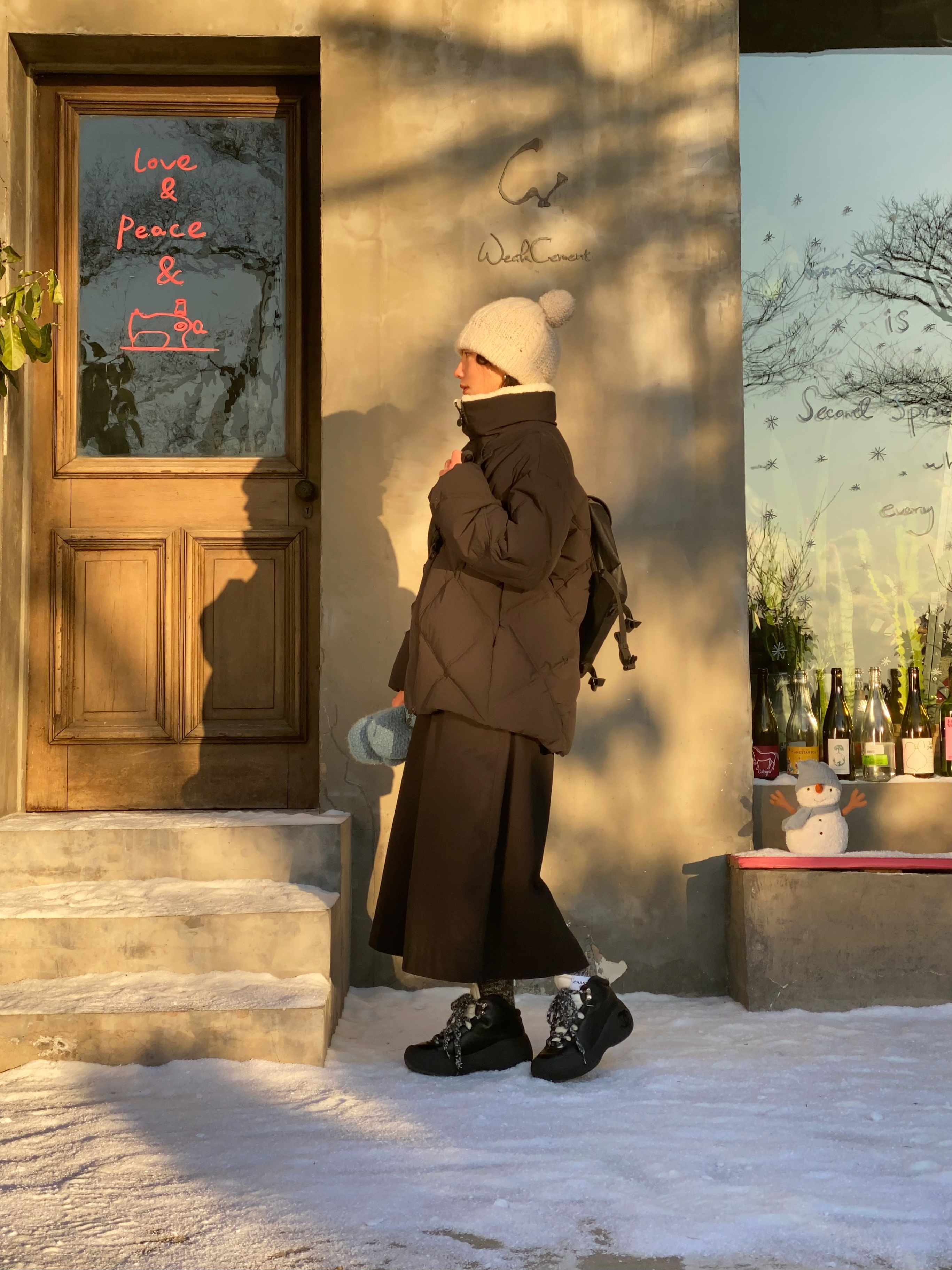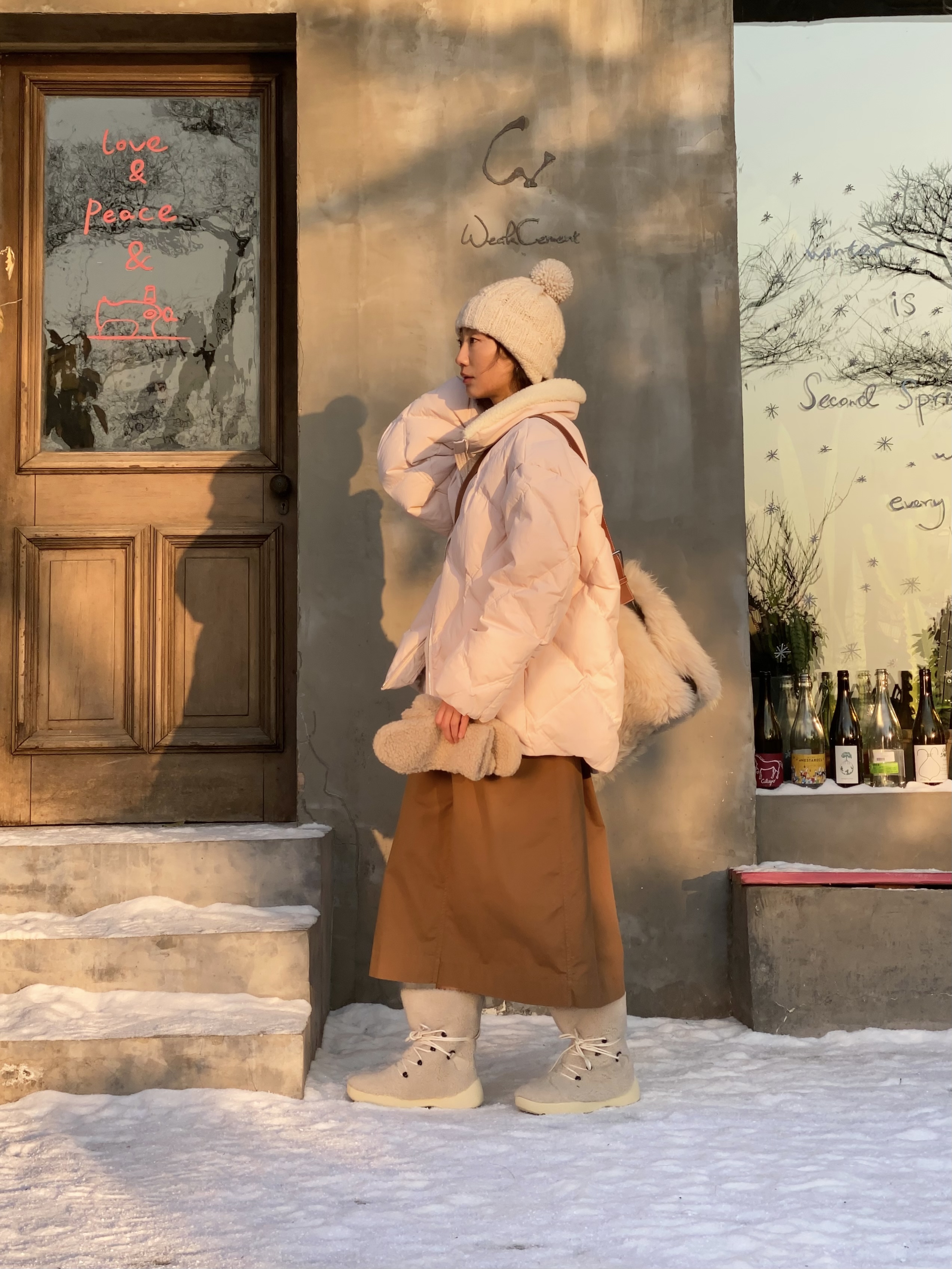 如果天气不太冷,请一定要尝试一下把护耳塞进去的带法,两侧会有垫宽头骨的效果,非常修饰脸型。