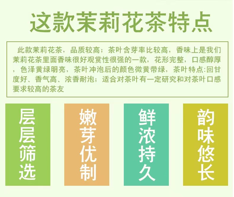 采用头春高山小白茶为底茶,使用伏天茉莉鲜花多次窨制,手工大量炒花,这样做不仅茶的花香味更足,还能让茶味更醇厚,花香与茶味完美融合。